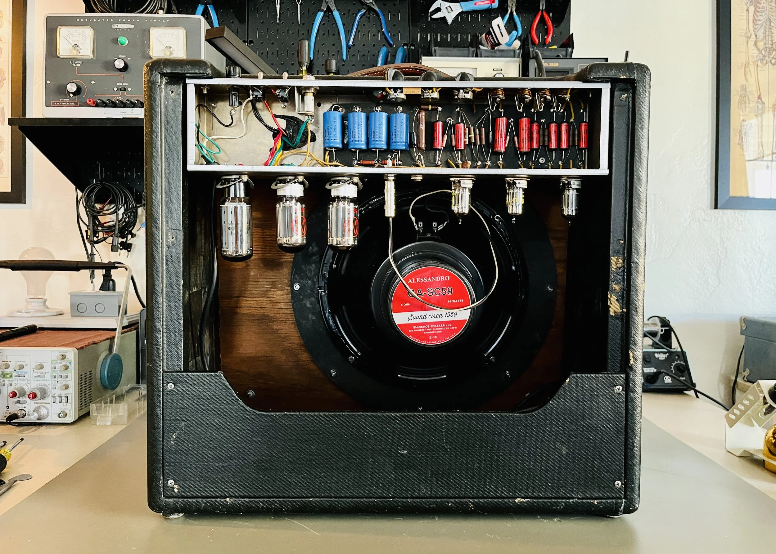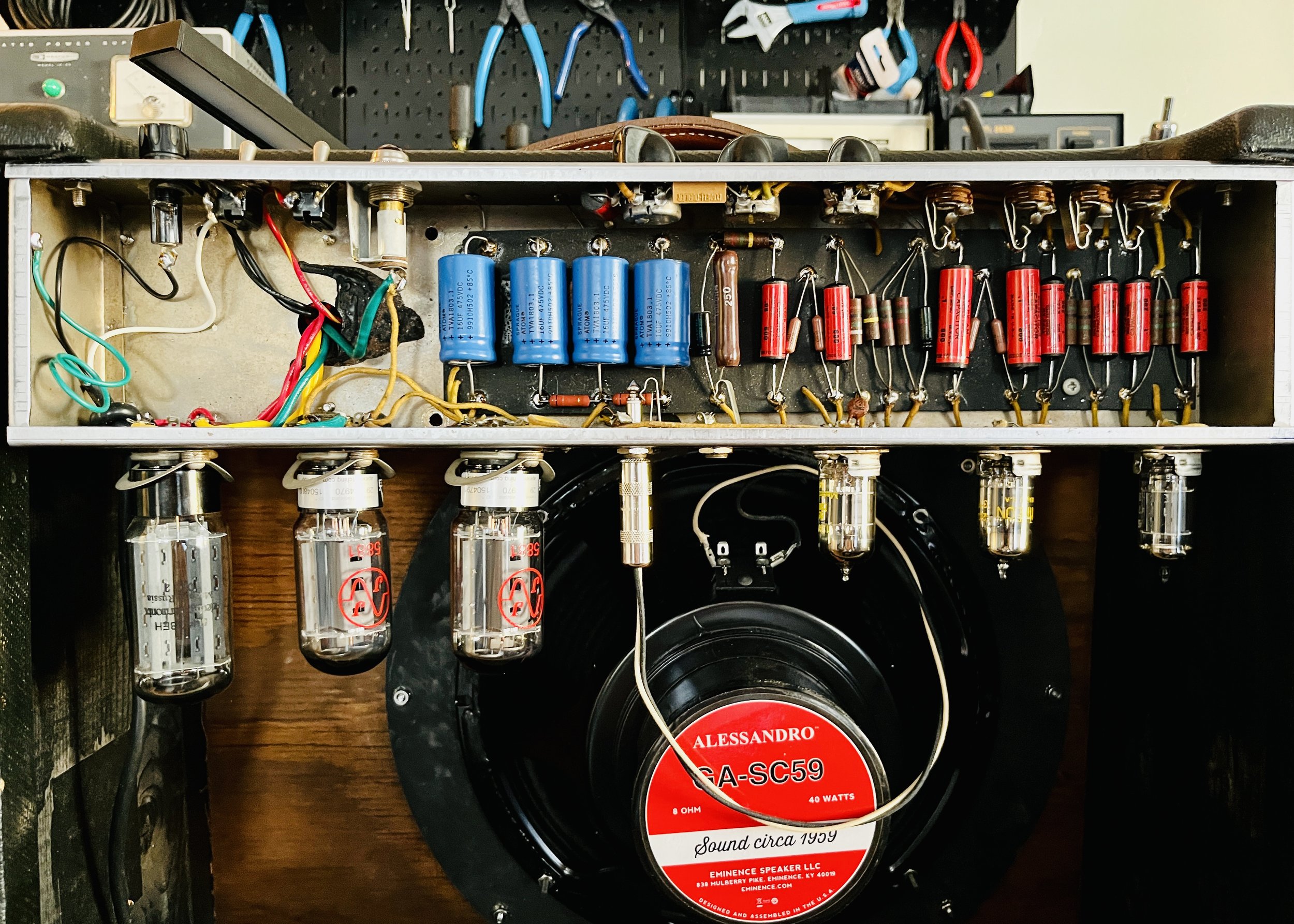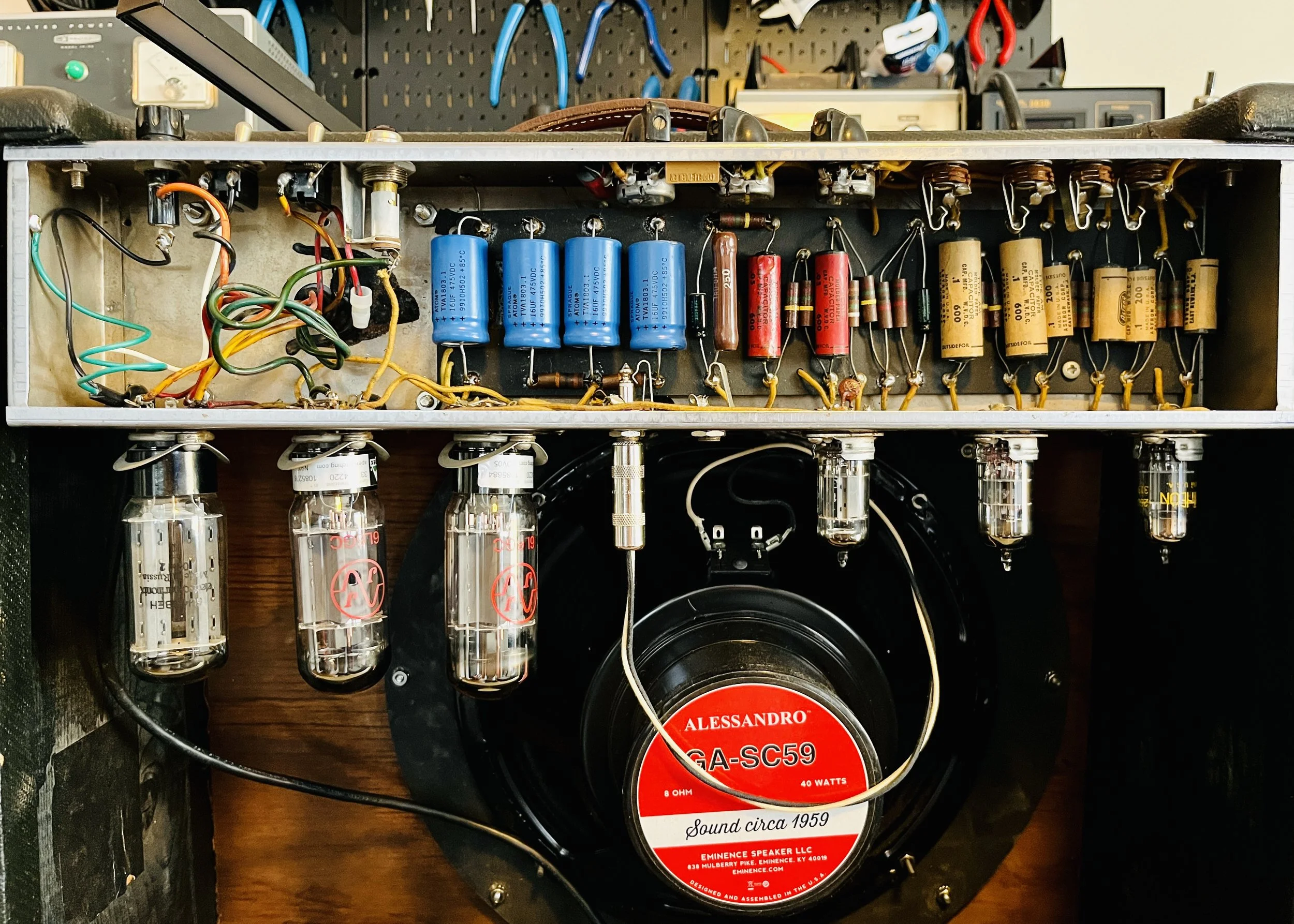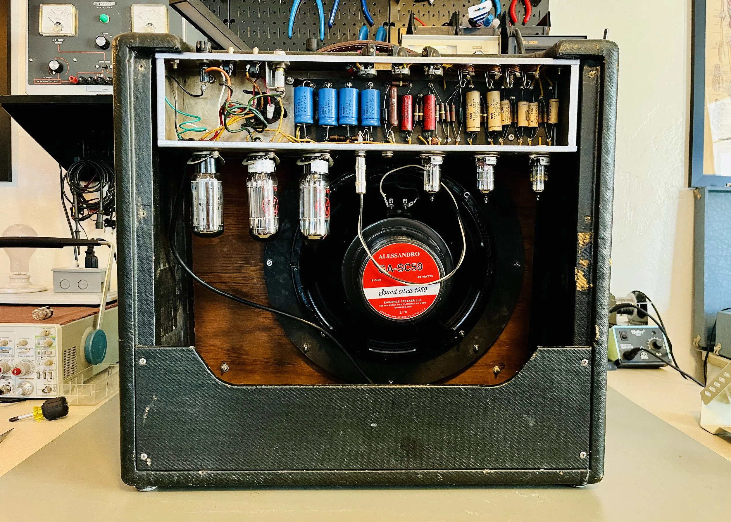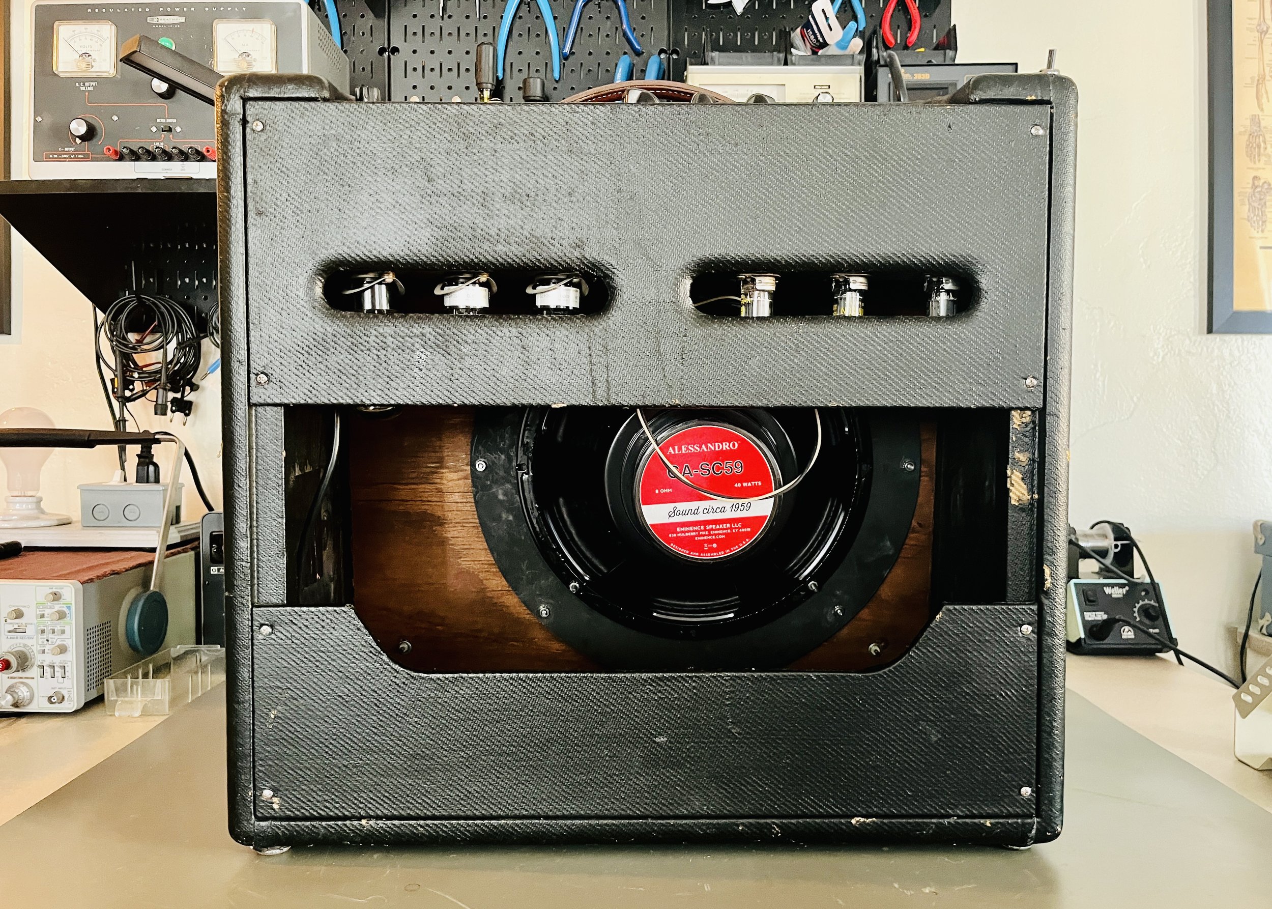 This amp came in to my shop having already been partially restored from a previous repair years earlier. The competency of the older restoration, which was a basic electrolytic cap job, was quite decent, using good parts quality and technique. However, there were a few major issues left unaddressed, including some preventative maintenance. This one needed a cap job for all coupling units, new power/plate resistors, a new power transformer, cleaning, and new tubes. The amp already had a speaker swap done, using a baffle converter to put a 12” Eminence GA-SC69 Alnico in place of the original 15” unit. This was done well and kept in place per customer request. Somewhere in history the cab was painted black and the grill cloth was given some artistic flair. Usually I’m not the biggest fan of painting tweed cabs, but this one actually looks pretty cool, and the paint was done better than any other I’ve seen.