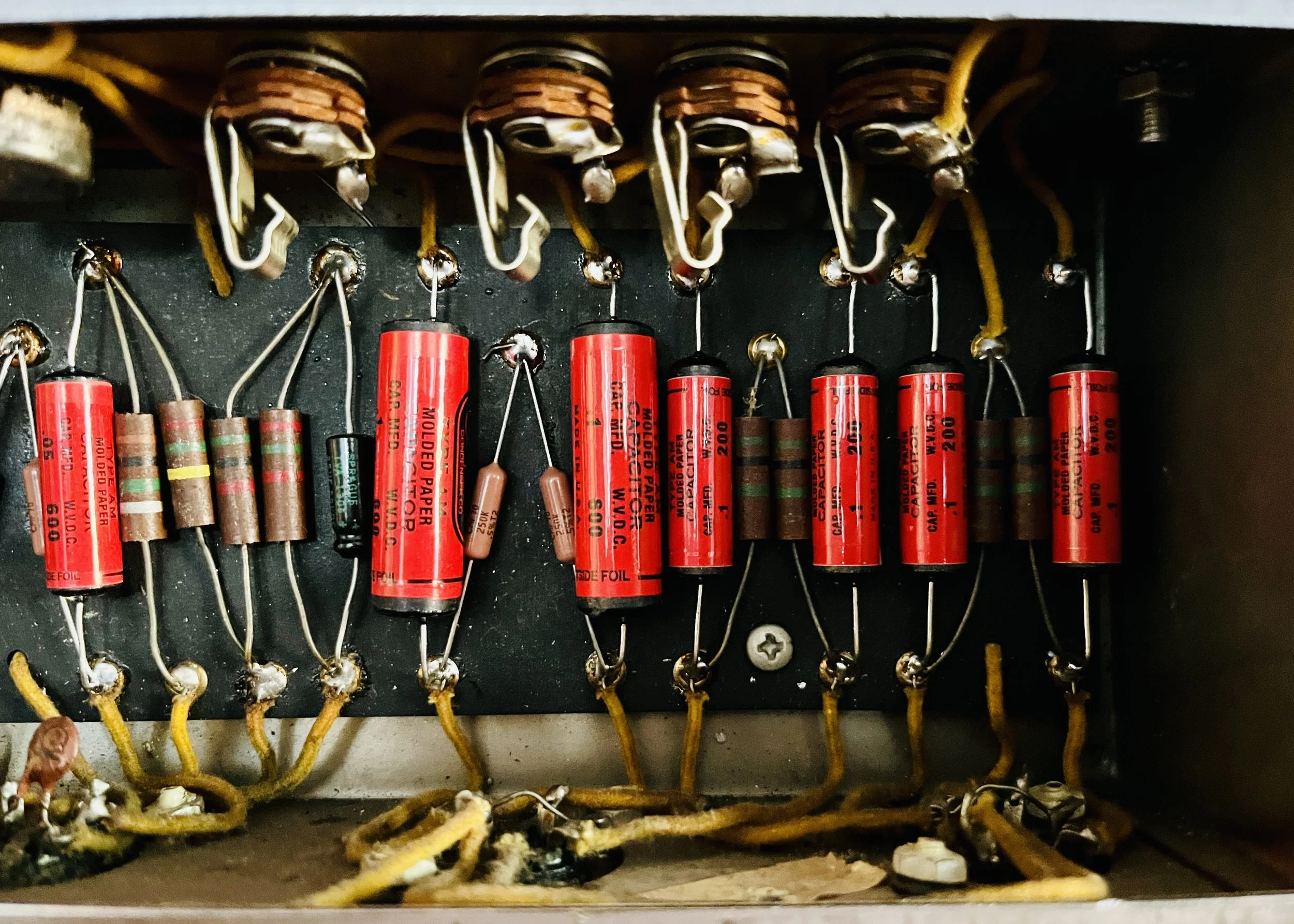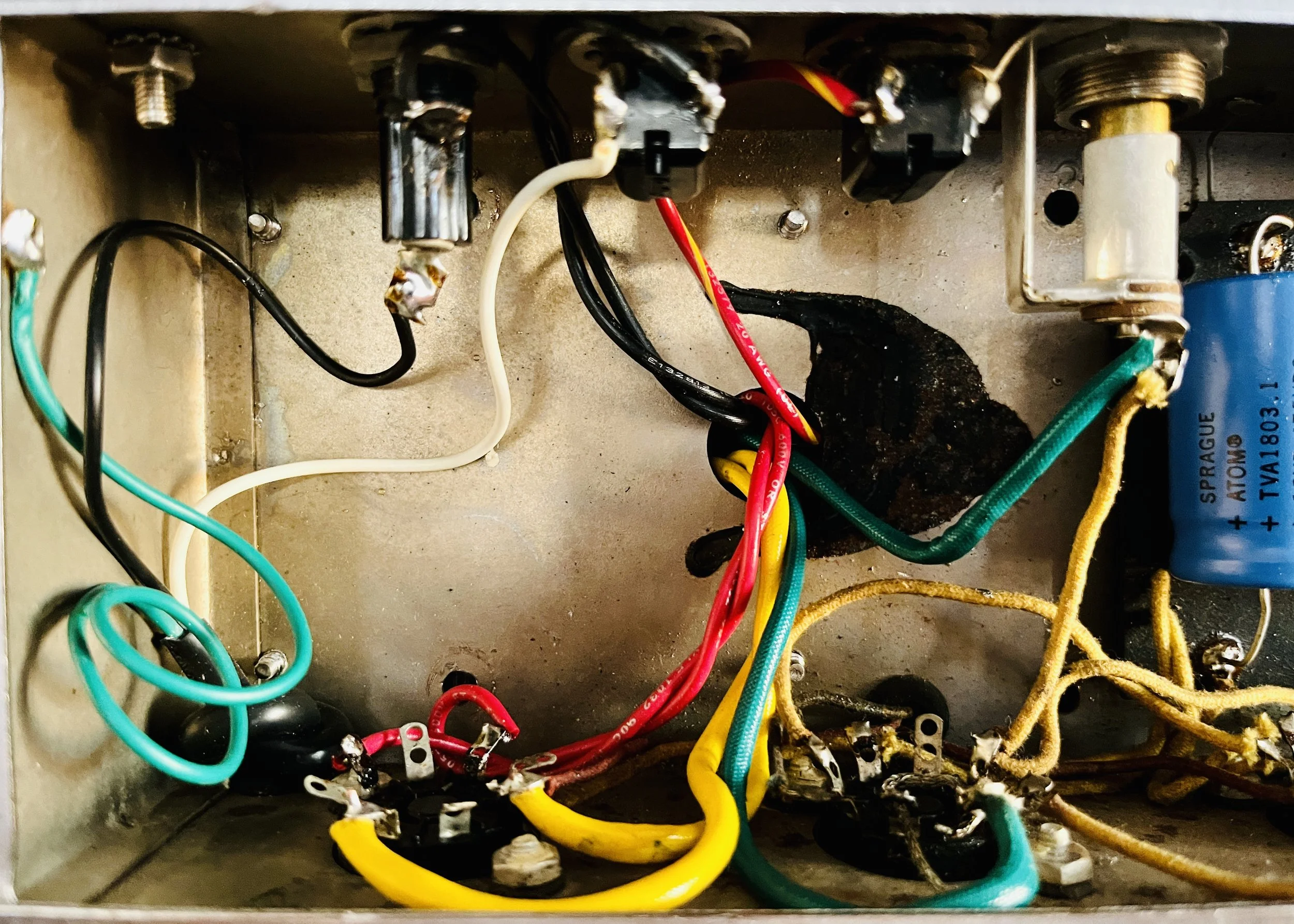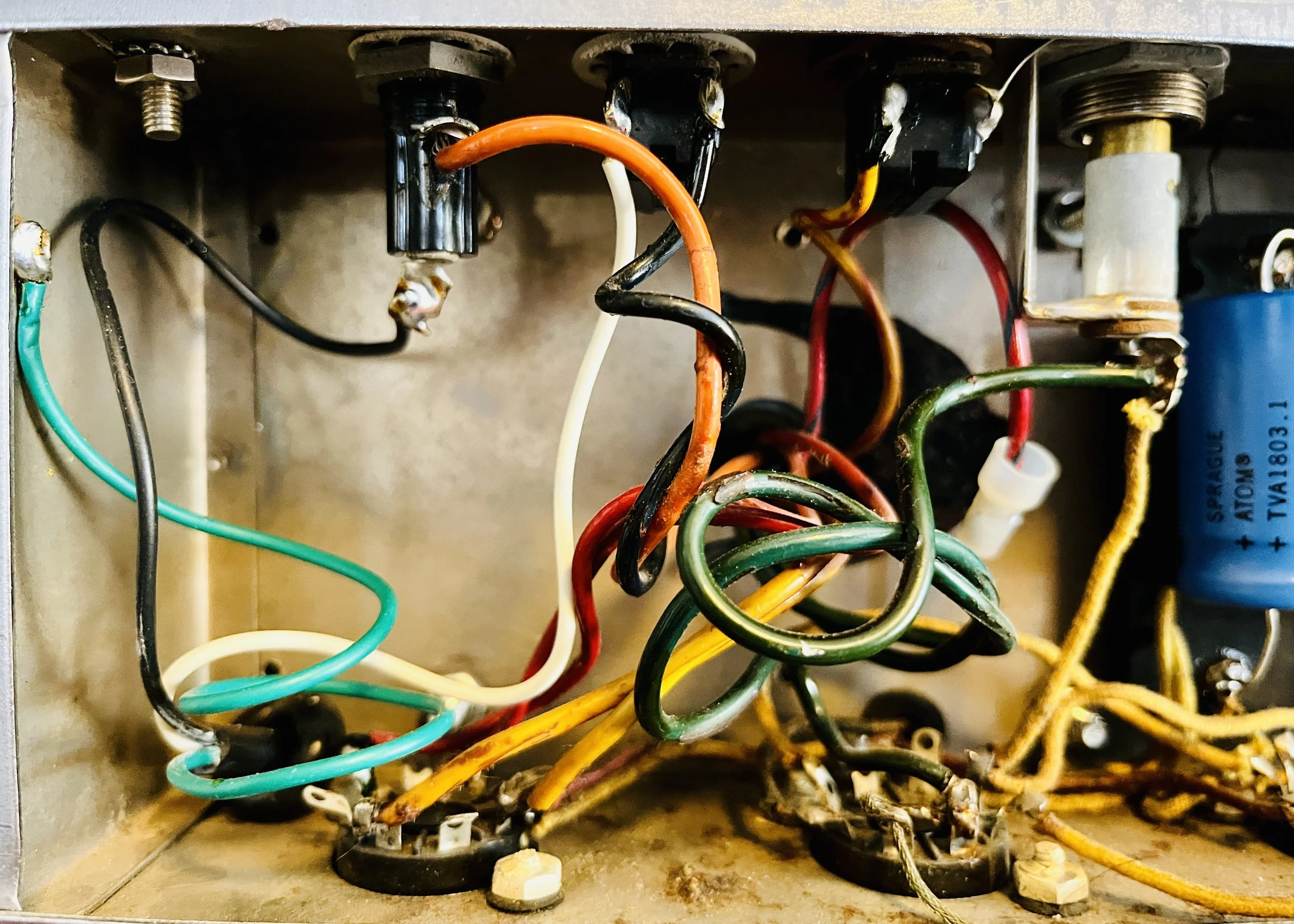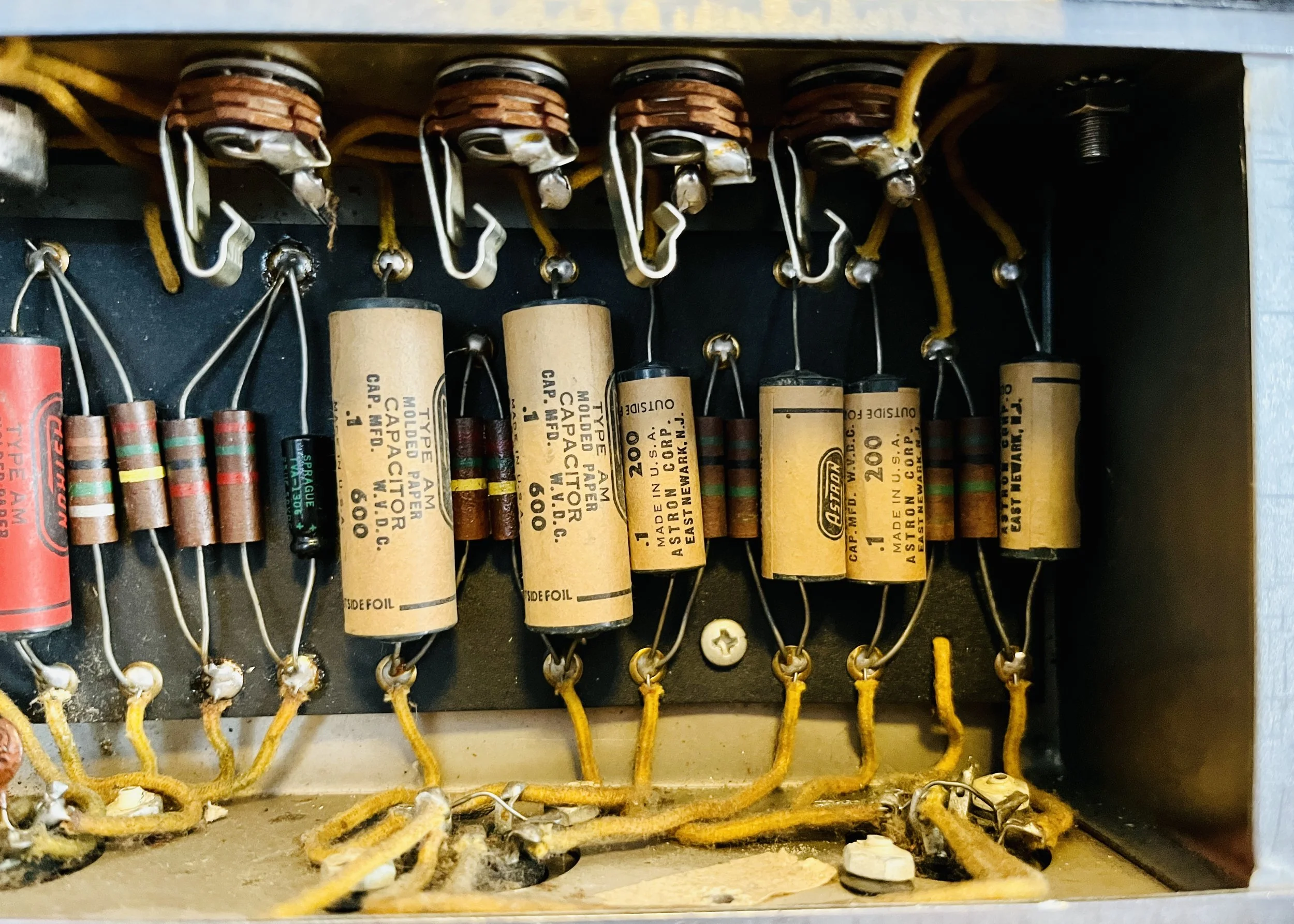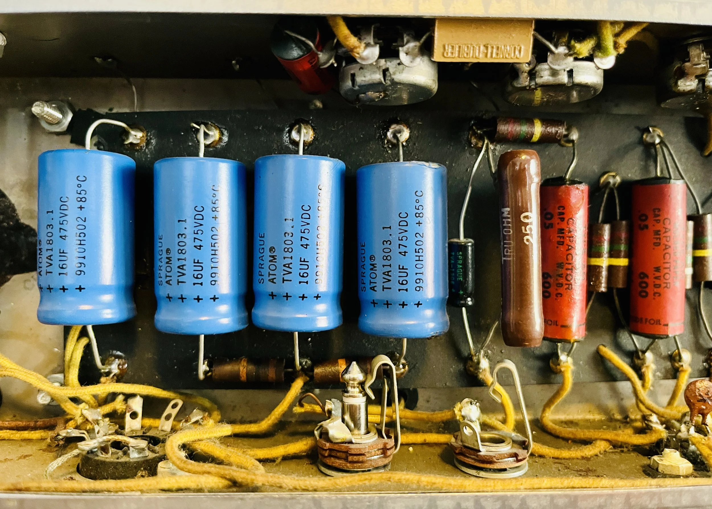 Amp was completely restored with the highest quality parts possible. All coupling caps were replaced with (Handmade in the USA) Jupiter Red Astron Tin Foil units to replace the original leaky and decades old out of spec caps present since 1954. These caps are exact reproductions of 1950's Red Astron brand units originally put in Tweed Fender's. The outside foil markings of the Jupiter’s were all aligned to the correct junctions of the circuit - which are the ones that present the lowest impedance. This is a very old-school technique that helps prevent noise and is almost unheard of today. Most modern signal caps do not even have Outside Foil markings. New 3 Watt Metal Film power dropping resistors were installed for better reliability and lower noise floor - the original units had heat damage and were out of spec. New 1.75 Watt Metal Film resistors made to Mil-Spec by Dale were used for the hard to find 250K value plate positions. The original plate resistors had drifted up to as much as 340K! The rest of the carbon comp resistors were all tested and found to be within spec (or close enough), they were kept in place along with the tone control coupling cap to preserve the unique vintage tone of the amp. When restoring an amp like this it’s an important thing to not sterilize the tone of the amp with all new parts, certain parts that are not in critical or dangerous circuit positions can be retained to preserve the “drift” that occurs over time and is impossible to replicate otherwise.