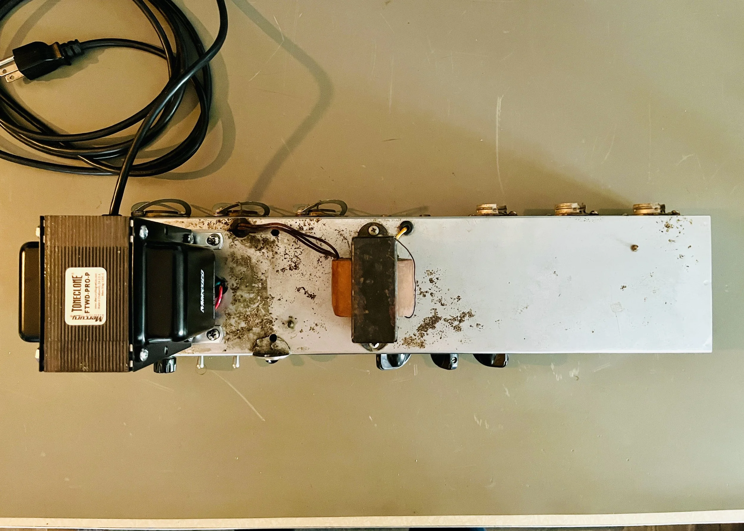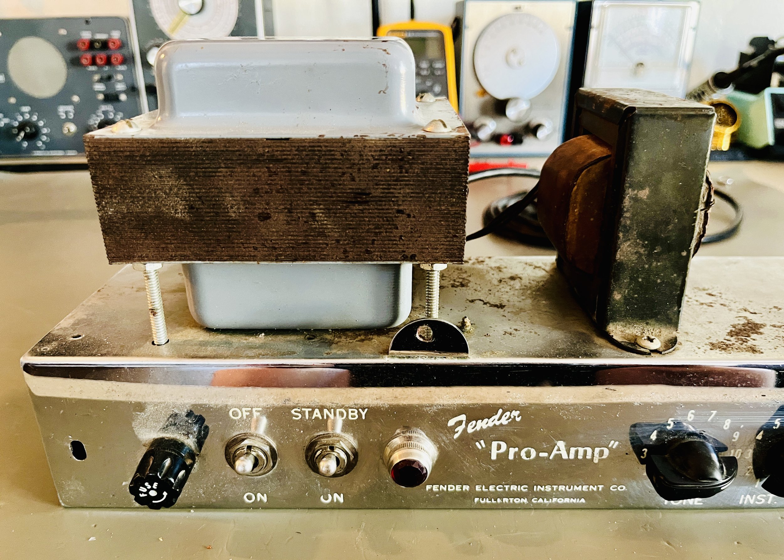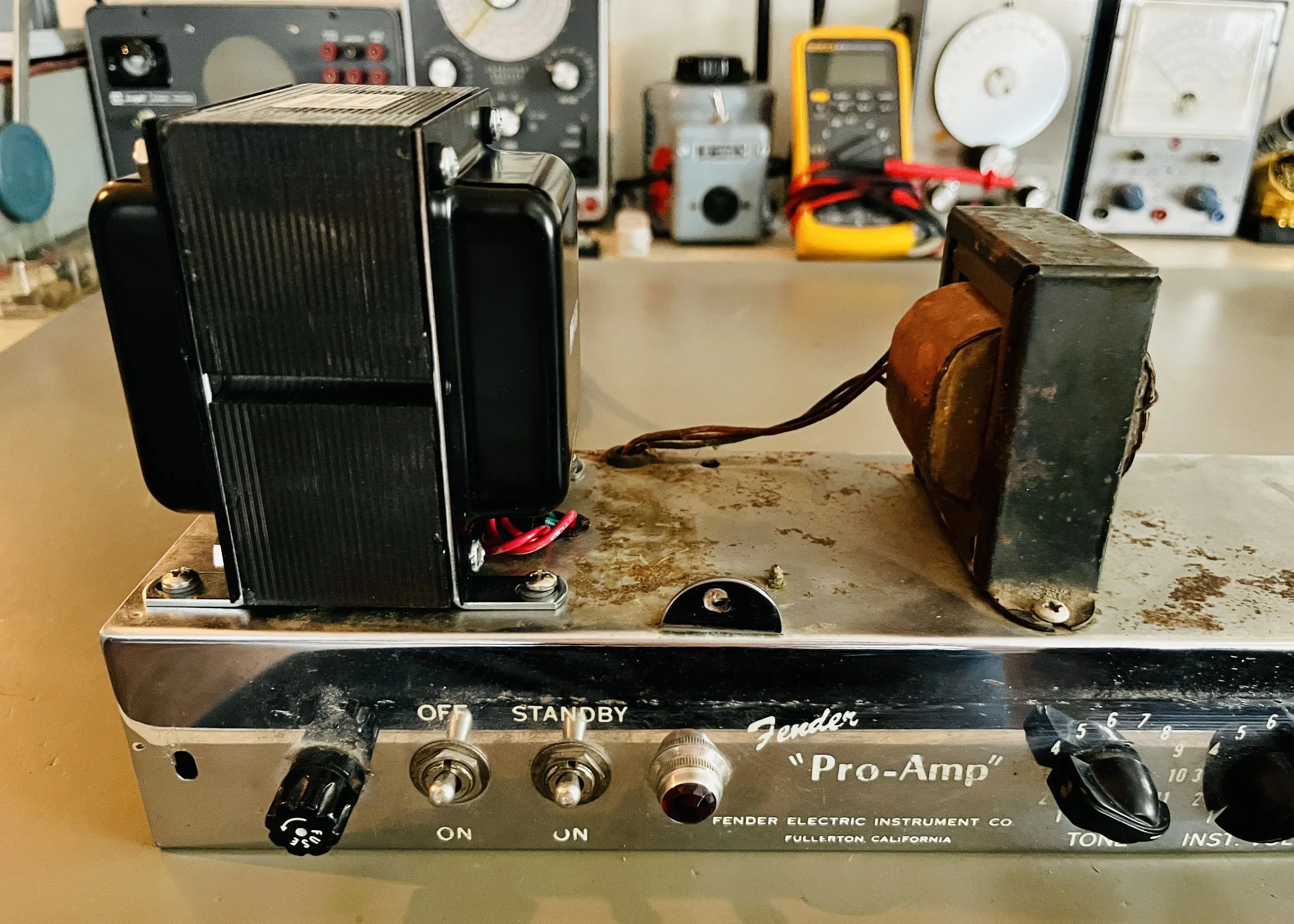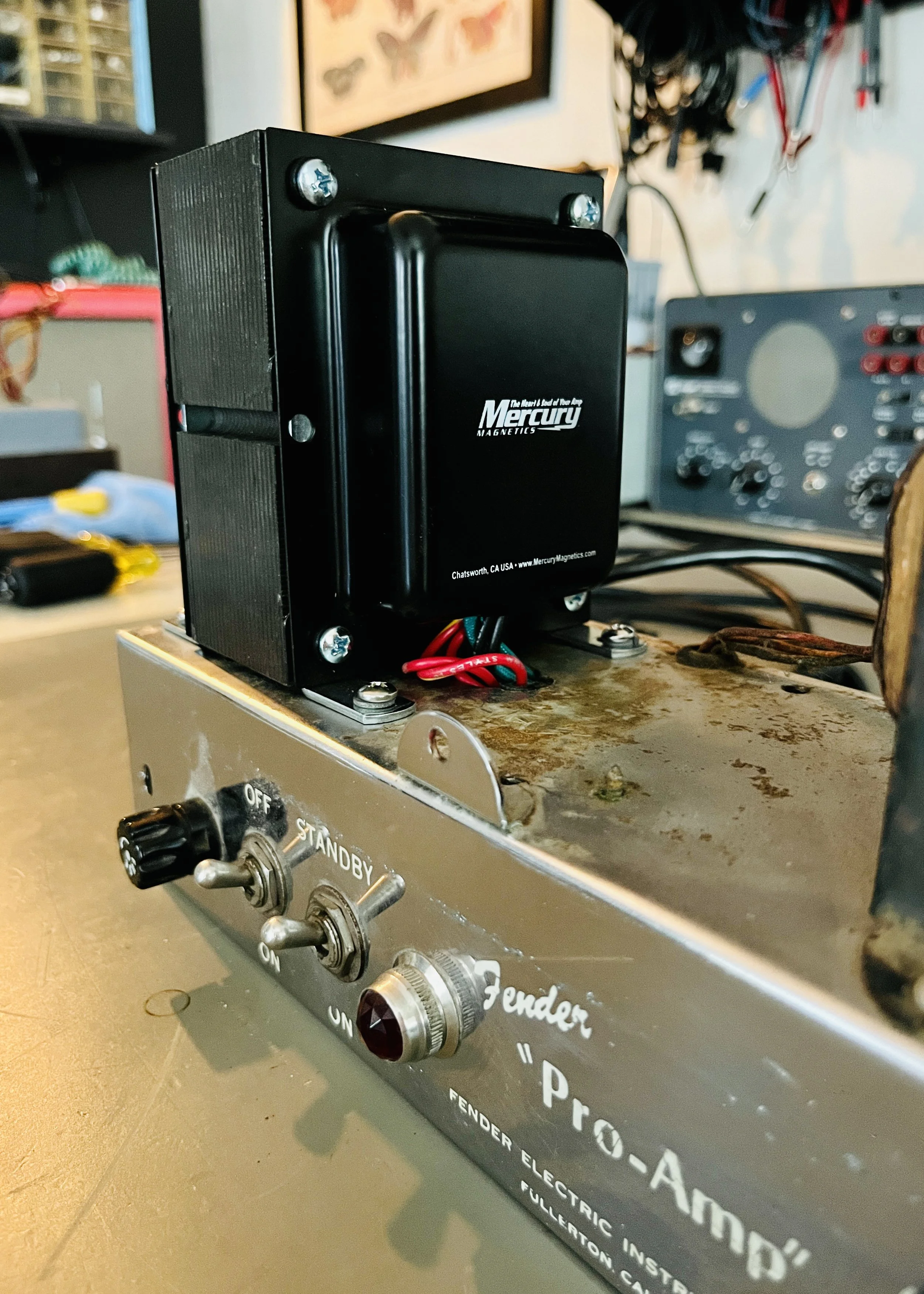 A new American made Mercury Magnetics FTWD-PRO-P Power Transformer was installed - this is the correct type of PT for this amp and is an authentic reproduction of an early 1950's Fender Pro #6516 transformer. The one previously in place was from an unknown tube amp (most likely made in the 1960's) and did not have the correct power/current ratings or secondary HT voltages. The thing heated up so hot if felt like a space heater, not a good sign in a PT. Also it's physical format was completely wrong being the lay-down horizontal type - the new PT is the correct stand-up vertical orientation, it puts out the right voltages, and stays cool under stress. Along with Hammond, Mercury Magnetics makes the finest reproductions of vintage iron.