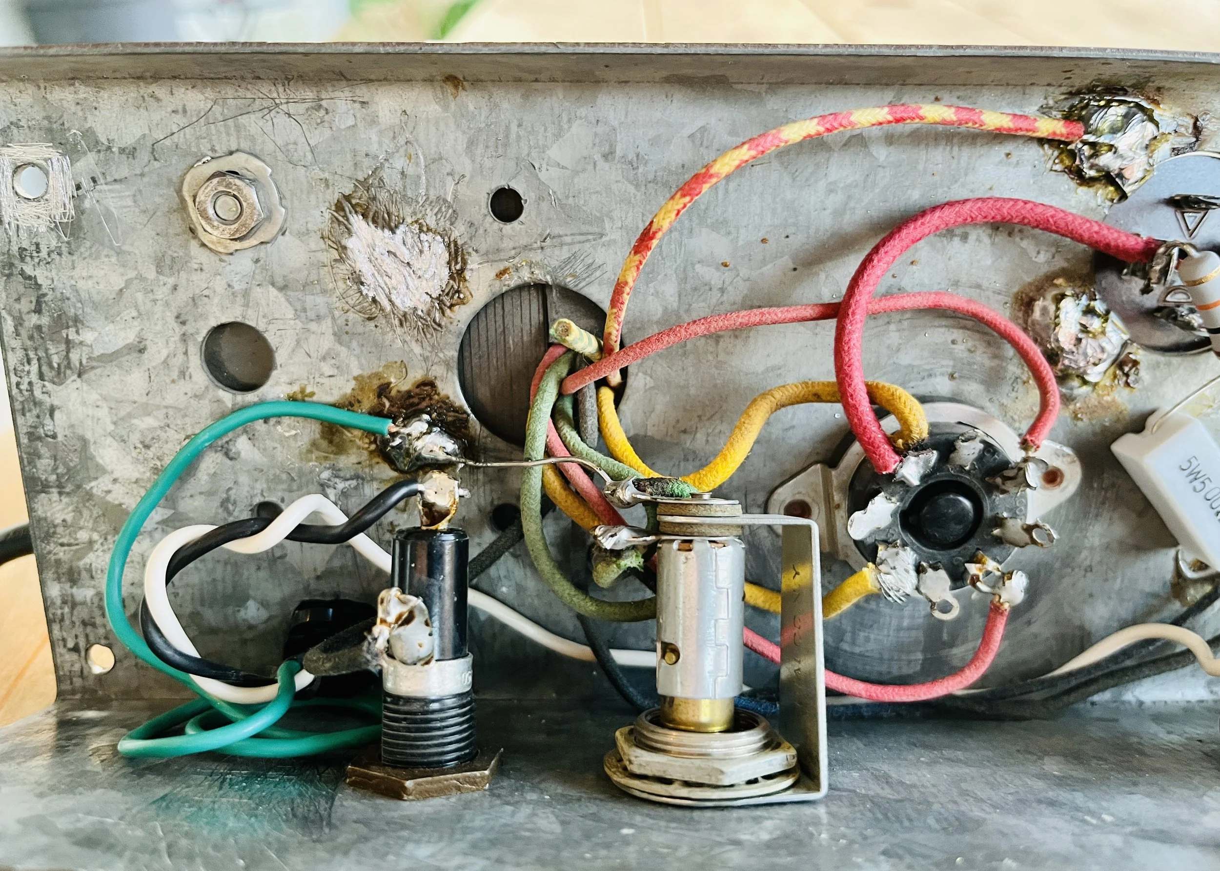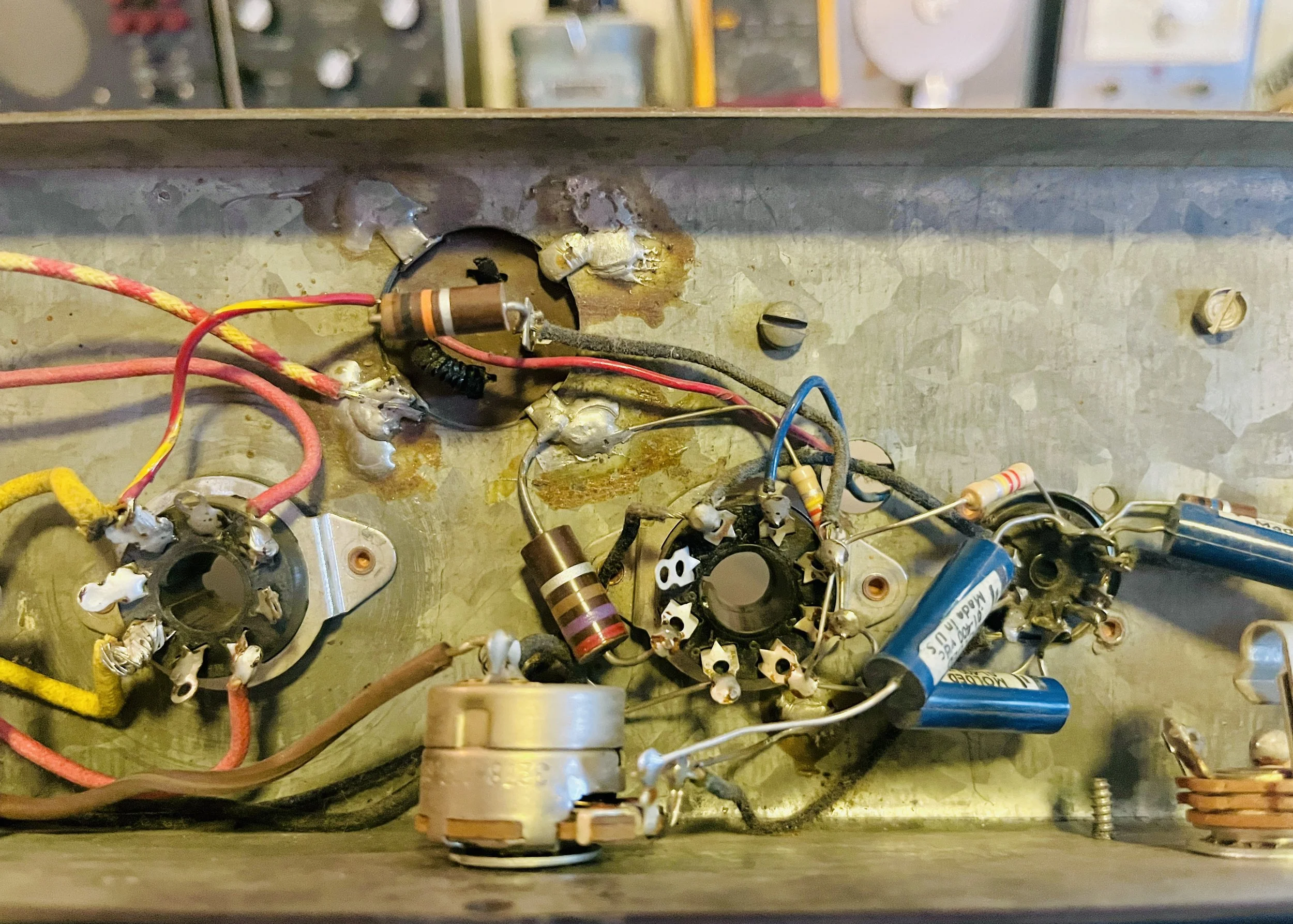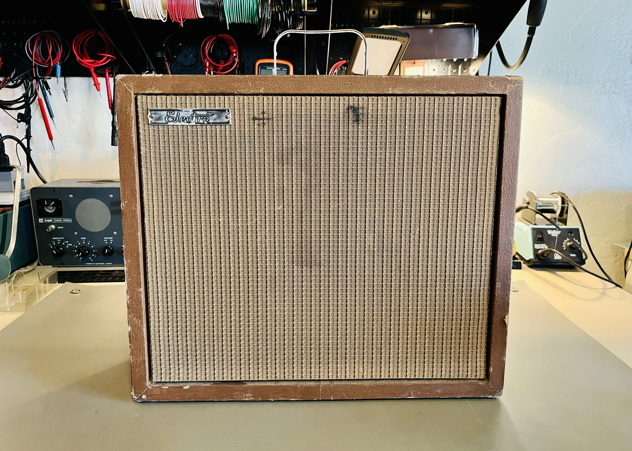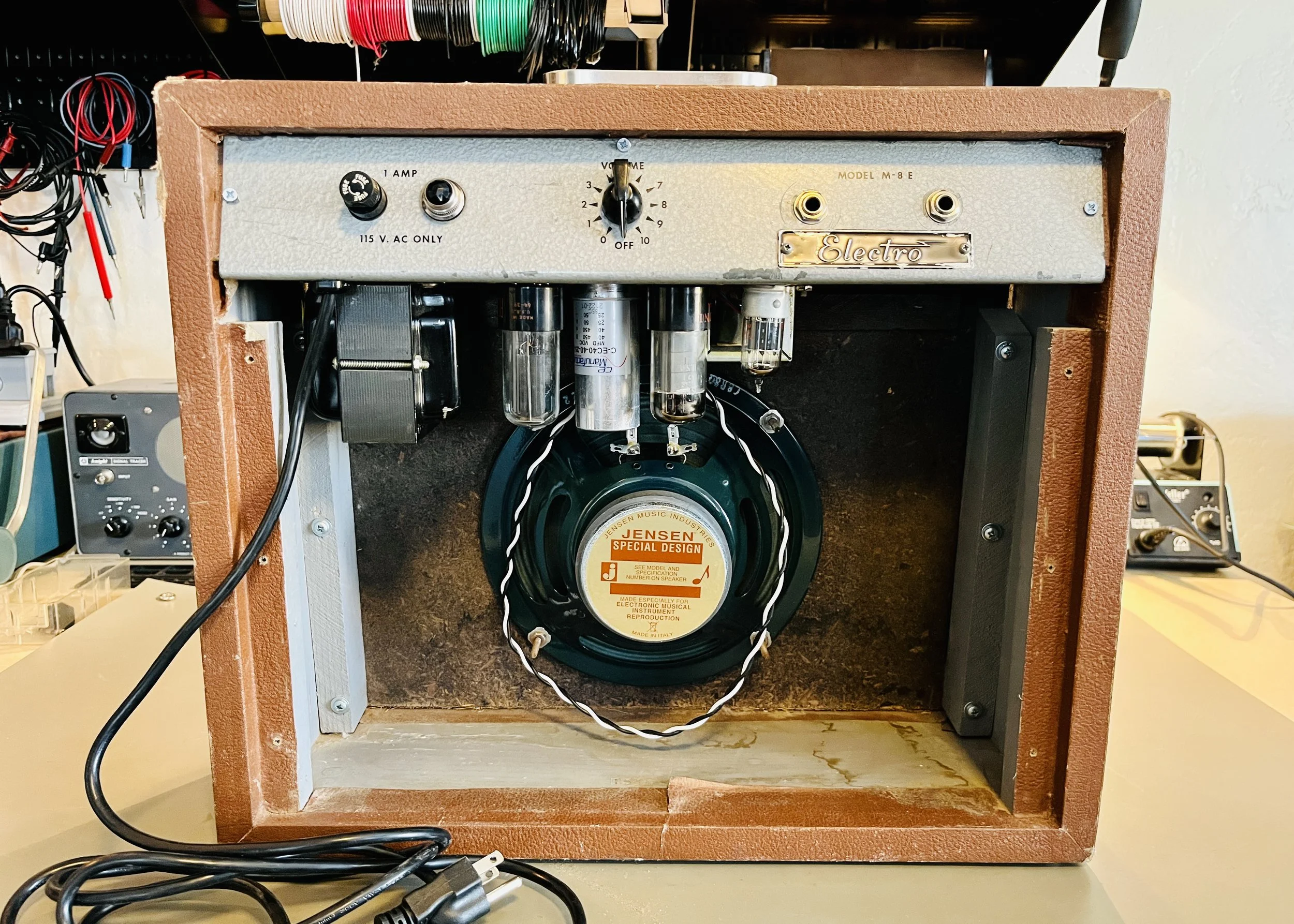 This amp was DOA, with a blown filter cap can, blown speaker, and wrong power tube type installed. It was also missing almost every screw and washer - even on the baffle board. This guy needed everything that could be done in a restoration. The cap can was replaced with a new vintage spec CE brand multi-section 40uf/40uf @ 450V, 25uf/25uf @ 50v type unit. All new chassis screws/nuts, back panel screws and baffle board screws were installed. A new Jensen C8R 25 Watt 8” Speaker was installed to bring new life to the cab. The original speaker could not produce any notes above the 12th Fret and sounded like garbage - literally. I also put a couple of mods into the circuit to help bring a bit more gain and fuller/brighter frequency response to the amp. The 6V6GT was bypassed with one of the 25uf 50V sections of the cap can (full range frequency response/higher gain), and the V1b cathode was bypassed with a 1uf 50V film cap (treble/upper mid boost). The volume control had a 500pf 500v Silver Mica treble bleed cap added to increase brightness, especially at lower volume levels. They really brought the amp to an elevated level of tone that wasn’t there to begin with.