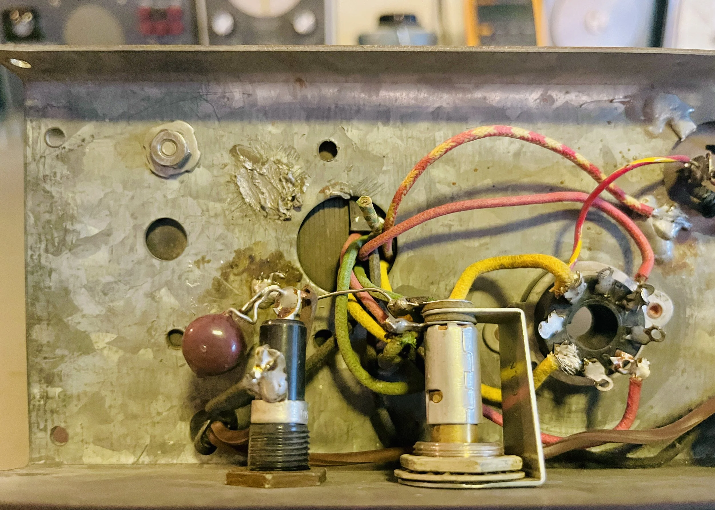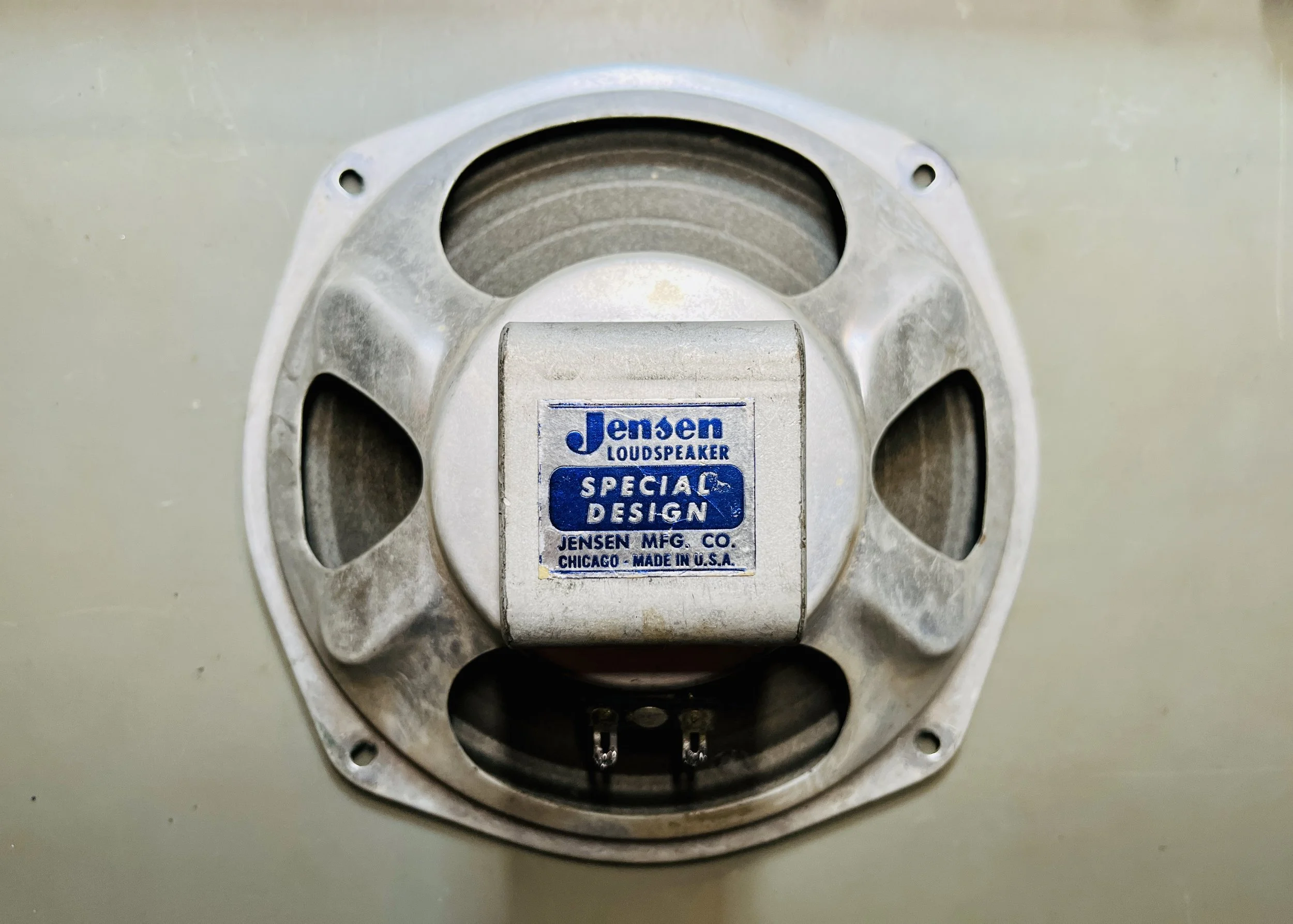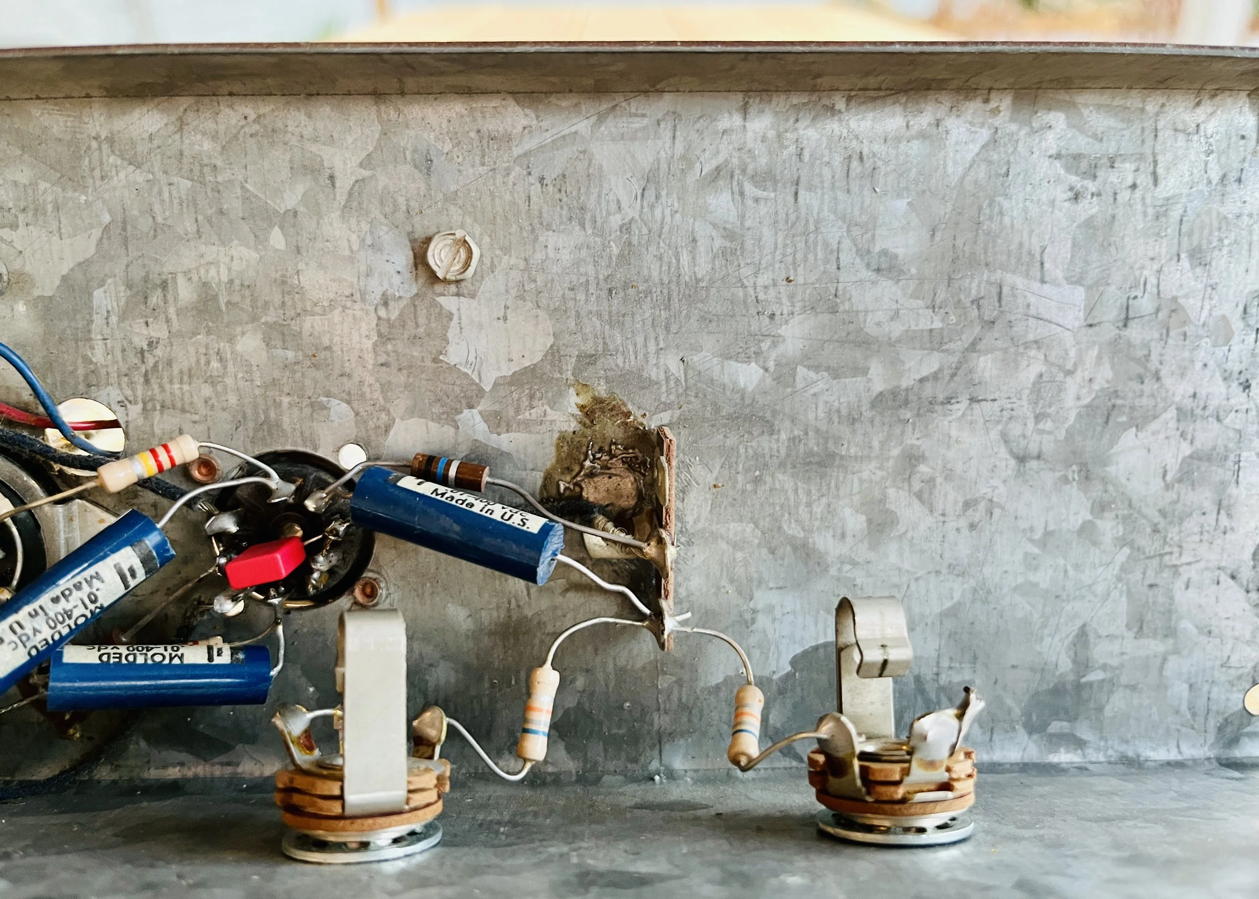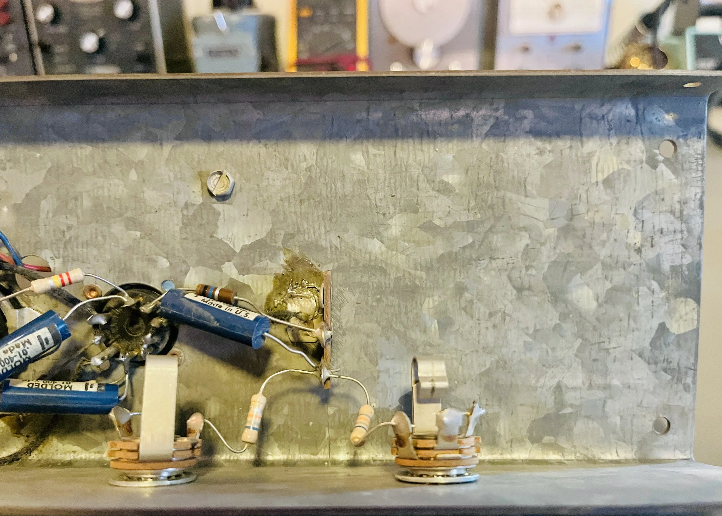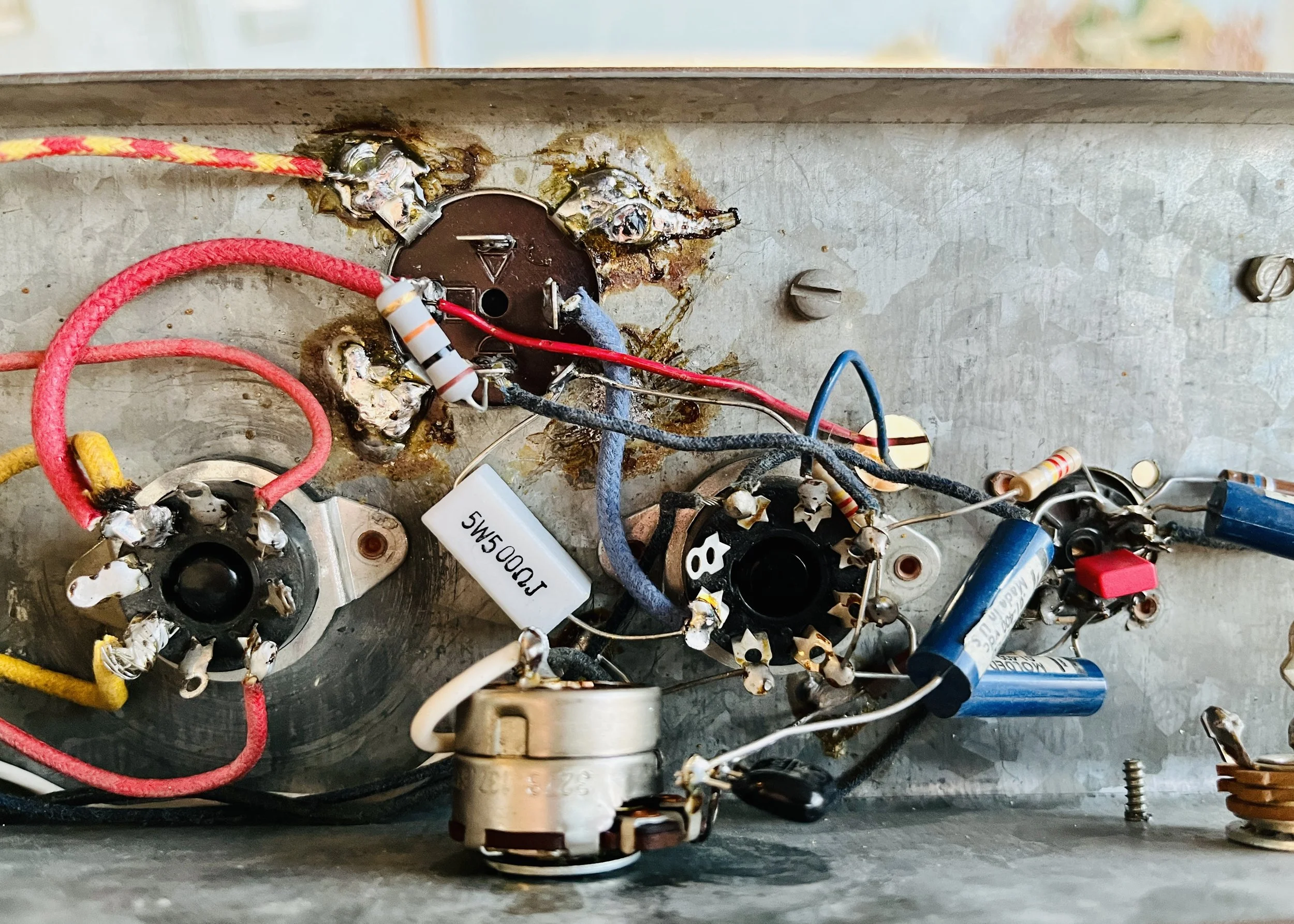 This amp was DOA, with a blown filter cap can, blown speaker, and wrong power tube type installed. It was also missing almost every screw and washer - even on the baffle board. This guy needed everything that could be done in a restoration. The cap can was replaced with a new vintage spec CE brand multi-section 40uf/40uf @ 450V, 25uf/25uf @ 50v type unit. All new chassis screws/nuts, back panel screws and baffle board screws were installed. A new Jensen C8R 25 Watt 8” Speaker was installed to bring new life to the cab. The original speaker could not produce any notes above the 12th Fret and sounded like garbage - literally. I also put a couple of mods into the circuit to help bring a bit more gain and fuller/brighter frequency response to the amp. The 6V6GT was bypassed with one of the 25uf 50V sections of the cap can (full range frequency response/higher gain), and the V1b cathode was bypassed with a 1uf 50V film cap (treble/upper mid boost). The volume control had a 500pf 500v Silver Mica treble bleed cap added to increase brightness, especially at lower volume levels. They really brought the amp to an elevated level of tone that wasn’t there to begin with.