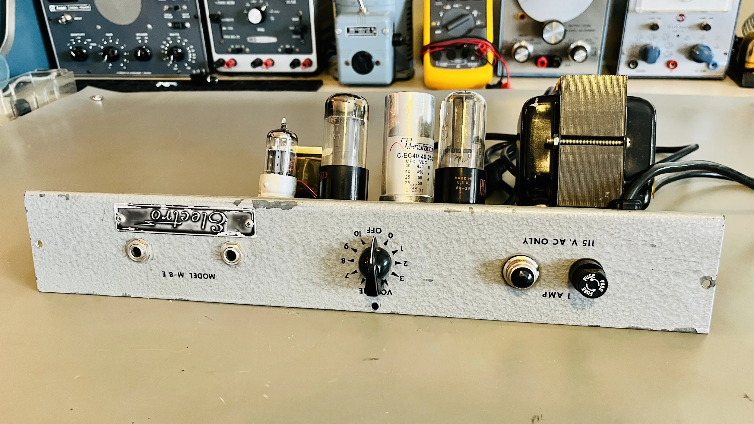 The ELECTRO brand was an offshoot of the much more well known RICKENBACKER company, and this M-8E circuit was released under both brands simultaneously (although with different cosmetics). What we have here is essentially a similar design to the 1950’s Tweed Fender Champ. They are both Class A Single Ended 5 Watt circuits with a tube lineup consisting of: V1 = 12AX7 (Preamp), V2 = 6V6GT (Power Amp), V3 = 5Y3 (Rectifier). Both of them also lack any tone controls, have a single volume knob, and have a small cabinet with one 8” Jensen Speaker. Earlier M-8’s have the more unusual 6AV6 in V1 instead. The ELECTRO circuit does have some noticeable differences from the Champ, including the absence of: any Cathode Bypass capacitors, treble bleed capacitors, or negative feedback. It’s a perfect amp for Garage Rock Revival, Blues, Roots, or Rock. It’s especially suited to the recording studio due to its small size and reasonable volume levels.