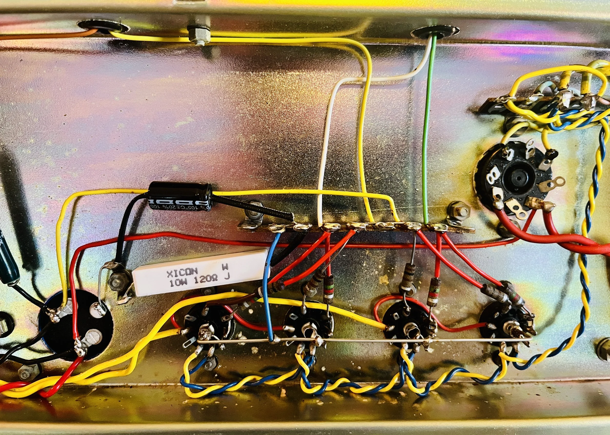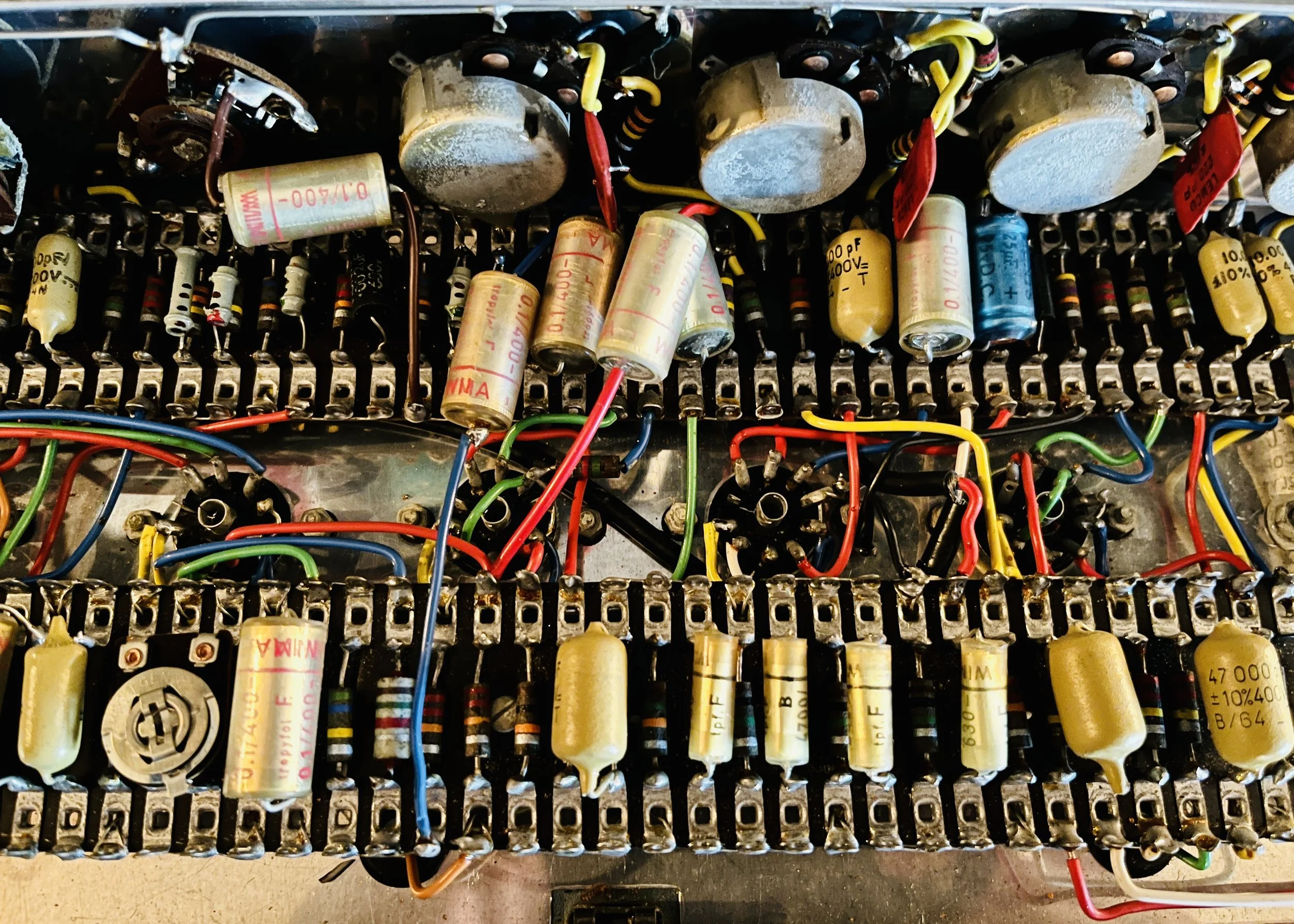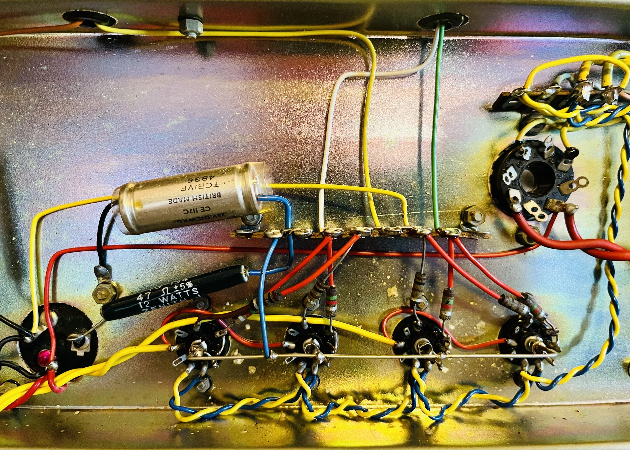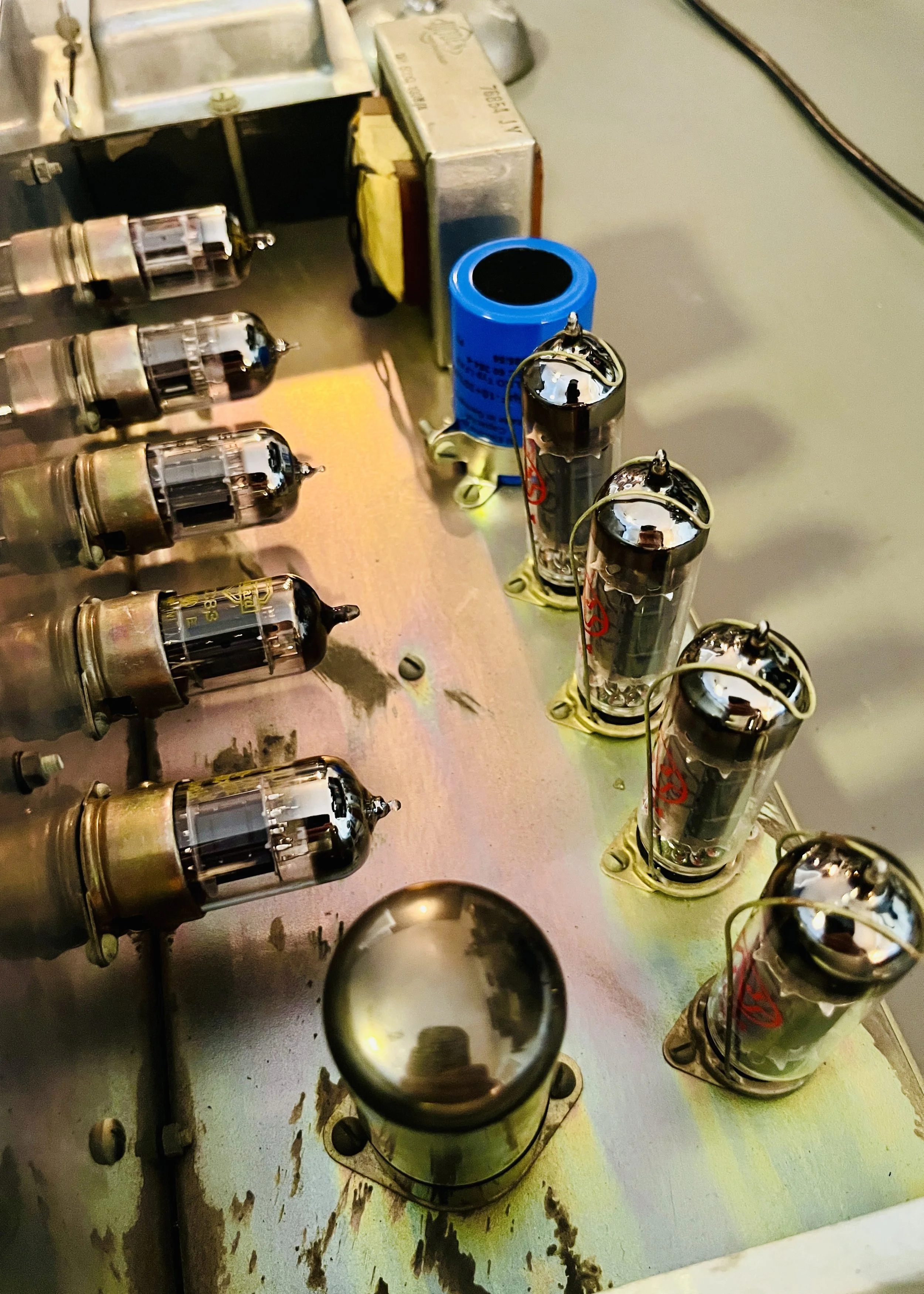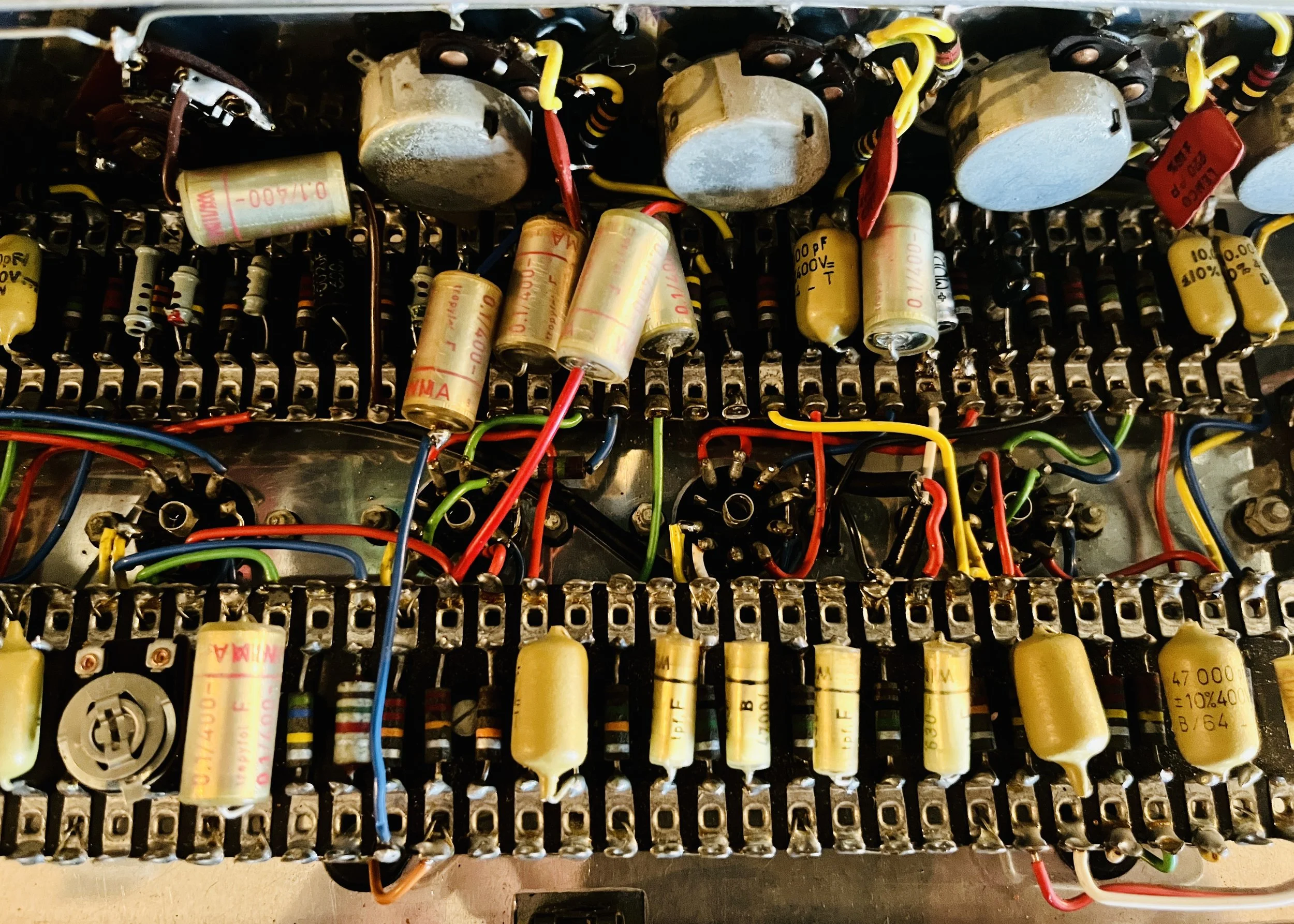 This one came in completely original condition - nothing had been worked on. All filter/bias/bypass caps were replaced with upgraded voltage and temperature rated MOD and F&T brand electrolytic’s (including both cap cans). Two plate load resistors were replaced with vintage spec new production 1/2 watt carbon comp type as the originals had drifted high in value. Many solder joints were re-flowed for reliability and bad connection issues. All pots were cleaned out and lubricated.