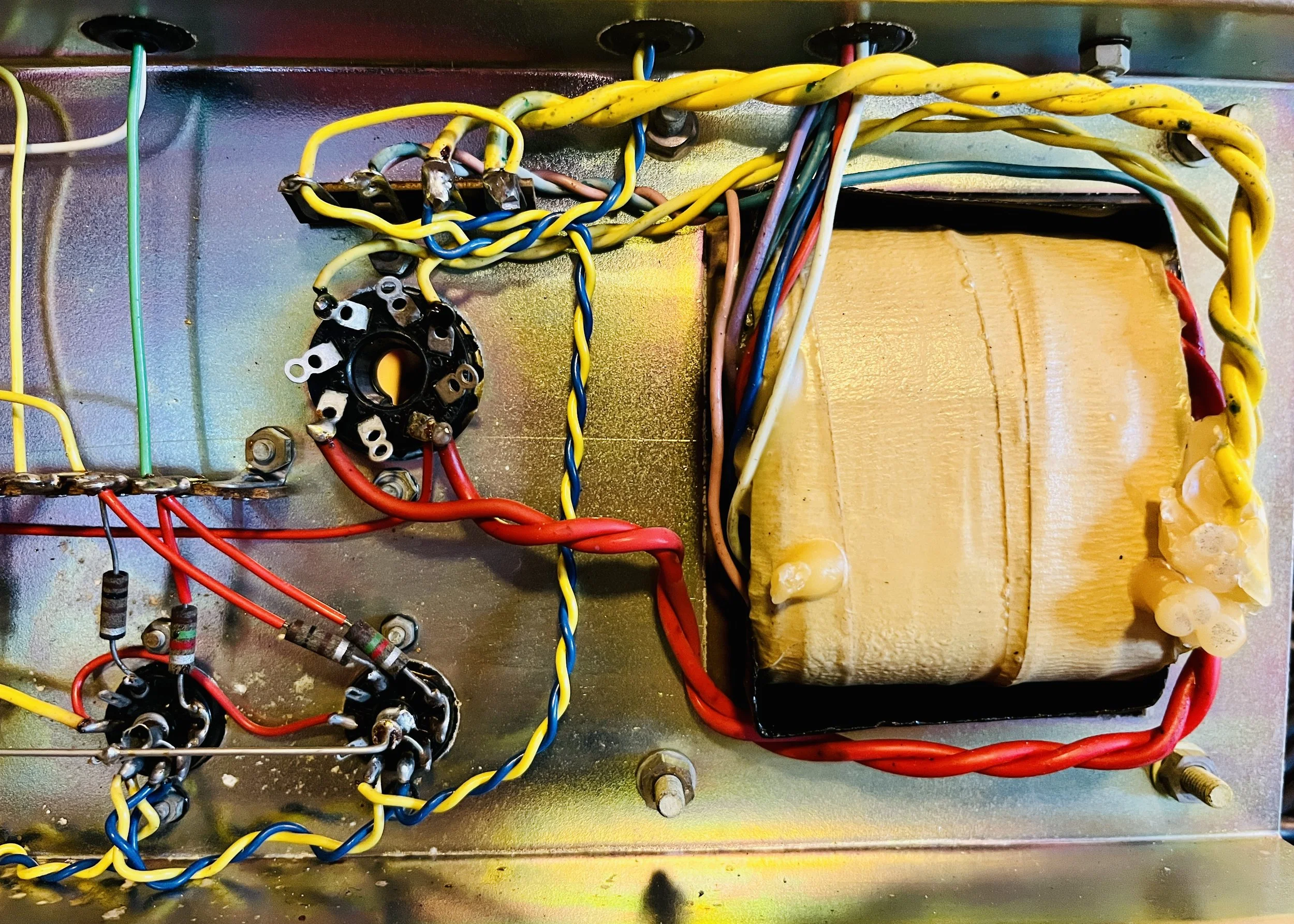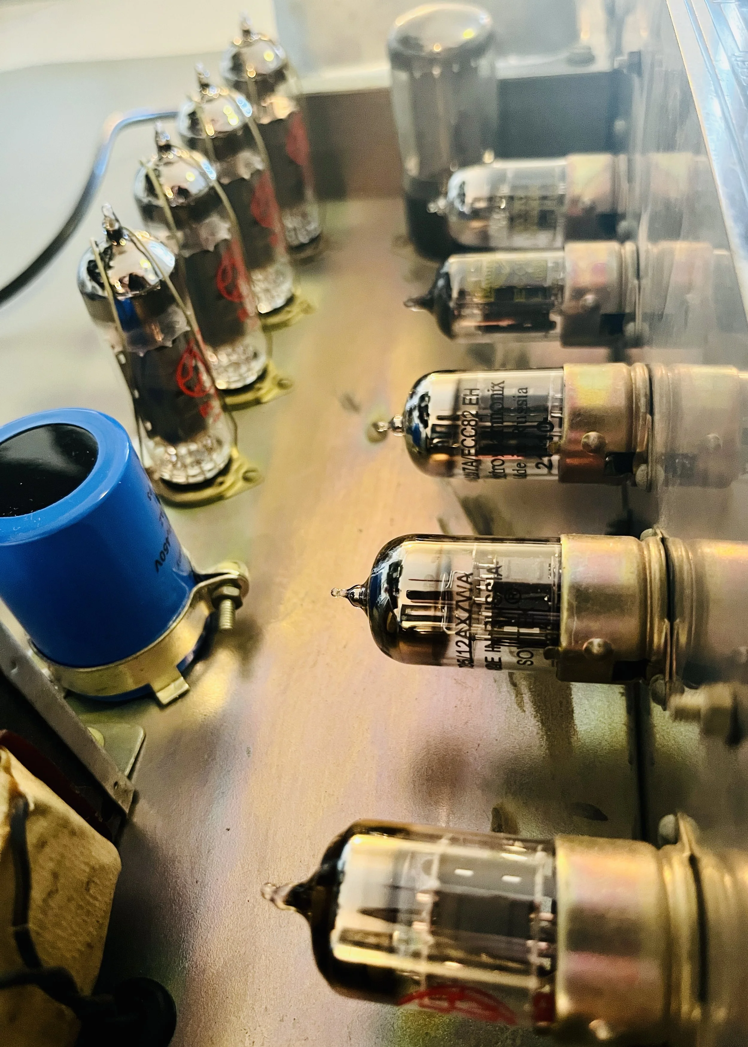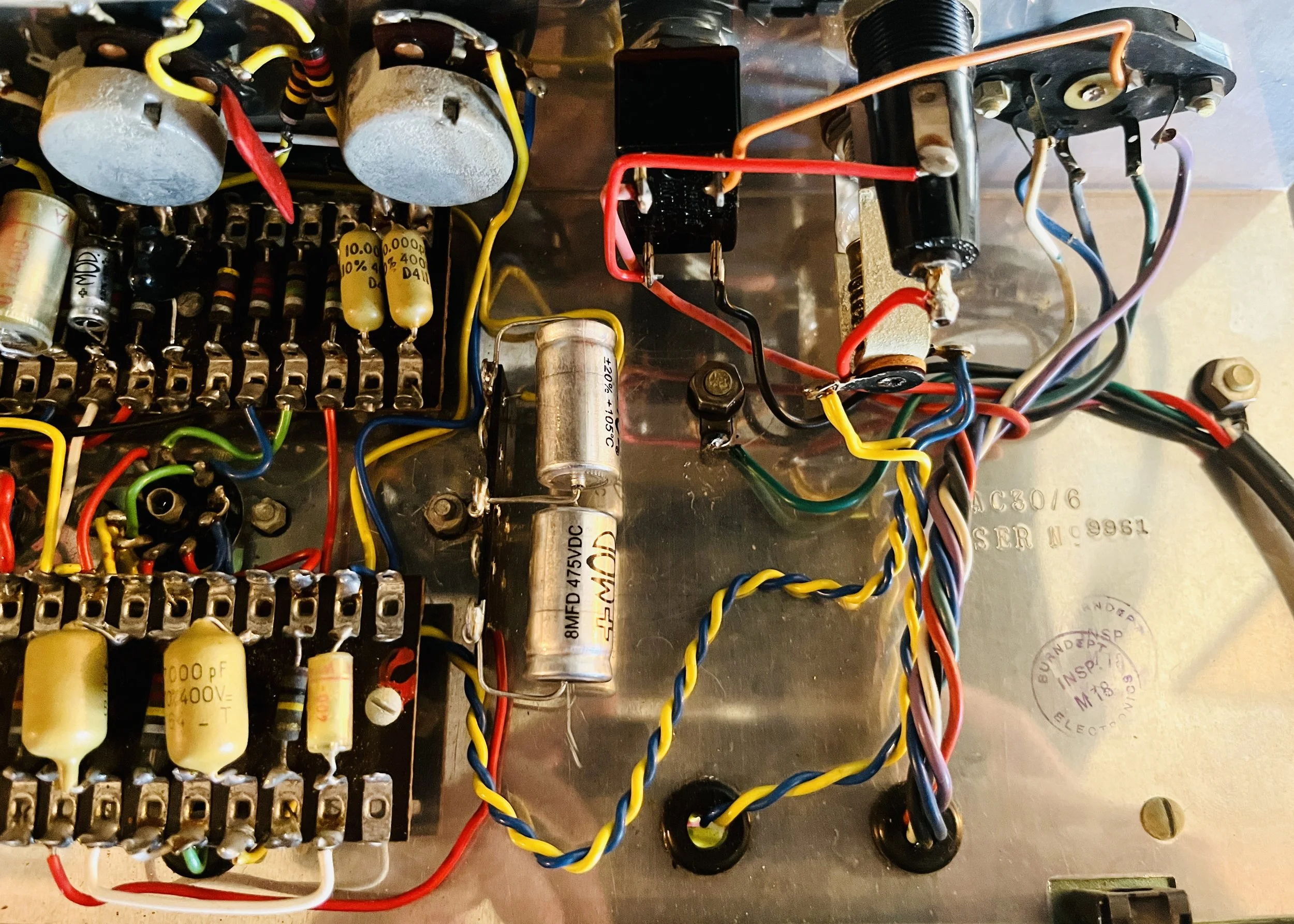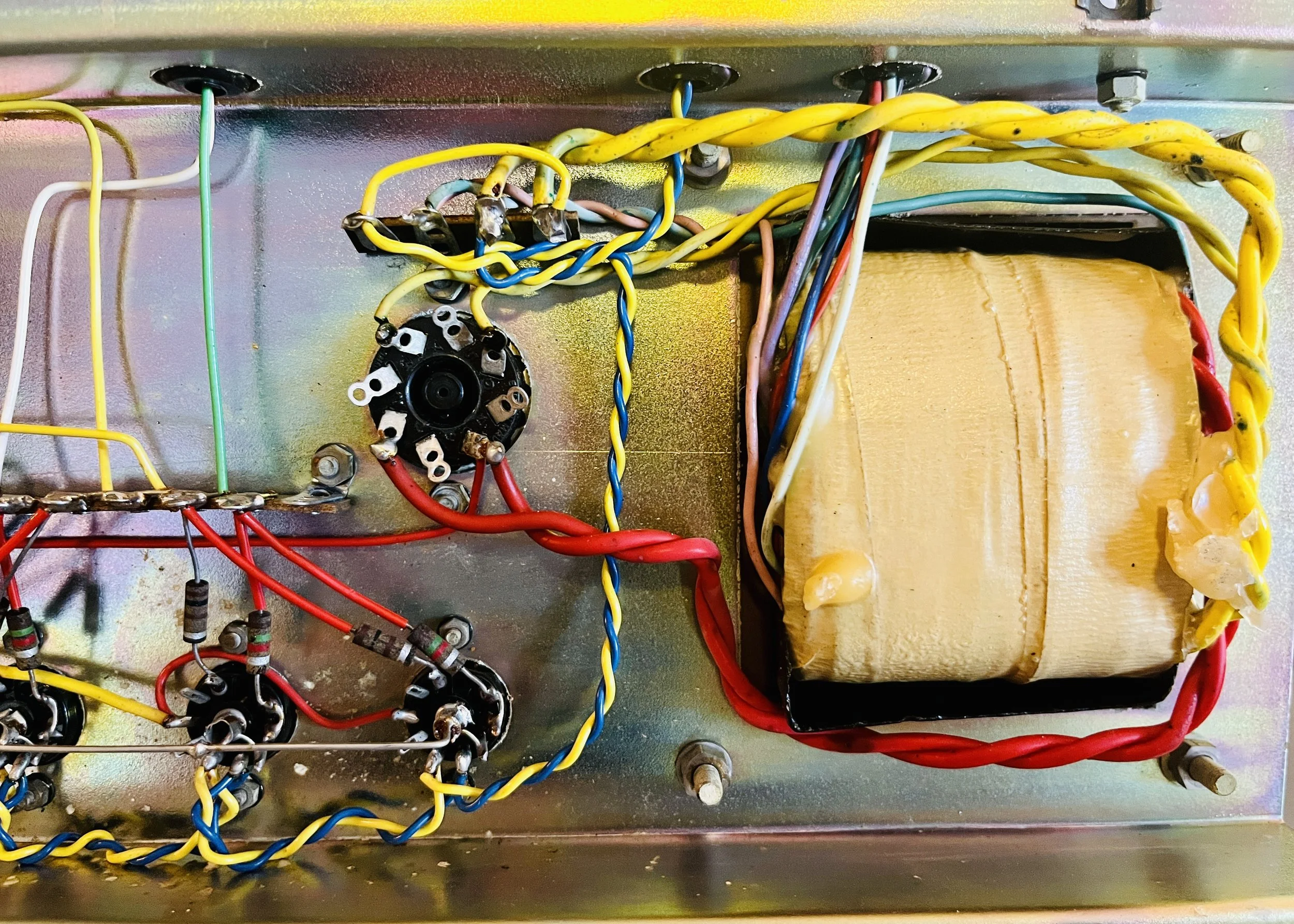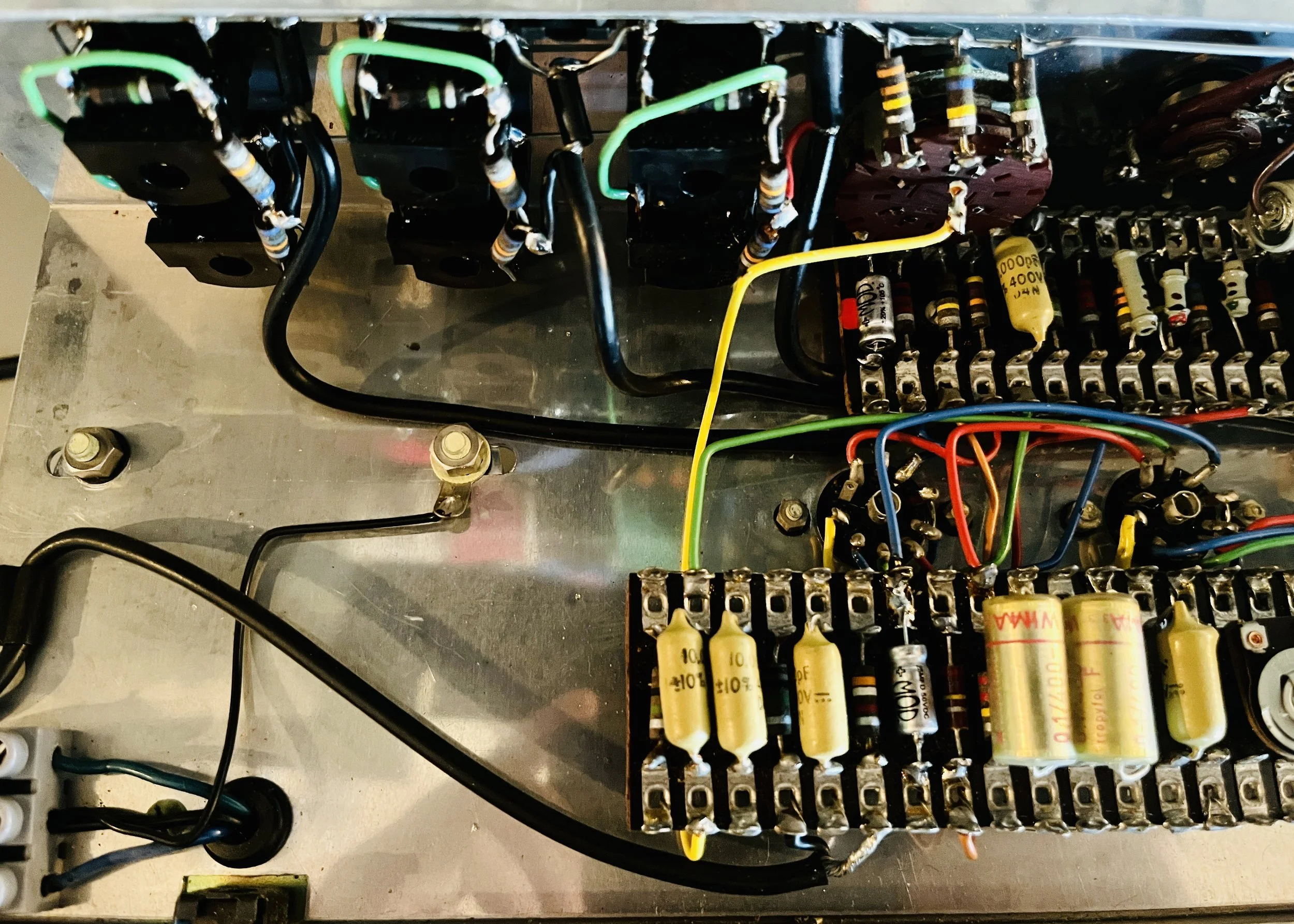 This one came in completely original condition - nothing had been worked on. All filter/bias/bypass caps were replaced with upgraded voltage and temperature rated MOD and F&T brand electrolytic’s (including both cap cans). Two plate load resistors were replaced with vintage spec new production 1/2 watt carbon comp type as the originals had drifted high in value. Many solder joints were re-flowed for reliability and bad connection issues. All pots were cleaned out and lubricated.