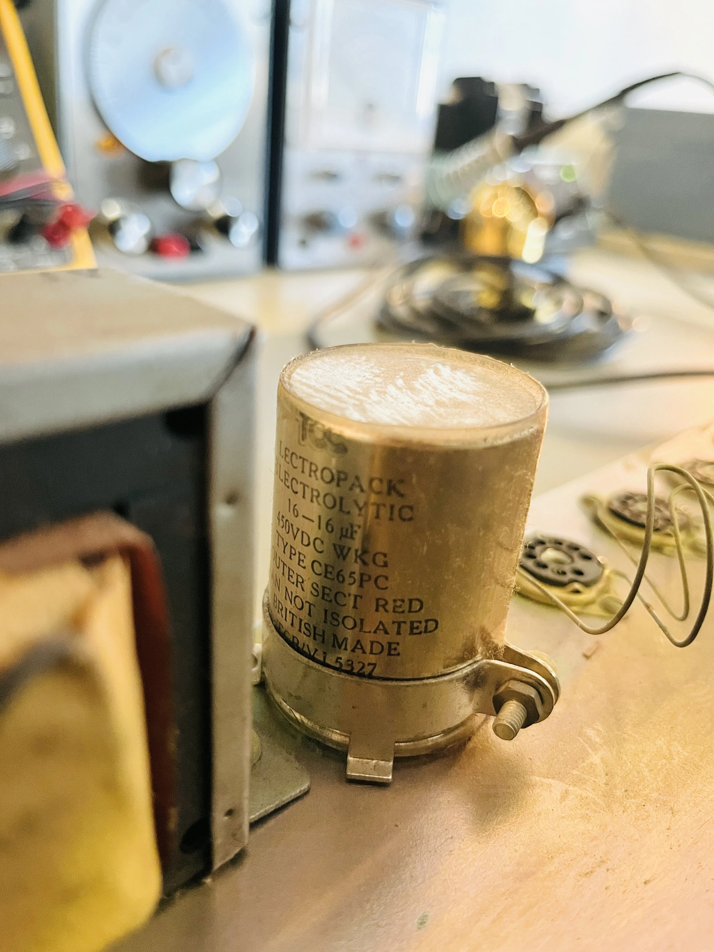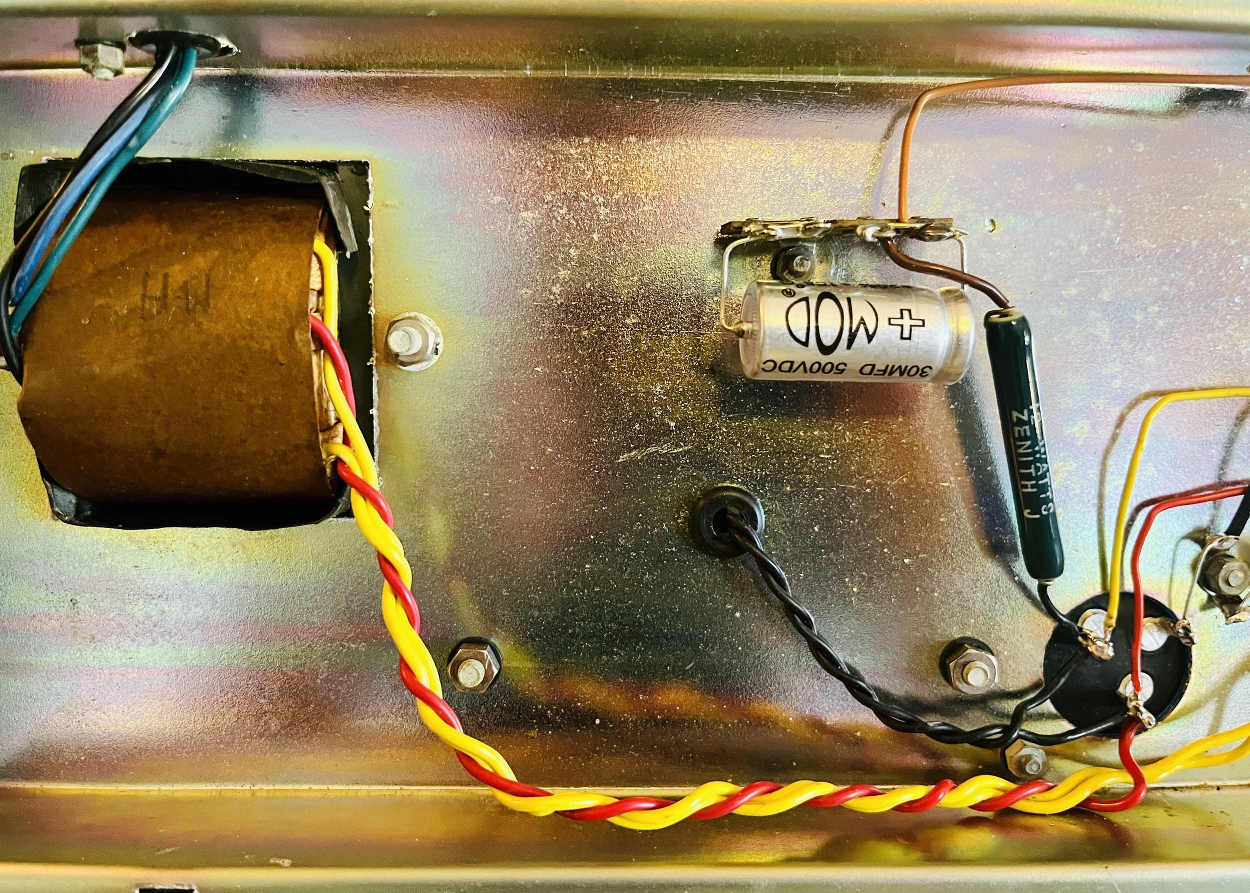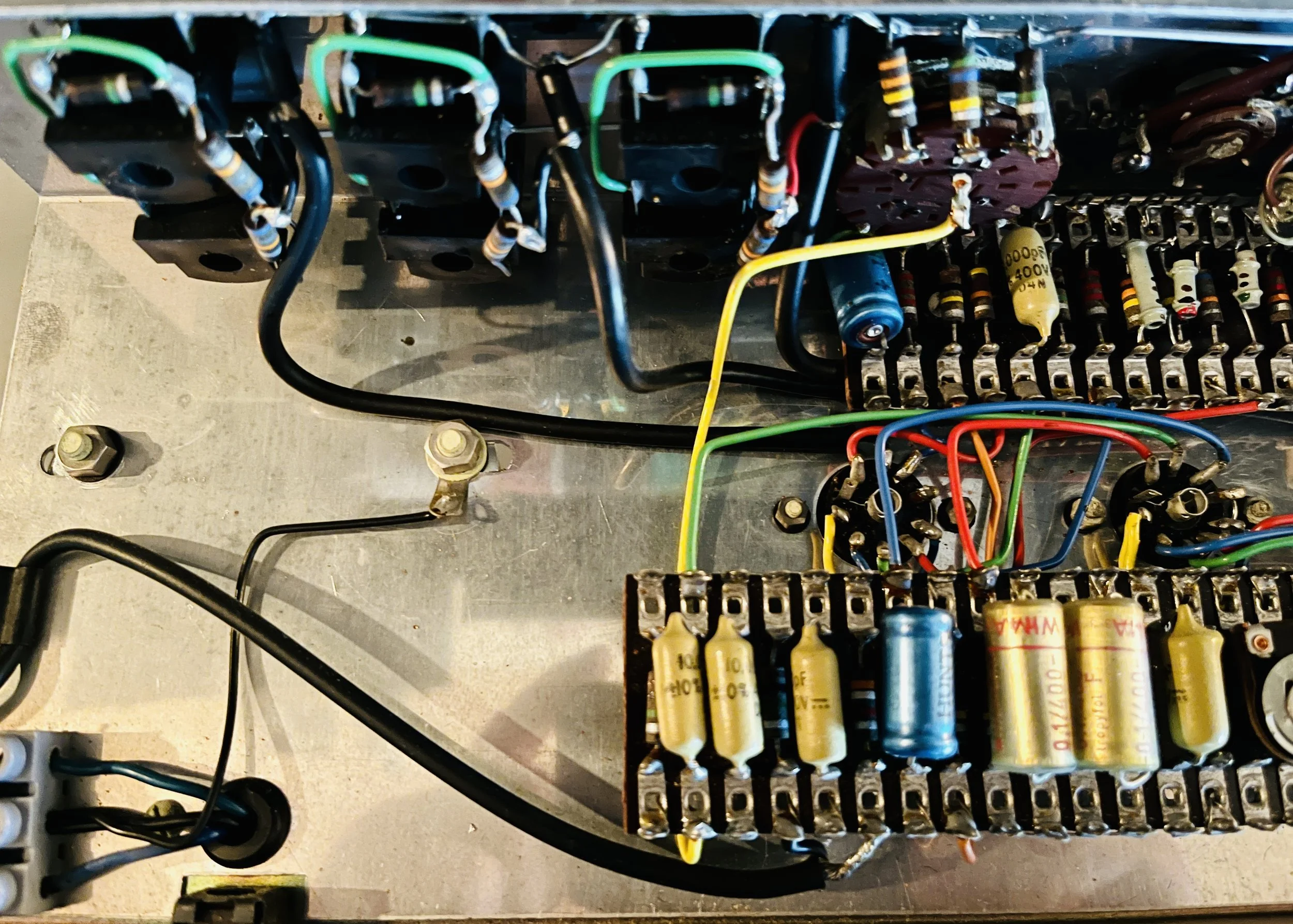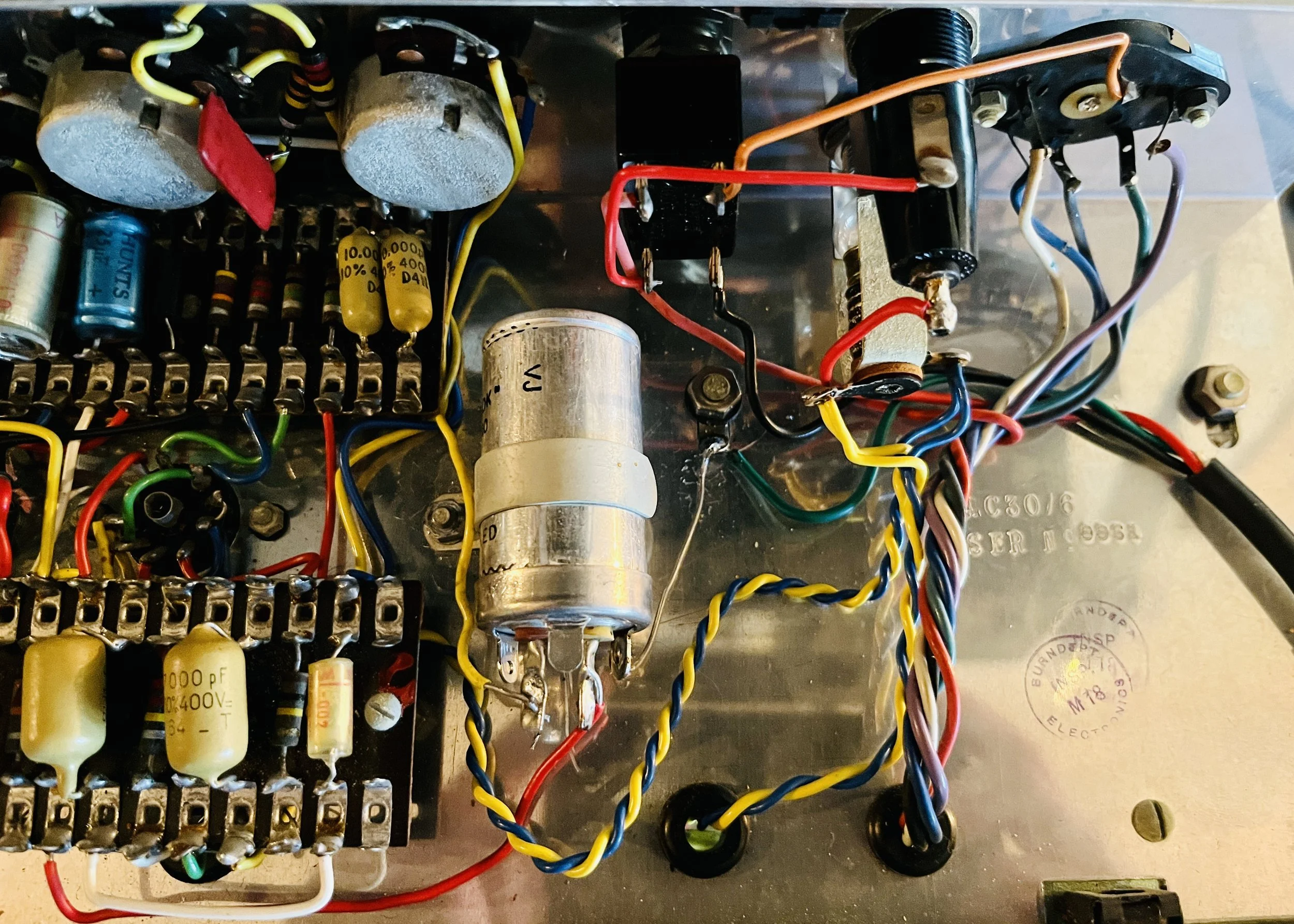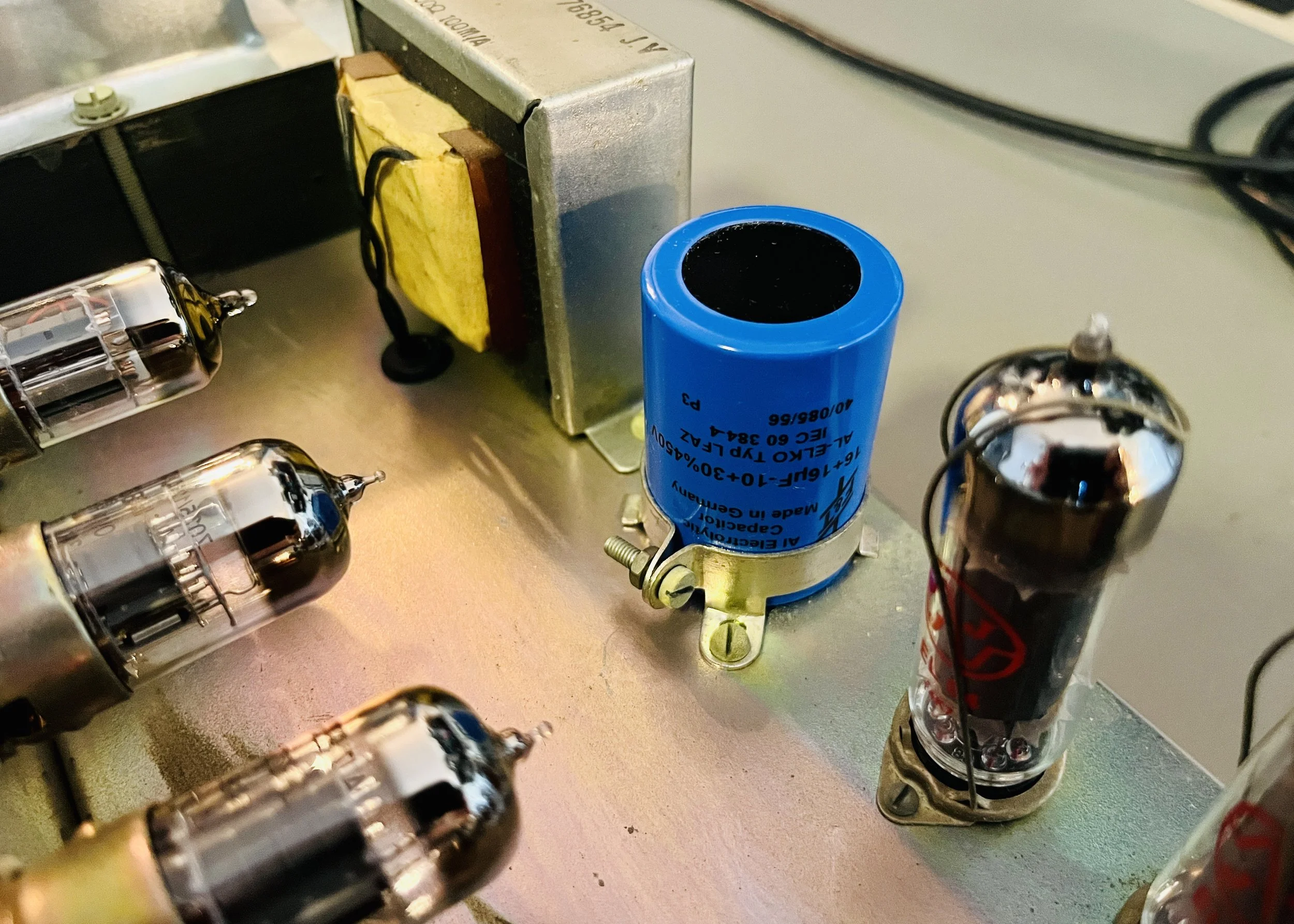 This one came in completely original condition - nothing had been worked on. All filter/bias/bypass caps were replaced with upgraded voltage and temperature rated MOD and F&T brand electrolytic’s (including both cap cans). Two plate load resistors were replaced with vintage spec new production 1/2 watt carbon comp type as the originals had drifted high in value. Many solder joints were re-flowed for reliability and bad connection issues. All pots were cleaned out and lubricated.