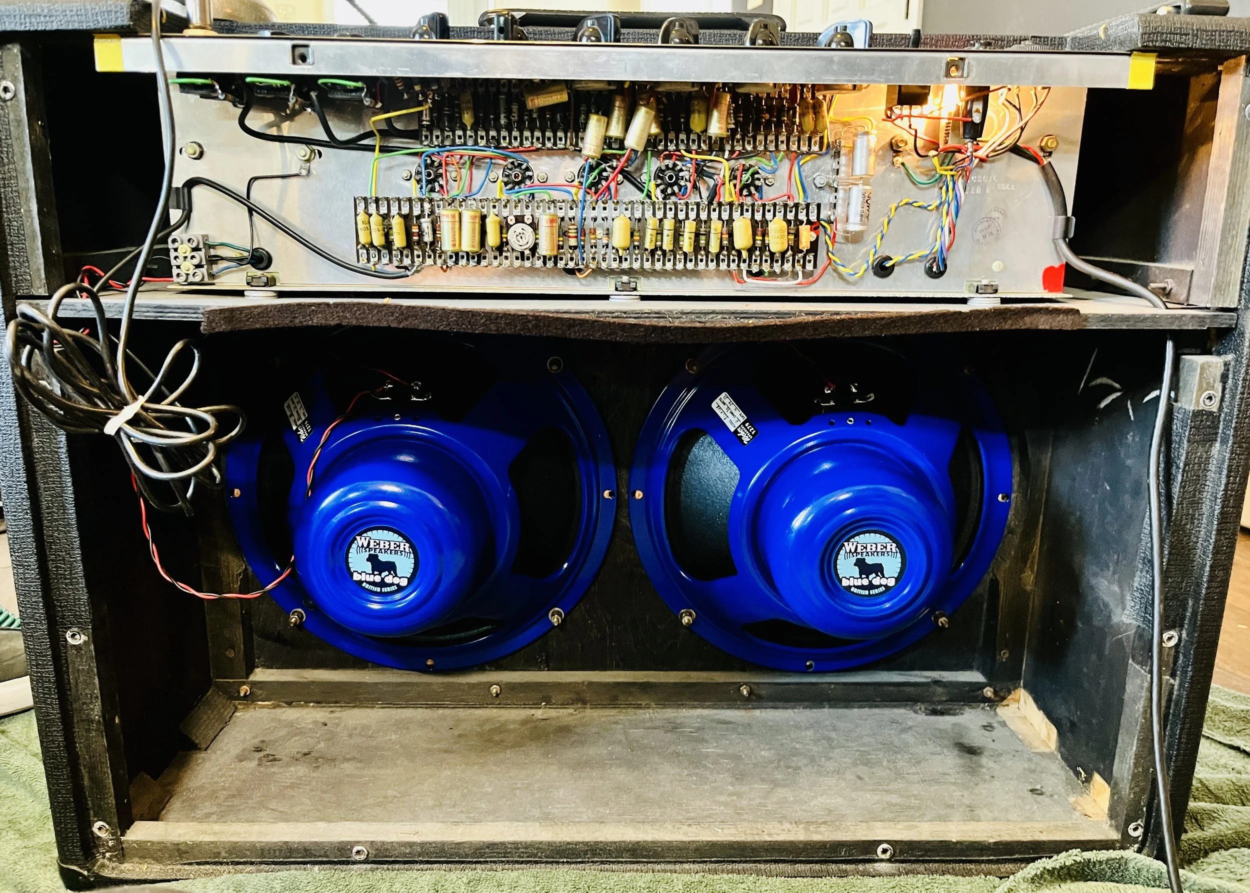 This amp came back in after being dropped, with a blown voice coil in one of the original Alnico 12” speakers. We decided to go with a new pair of Weber Alnico Blue Dog’s (Light Doping) at 8 Ohms each with a 30 Watt power rating to prevent future blow-out’s. This made the amp sound even better in my opinion.