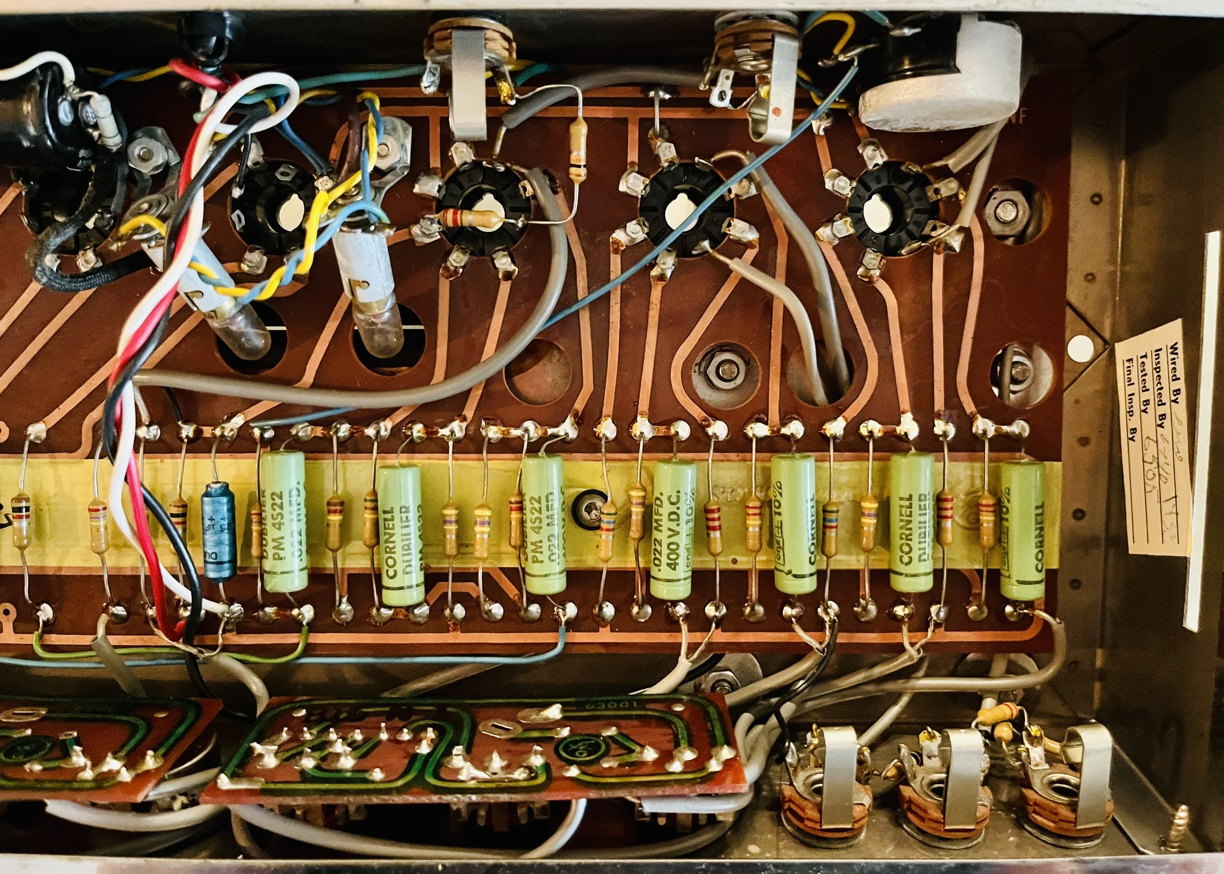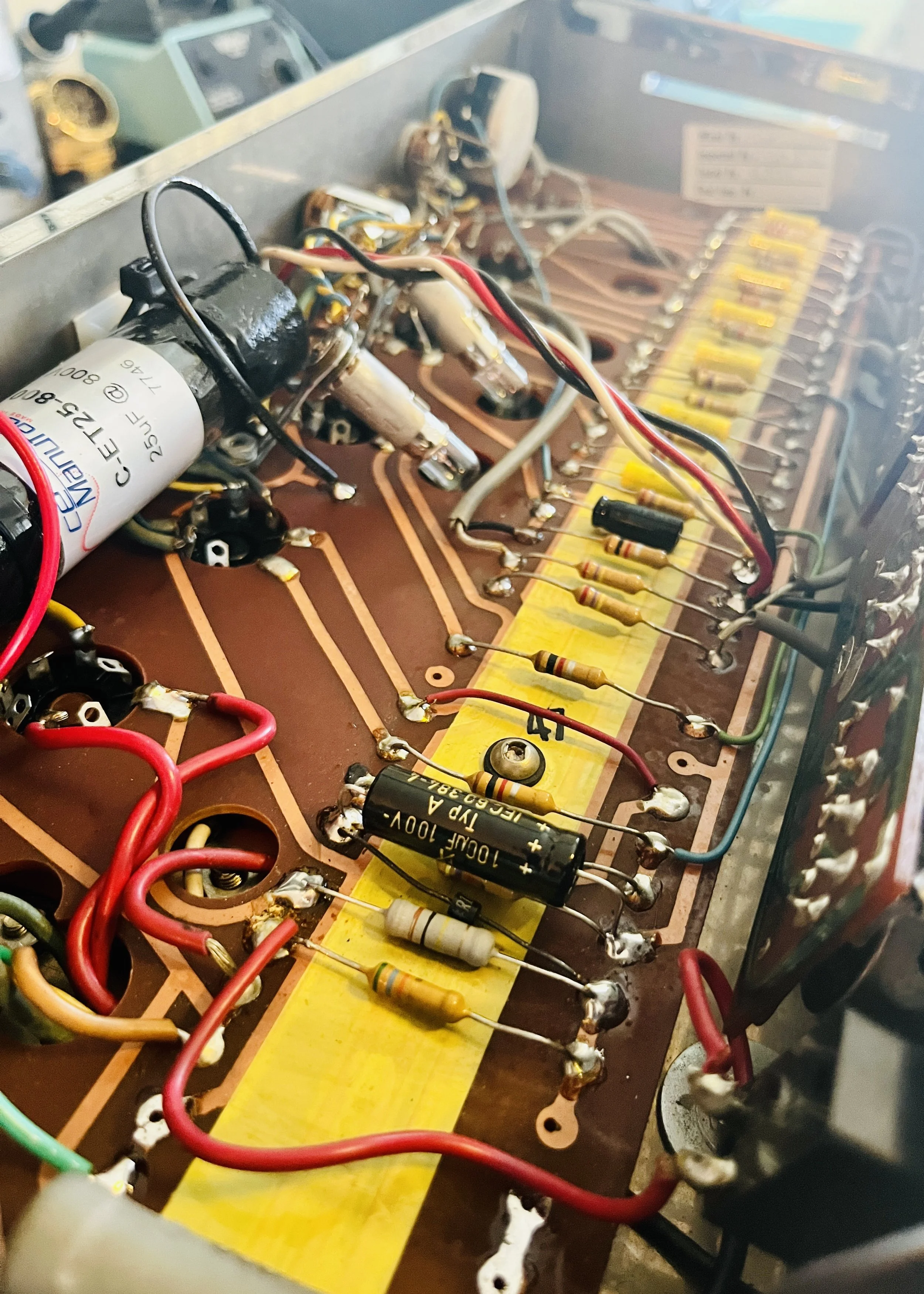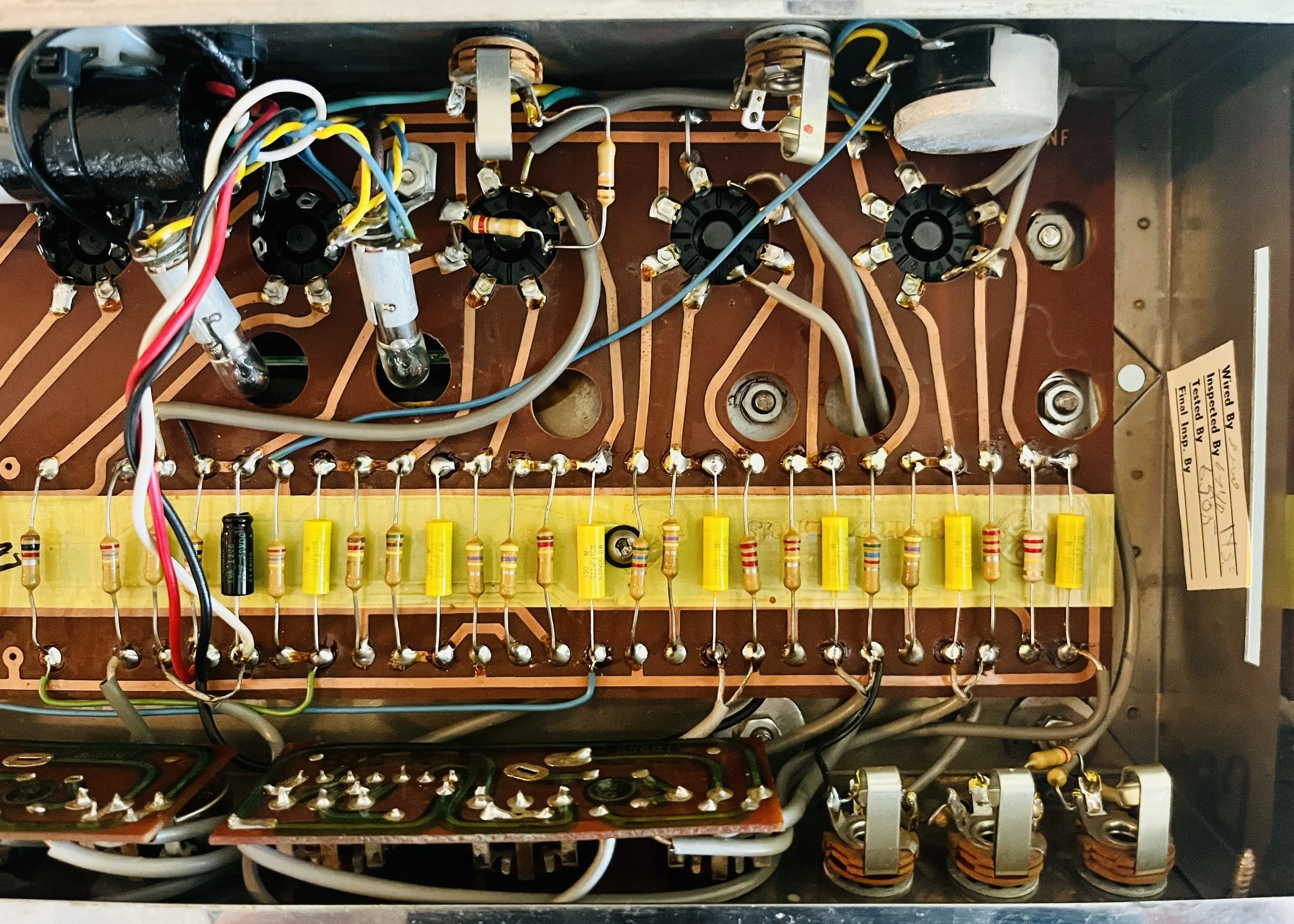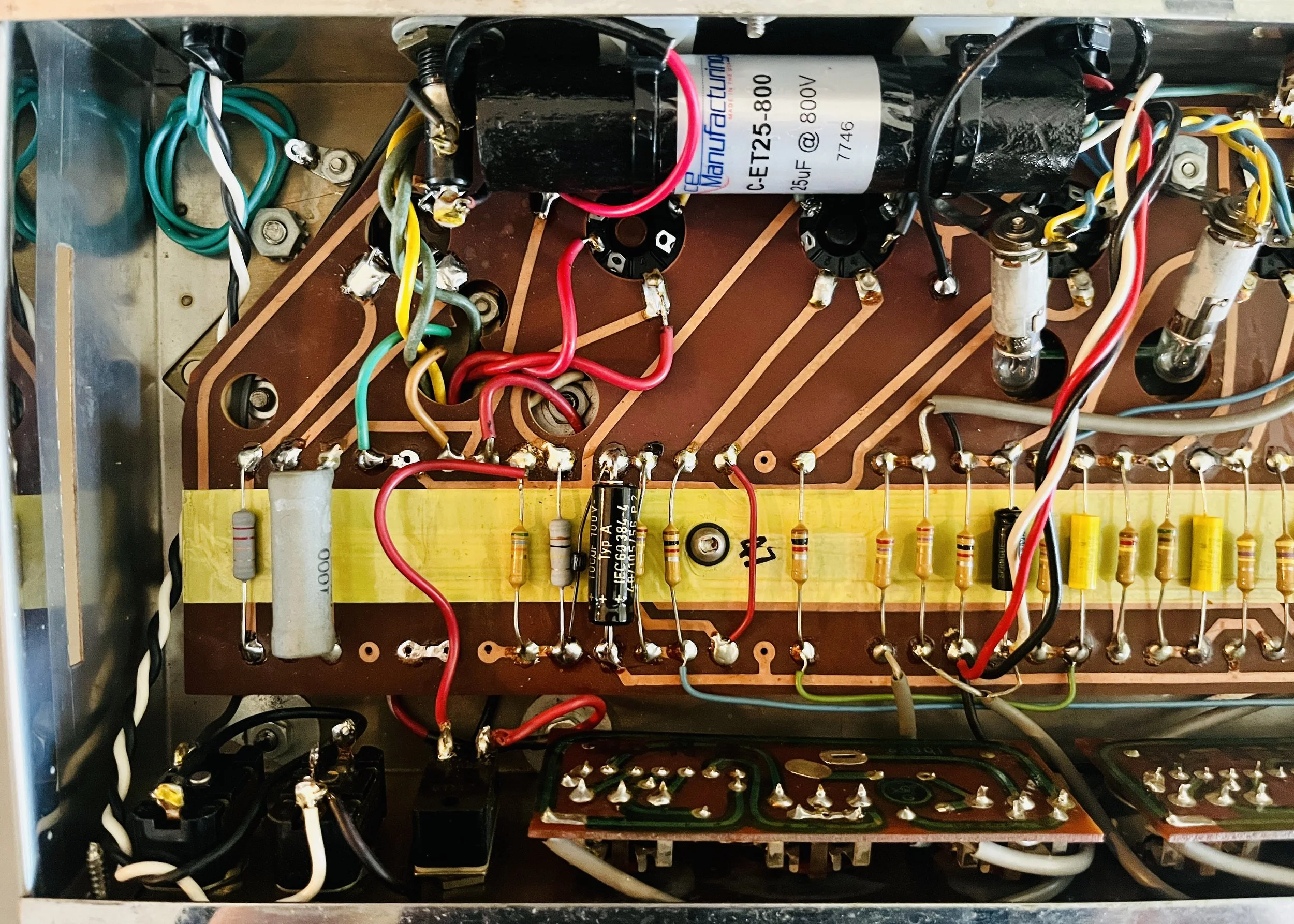 The amp was given a full cap job including the electrolytic cap can, the chassis mounted “fire-cracker” cap, board mounted electrolytic’s, and all the paper/oil signal caps. Brands used included CE, F+T, Sprague Atom, and Mallory. The carbon comp power resistors were replaced with upgraded 2 Watt Metal Oxide type resistors. A new 220k 1 Watt plate resistor was installed on the first gain stage due to noise - the higher wattage resistor means better reliability and a lower noise floor. A new 3 prong power cord was installed for safety reasons and modern electrical code. The death cap was deleted, rendering the polarity switch non-functional.