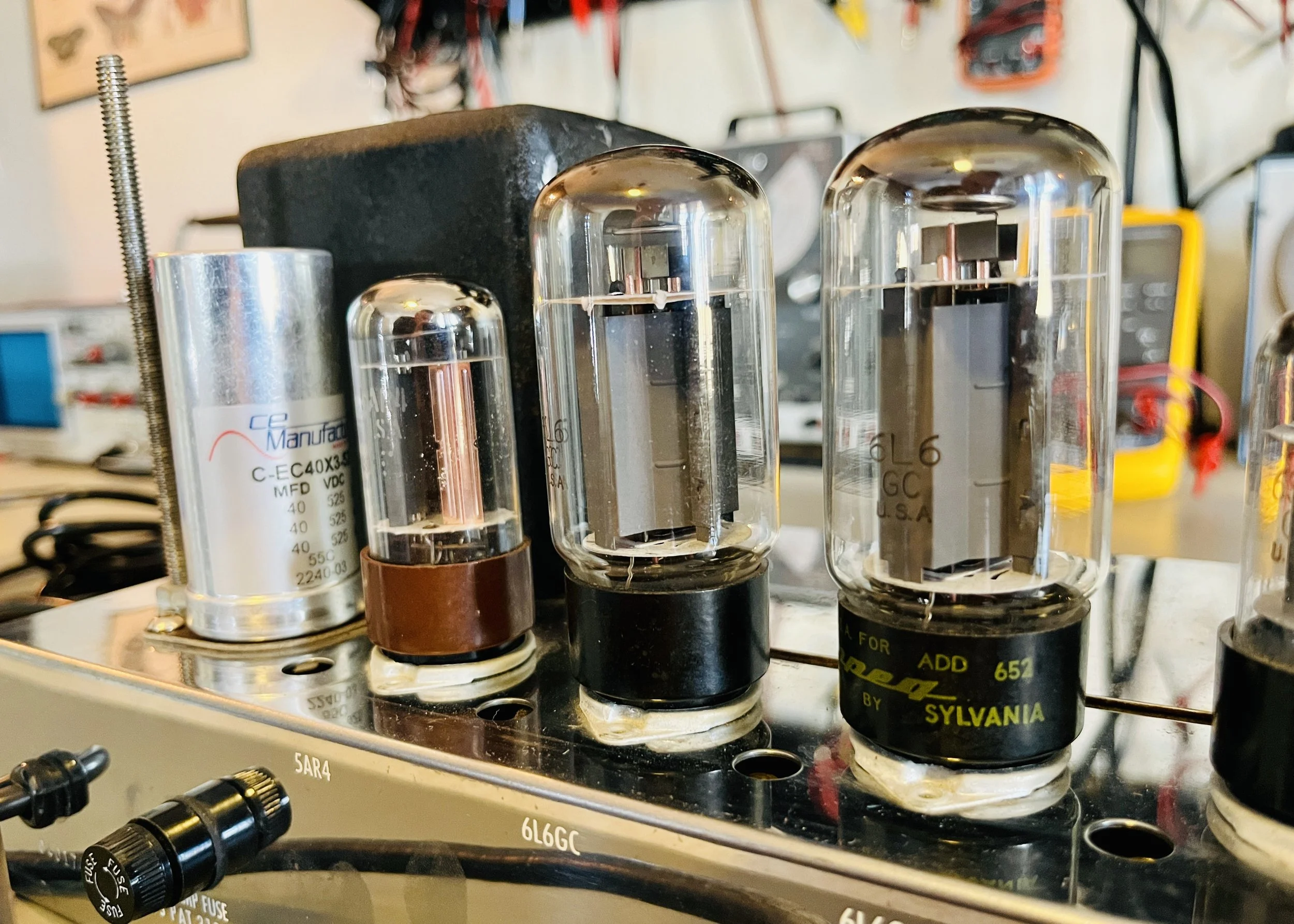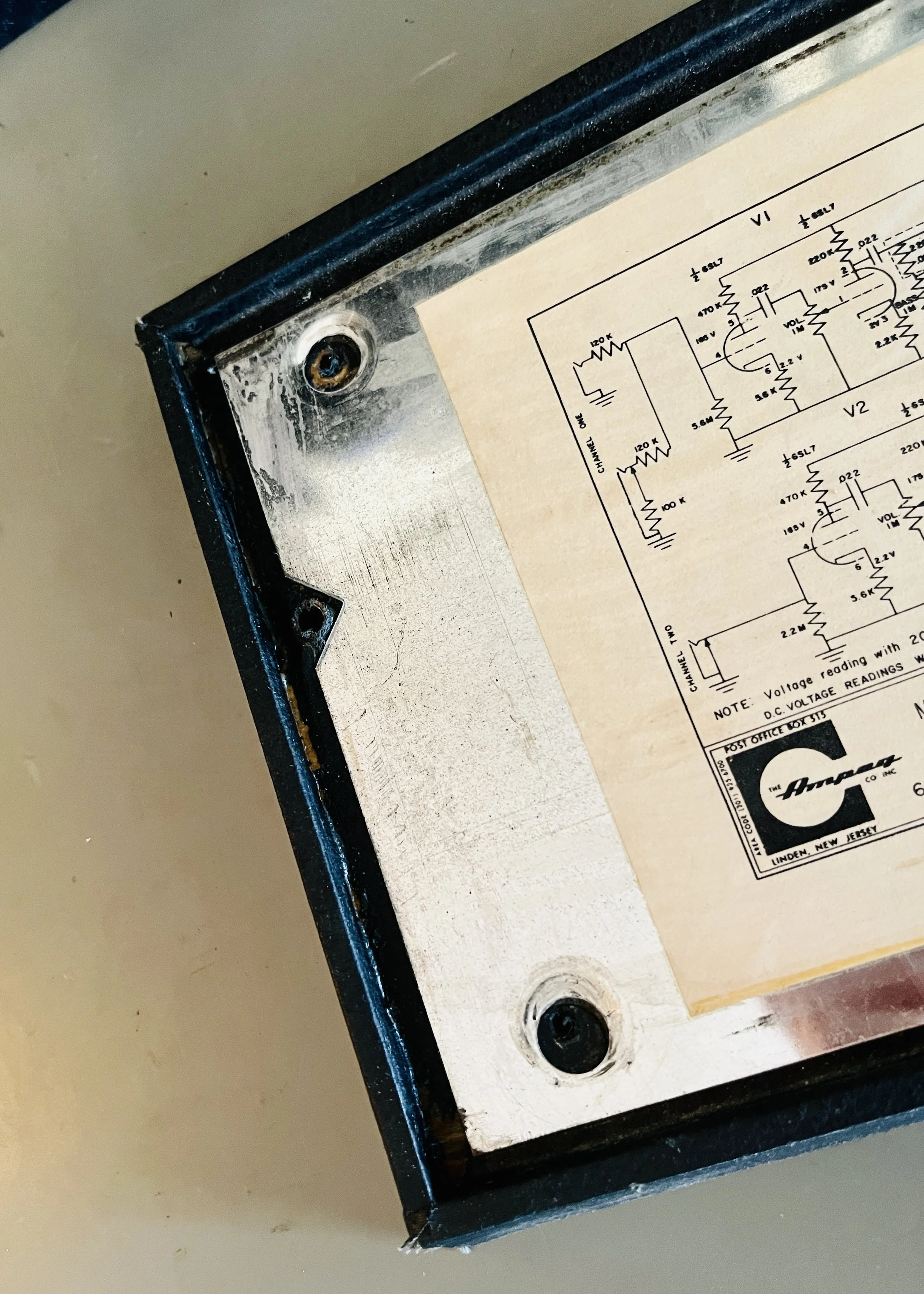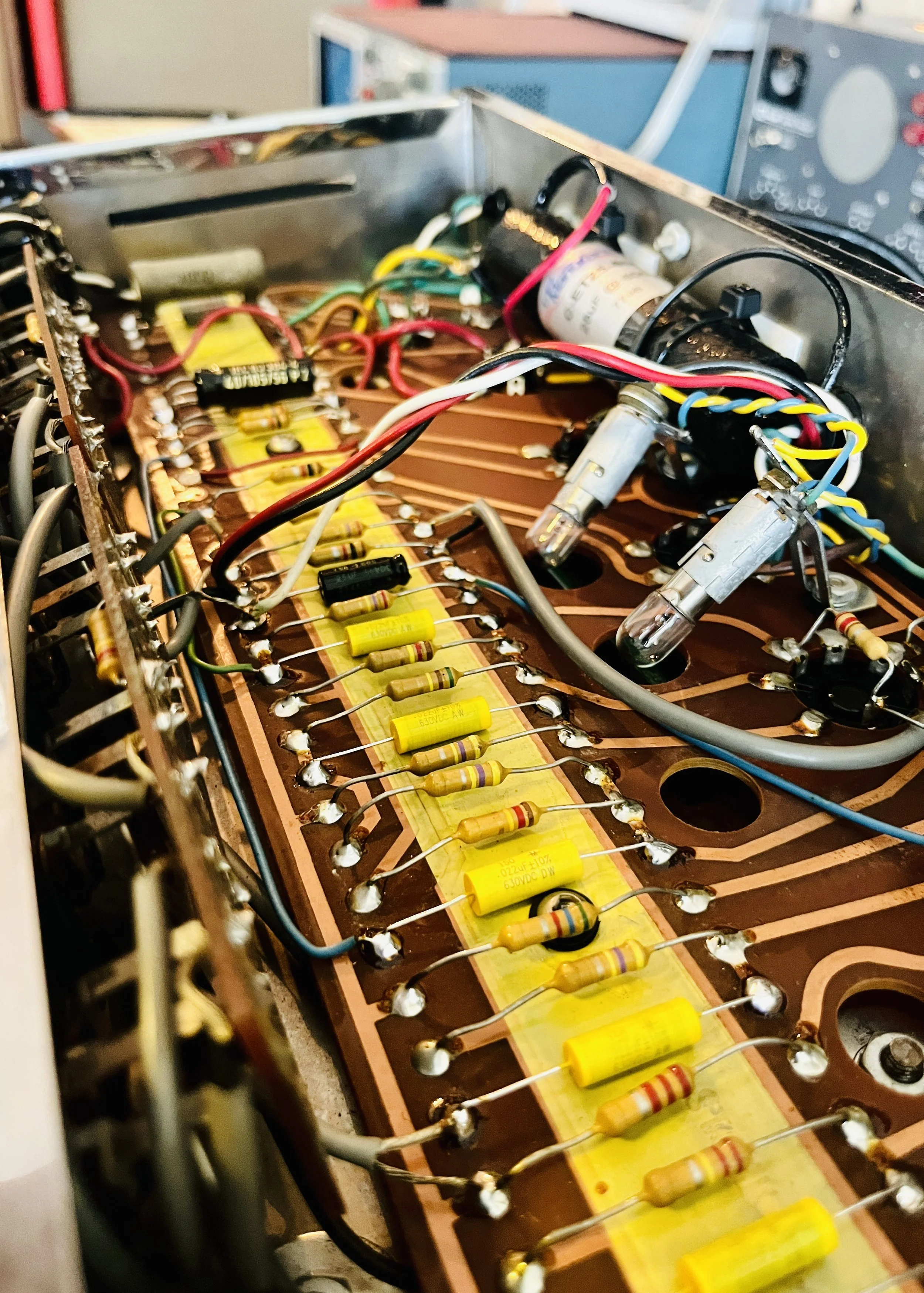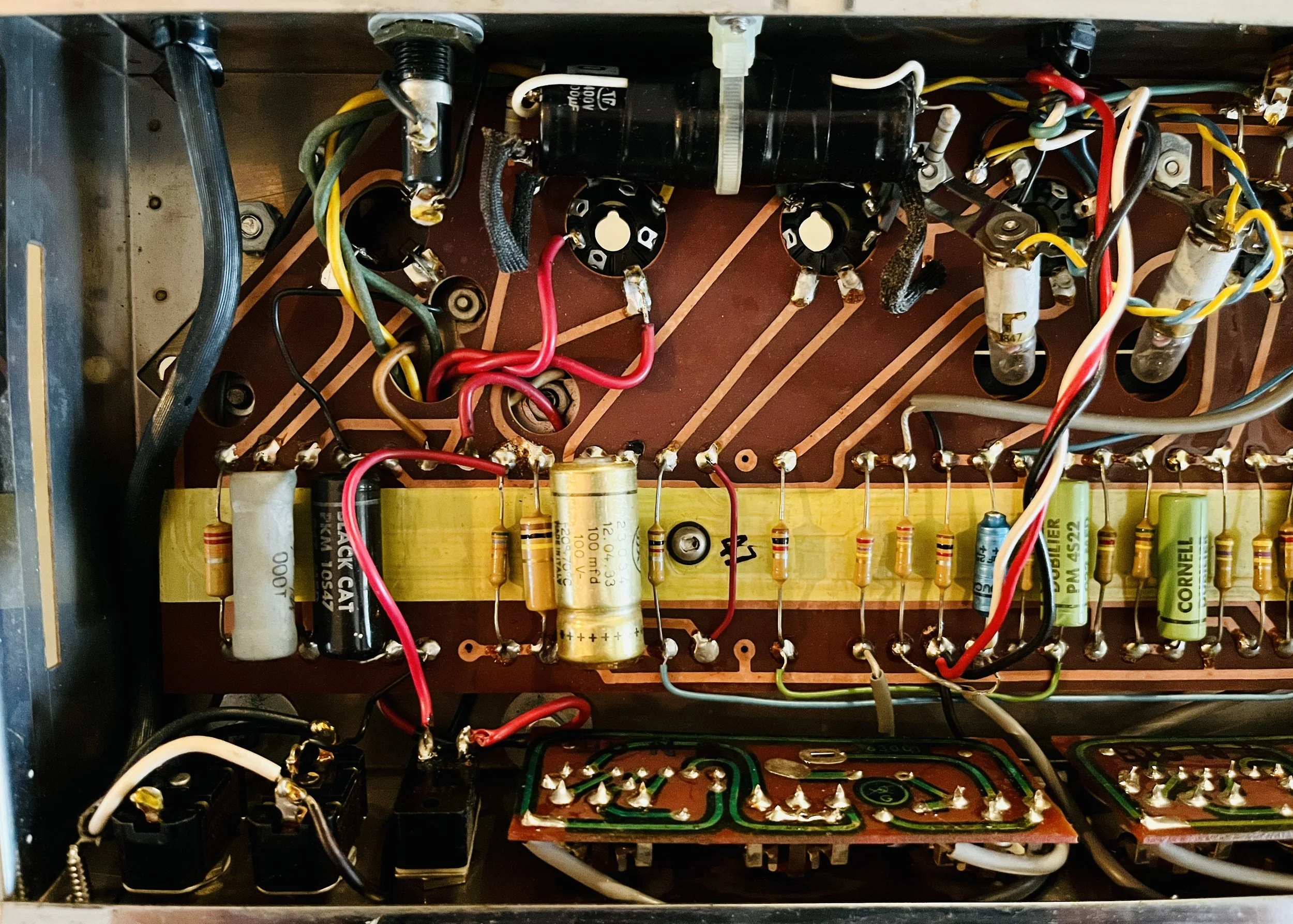 The amp was given a full cap job including the electrolytic cap can, the chassis mounted “fire-cracker” cap, board mounted electrolytic’s, and all the paper/oil signal caps. Brands used included CE, F+T, Sprague Atom, and Mallory. The carbon comp power resistors were replaced with upgraded 2 Watt Metal Oxide type resistors. A new 220k 1 Watt plate resistor was installed on the first gain stage due to noise - the higher wattage resistor means better reliability and a lower noise floor. A new 3 prong power cord was installed for safety reasons and modern electrical code. The death cap was deleted, rendering the polarity switch non-functional.