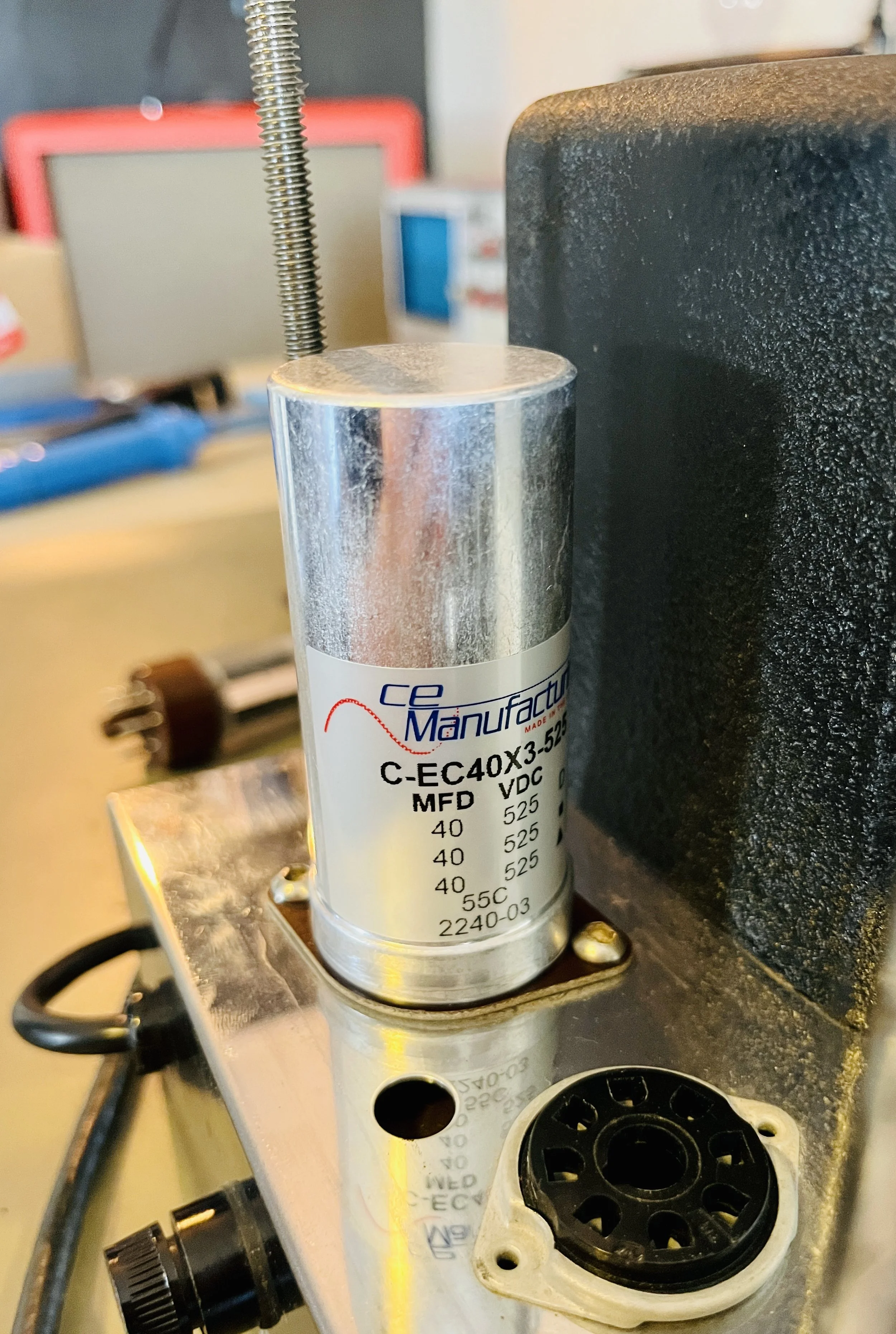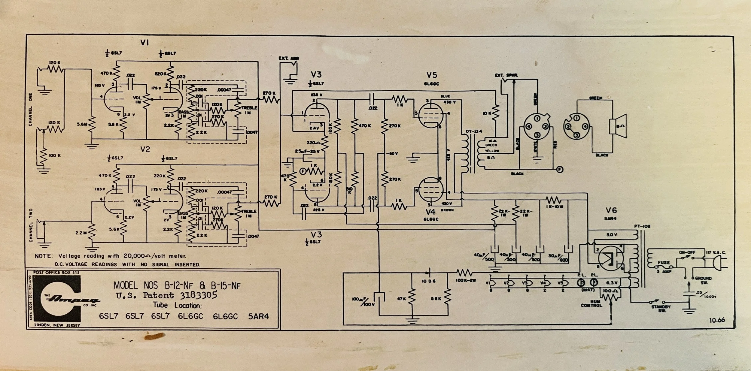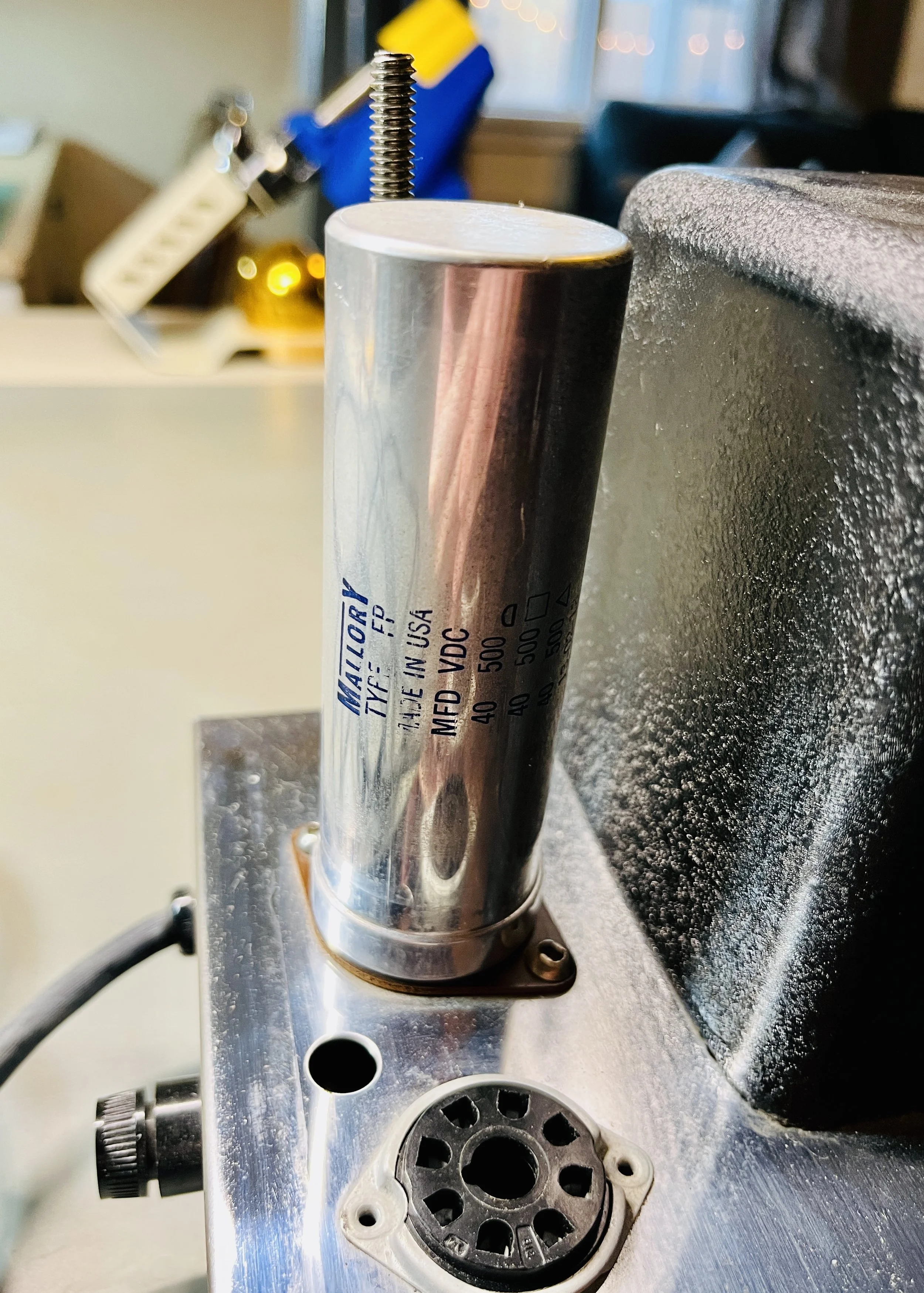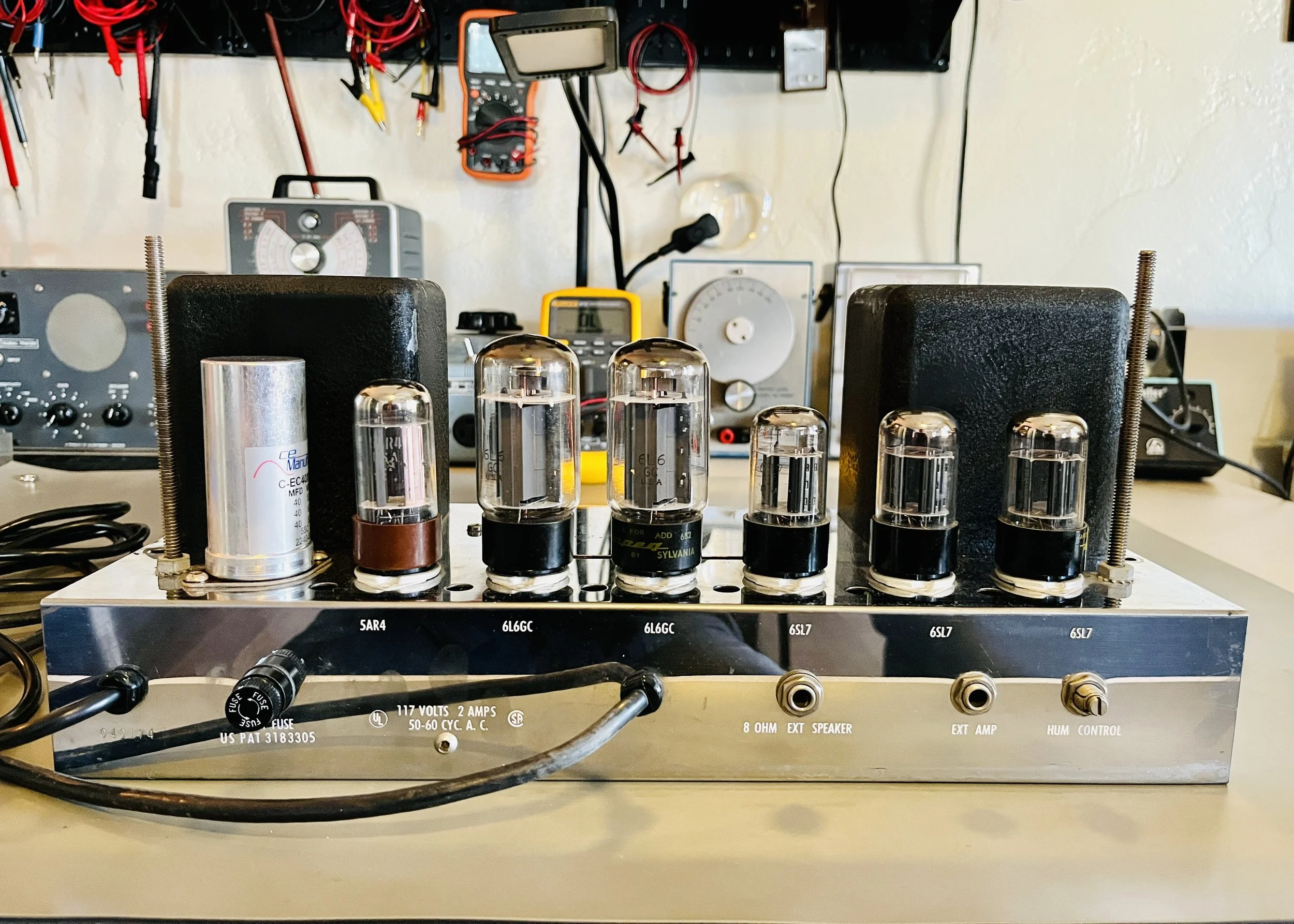 The amp was given a full cap job including the electrolytic cap can, the chassis mounted “fire-cracker” cap, board mounted electrolytic’s, and all the paper/oil signal caps. Brands used included CE, F+T, Sprague Atom, and Mallory. The carbon comp power resistors were replaced with upgraded 2 Watt Metal Oxide type resistors. A new 220k 1 Watt plate resistor was installed on the first gain stage due to noise - the higher wattage resistor means better reliability and a lower noise floor. A new 3 prong power cord was installed for safety reasons and modern electrical code. The death cap was deleted, rendering the polarity switch non-functional.