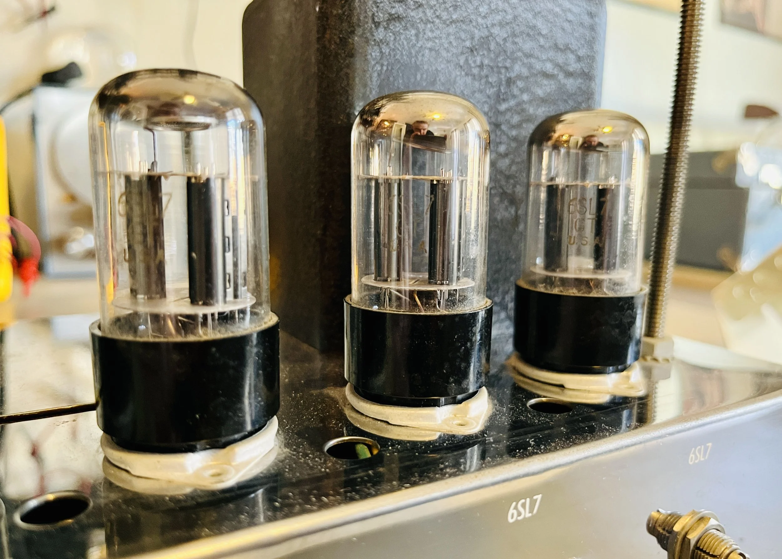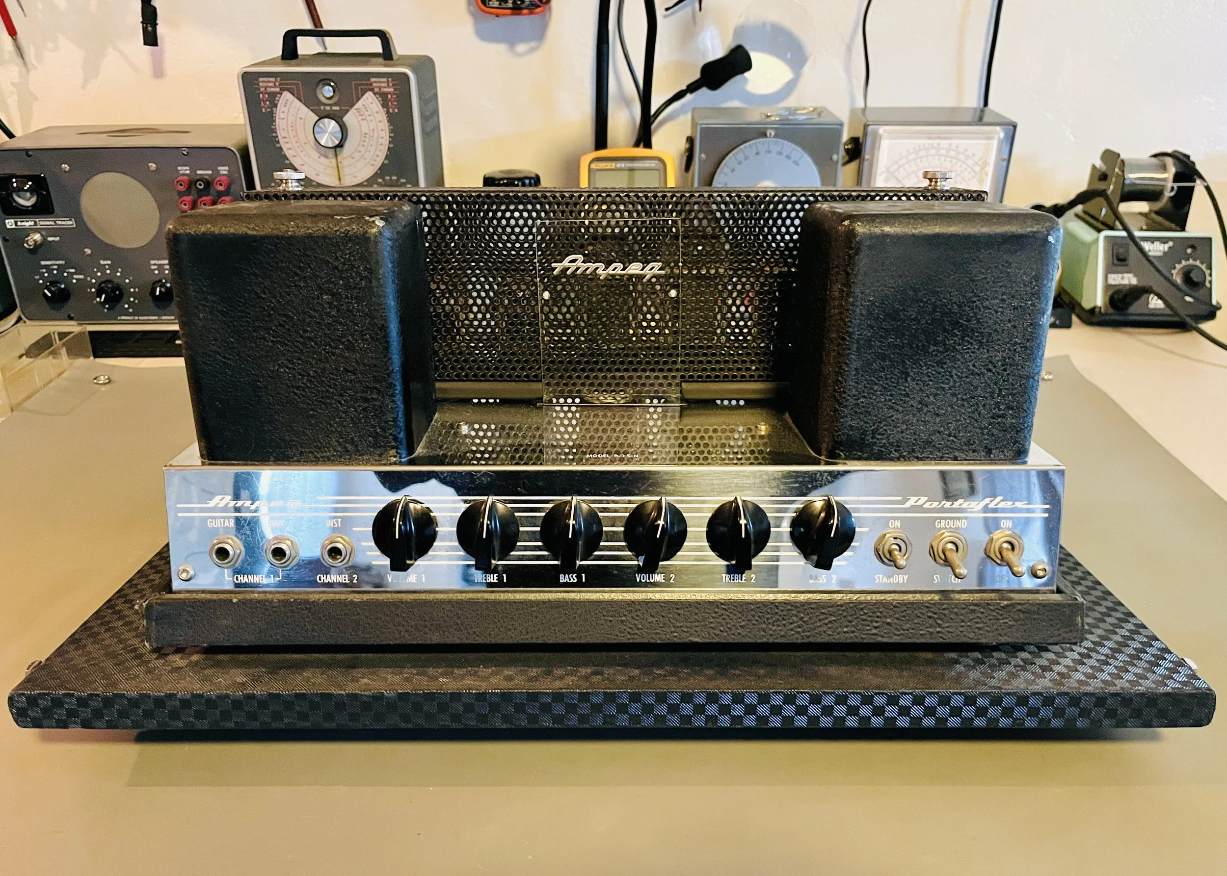 The amp that many people associate with James Jamerson and Motown, the B-15 is an all time favorite low powered tube bass amp that is perfect for recording. This one came in with an all original tube set, and was almost completely original electronically. The symptoms included humming, crackling/popping, and lack of treble response. There was also physical damage to the wooden chassis tray, and one of the four shock-mounts was broken and needed a replacement.