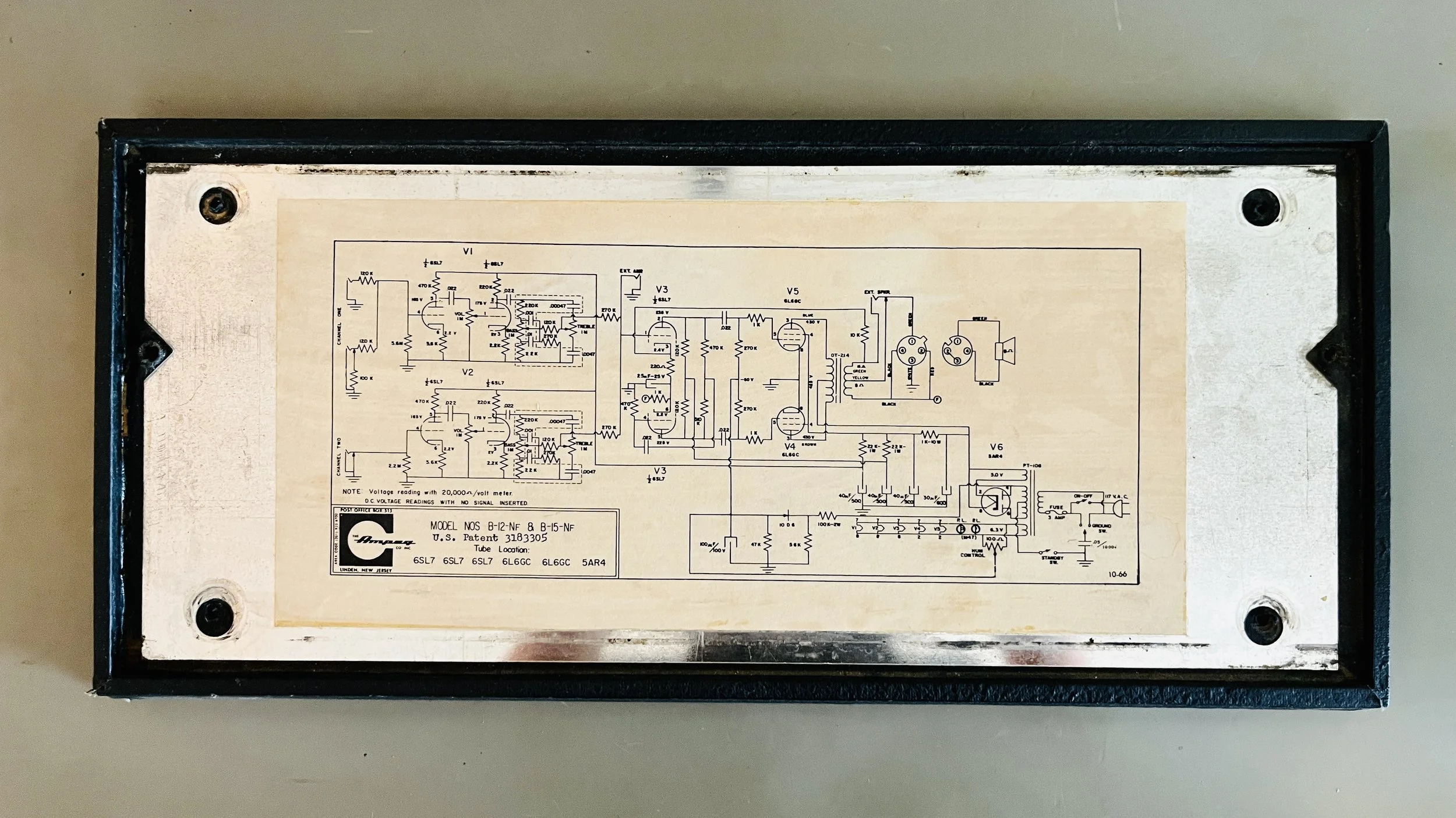 All of the original Ampeg/Sylvania branded tubes tested good and were left in place. The tube lineup was: V1-V3 = SYLVANIA 6SL7, V4-V5 = SYLVANIA 6L6GC Matched Pair, V6 = SYLVANIA 5AR4. The Fixed Bias for the grey-plate SYLVANIA 6L6GC’s was set to a factory spec correct %52 Class AB Plate Dissipation with a B+ of 460VDC. The broken part of the wood head tray (one of the side rails) was carefully taken apart and glued (Titebond 3) back into place, then clamped with bar clamps for 48 hours. The broken shock-mount was replaced with a custom made version from Fliptops.net - the Ampeg specialty site in New York. The amp was cleaned, and all the hardware was tightened. A great sounding amp for guitar or bass.