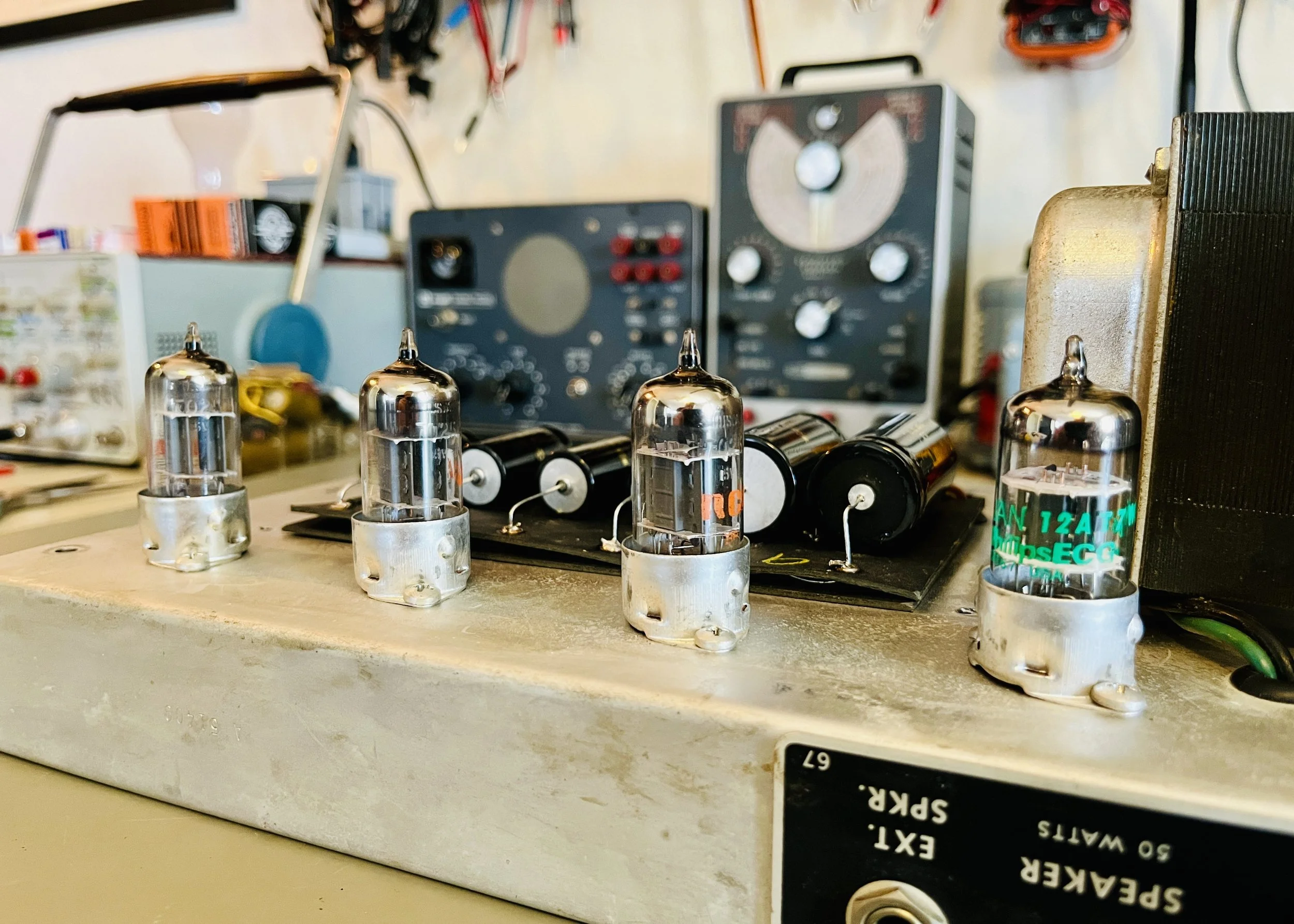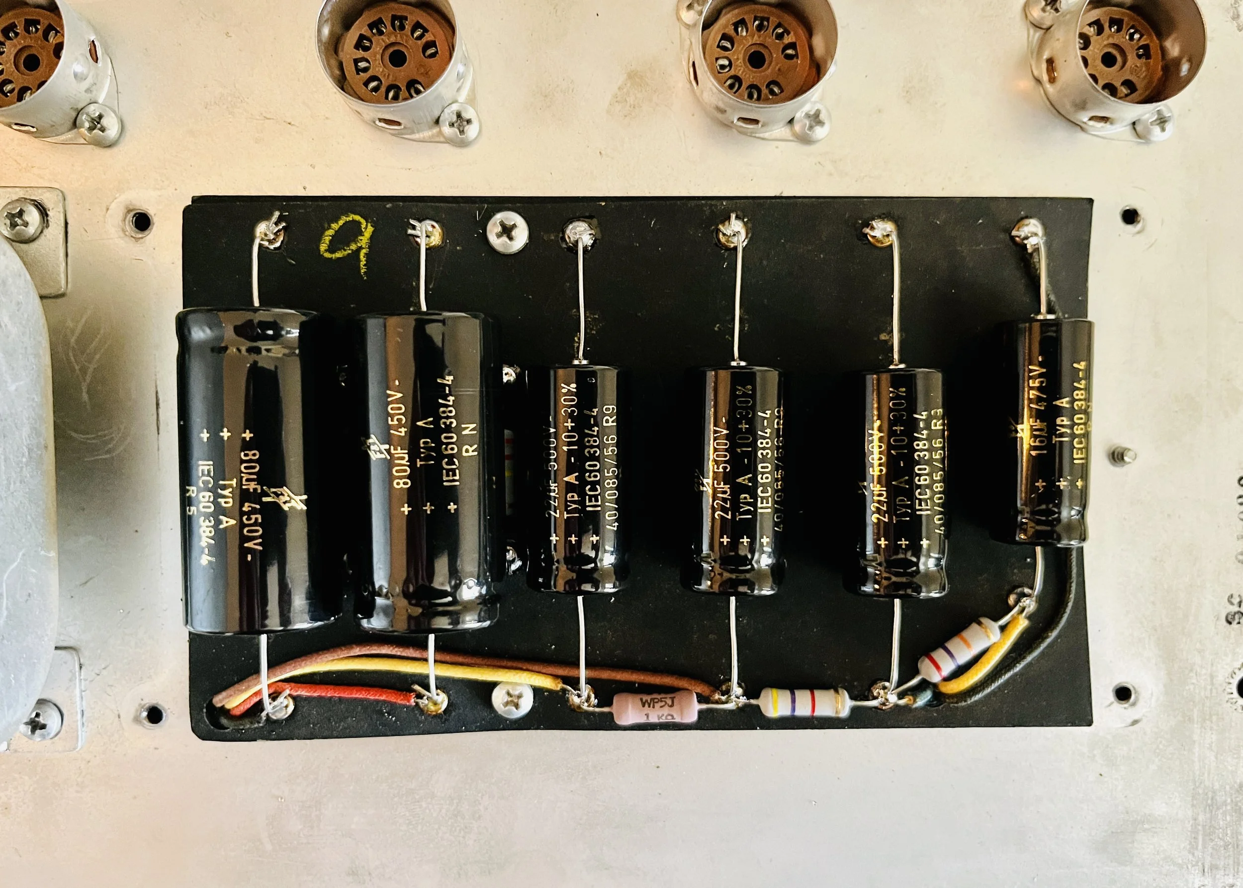 This amp came in mostly original condition with the exception of someone having changed the coupling caps on the phase inverter plates to GE branded units from the 80’s. It needed a full restoration including a cap job, new power/misc. resistors, cleaning, and new tubes - along with the AB165 conversion and master volume addition.