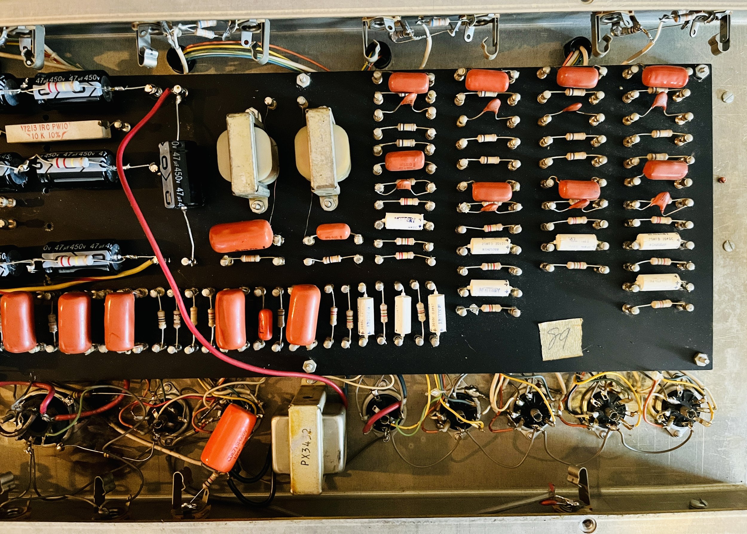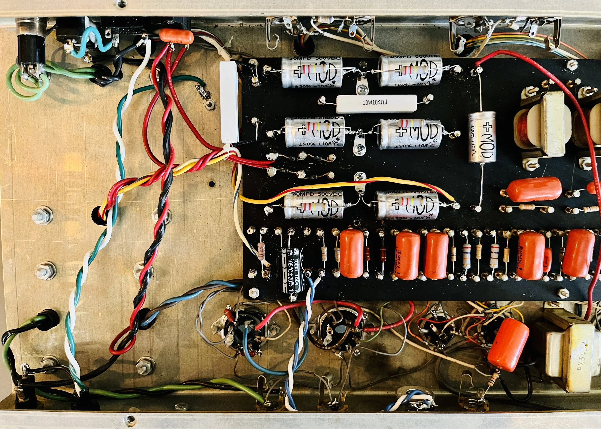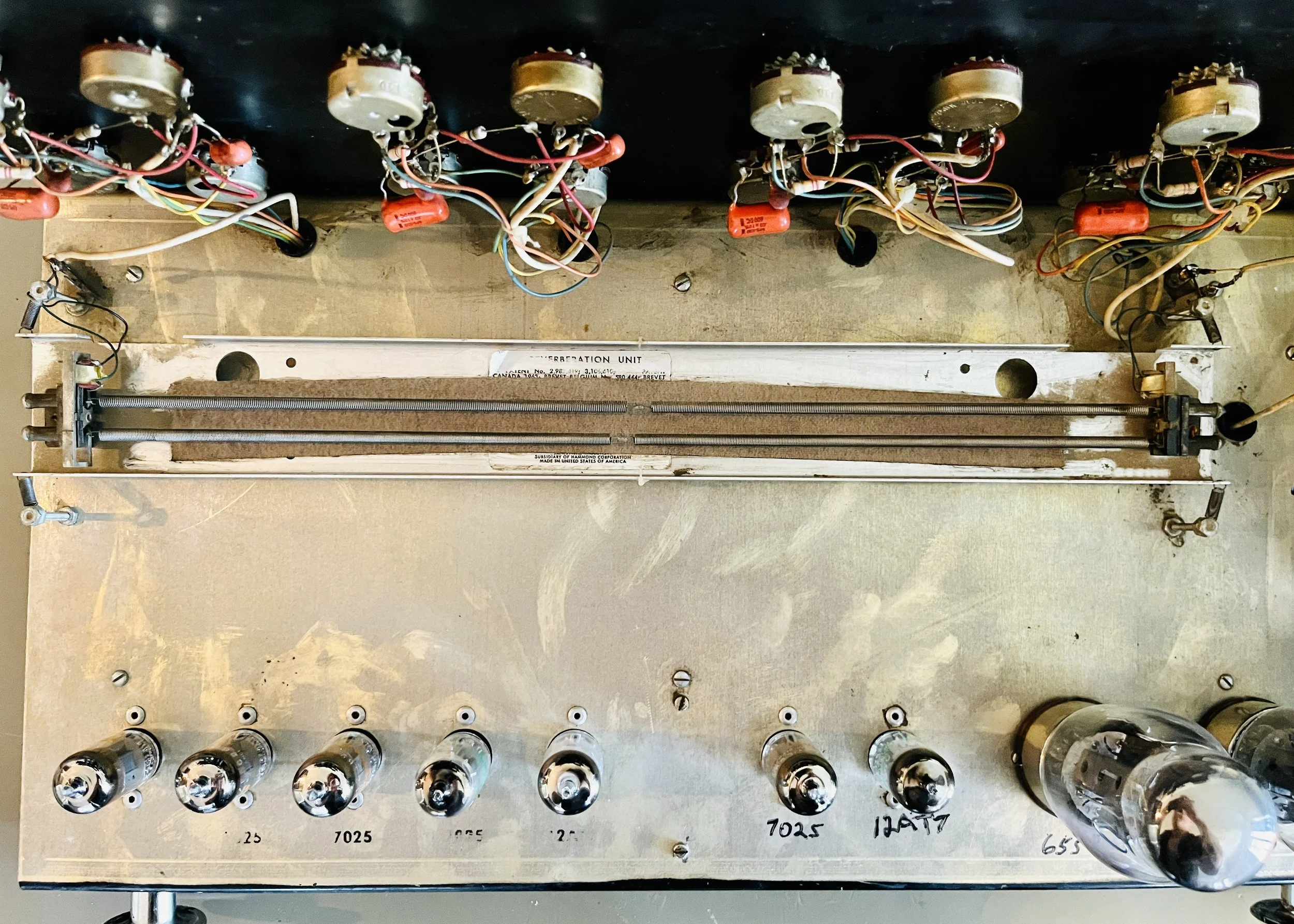 The original tubes did not all test good and were partially replaced with NOS units for a complete lineup of tubes from the same era as the amp. V1-V3 = Amperex 7025, V4 = NOS Sylvania (Baldwin Reprint) 12AX7, V5/V7 = NOS JAN 12AT7WC, V6 = Amperex 7025, V8-V9 = Tungsol (Magnavox Reprint) 6550 Matched Pair. These tubes were picked for best tone, and reliability. The 6550’s Fixed Bias was set to a conservative %46 Class AB Plate Dissipation with a B+ of 575VDC. The tube sockets were all re-tensioned and were then treated with De-Oxit to remove/prevent corrosion. The pots were sprayed out and the amp was cleaned inside and out. Amp now sounds great.