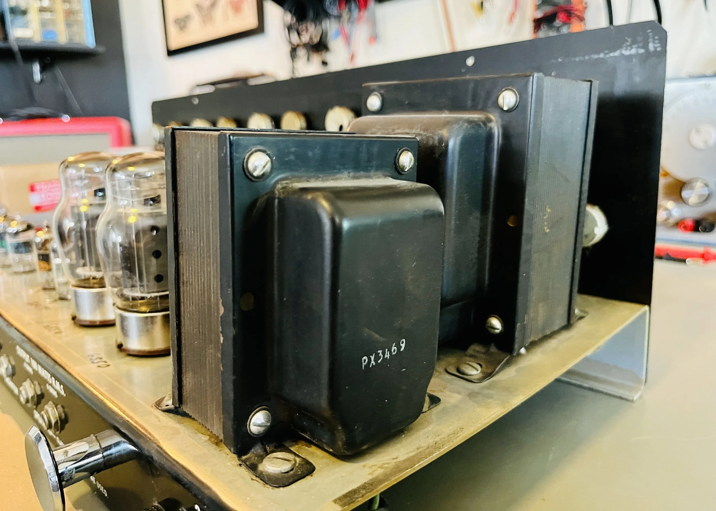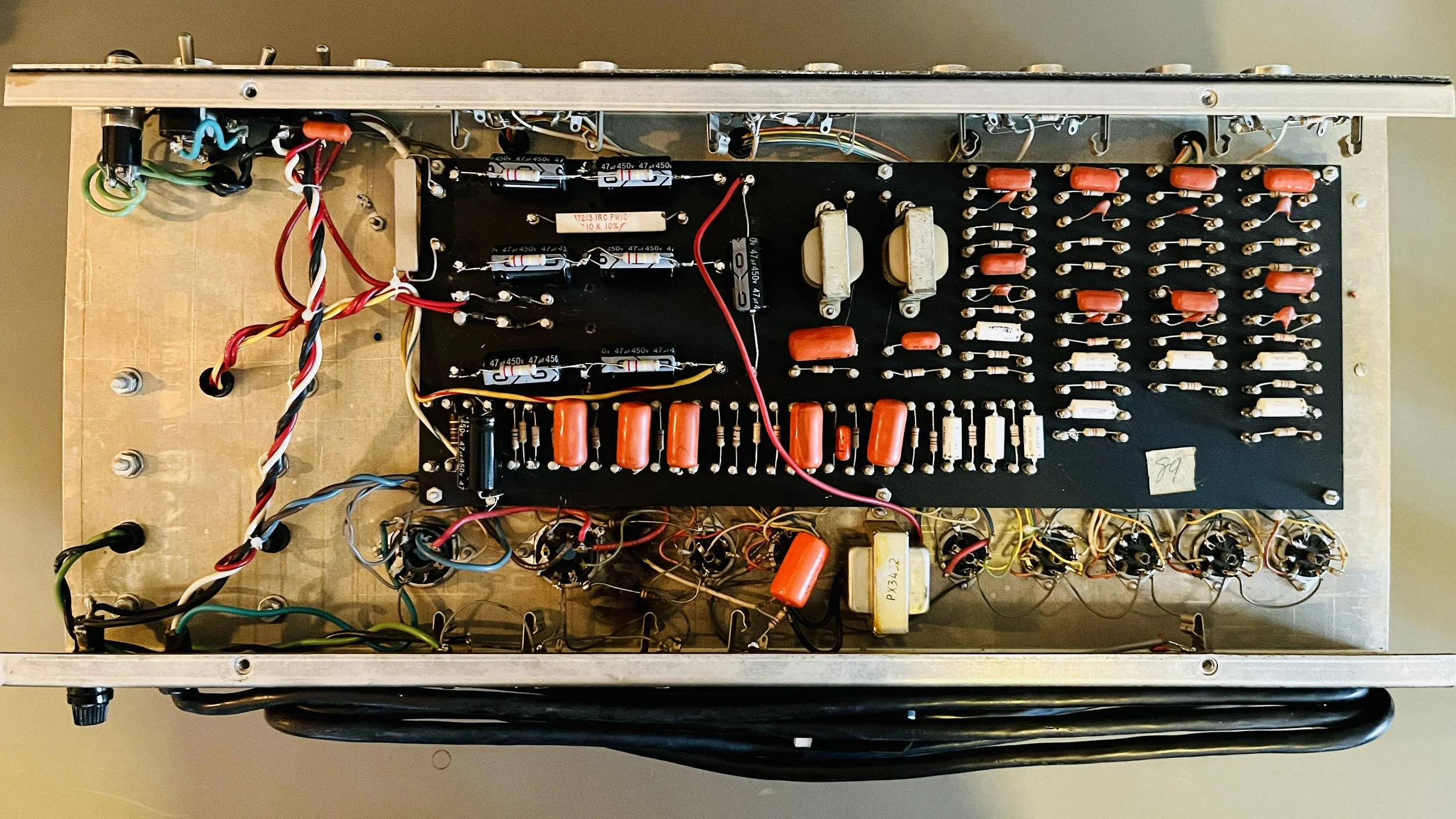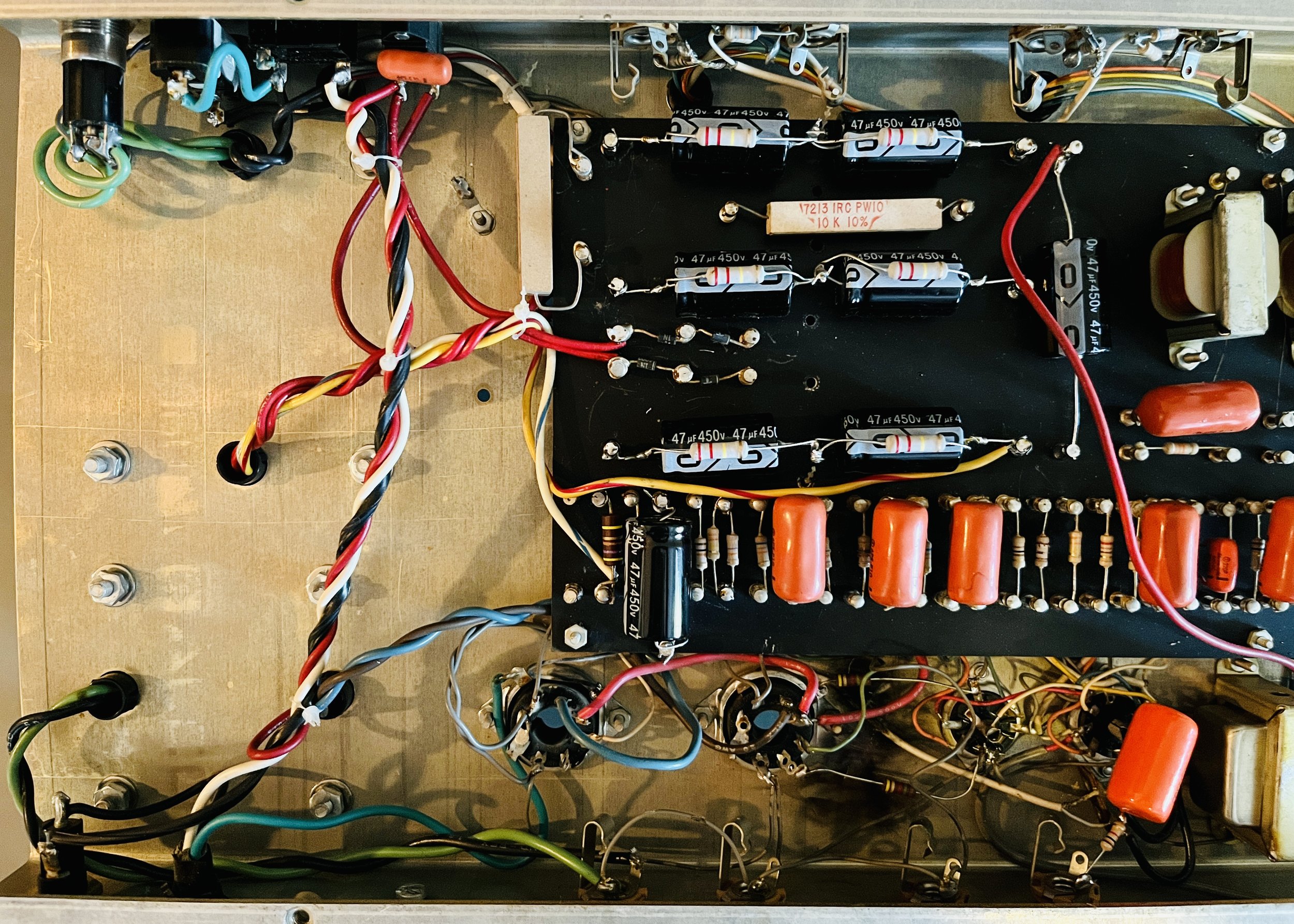 The original tubes did not all test good and were partially replaced with NOS units for a complete lineup of tubes from the same era as the amp. V1-V3 = Amperex 7025, V4 = NOS Sylvania (Baldwin Reprint) 12AX7, V5/V7 = NOS JAN 12AT7WC, V6 = Amperex 7025, V8-V9 = Tungsol (Magnavox Reprint) 6550 Matched Pair. These tubes were picked for best tone, and reliability. The 6550’s Fixed Bias was set to a conservative %46 Class AB Plate Dissipation with a B+ of 575VDC. The tube sockets were all re-tensioned and were then treated with De-Oxit to remove/prevent corrosion. The pots were sprayed out and the amp was cleaned inside and out. Amp now sounds great.