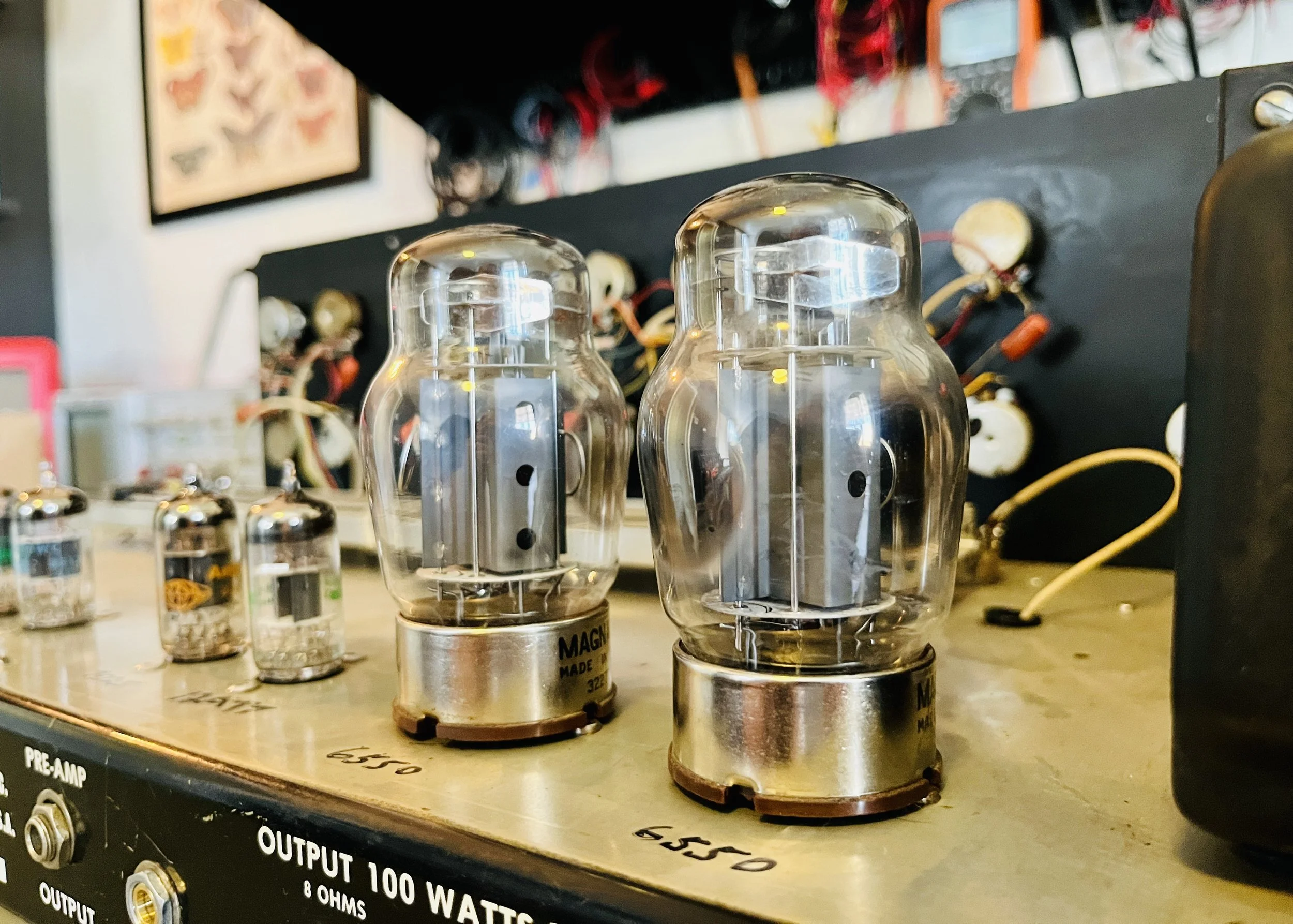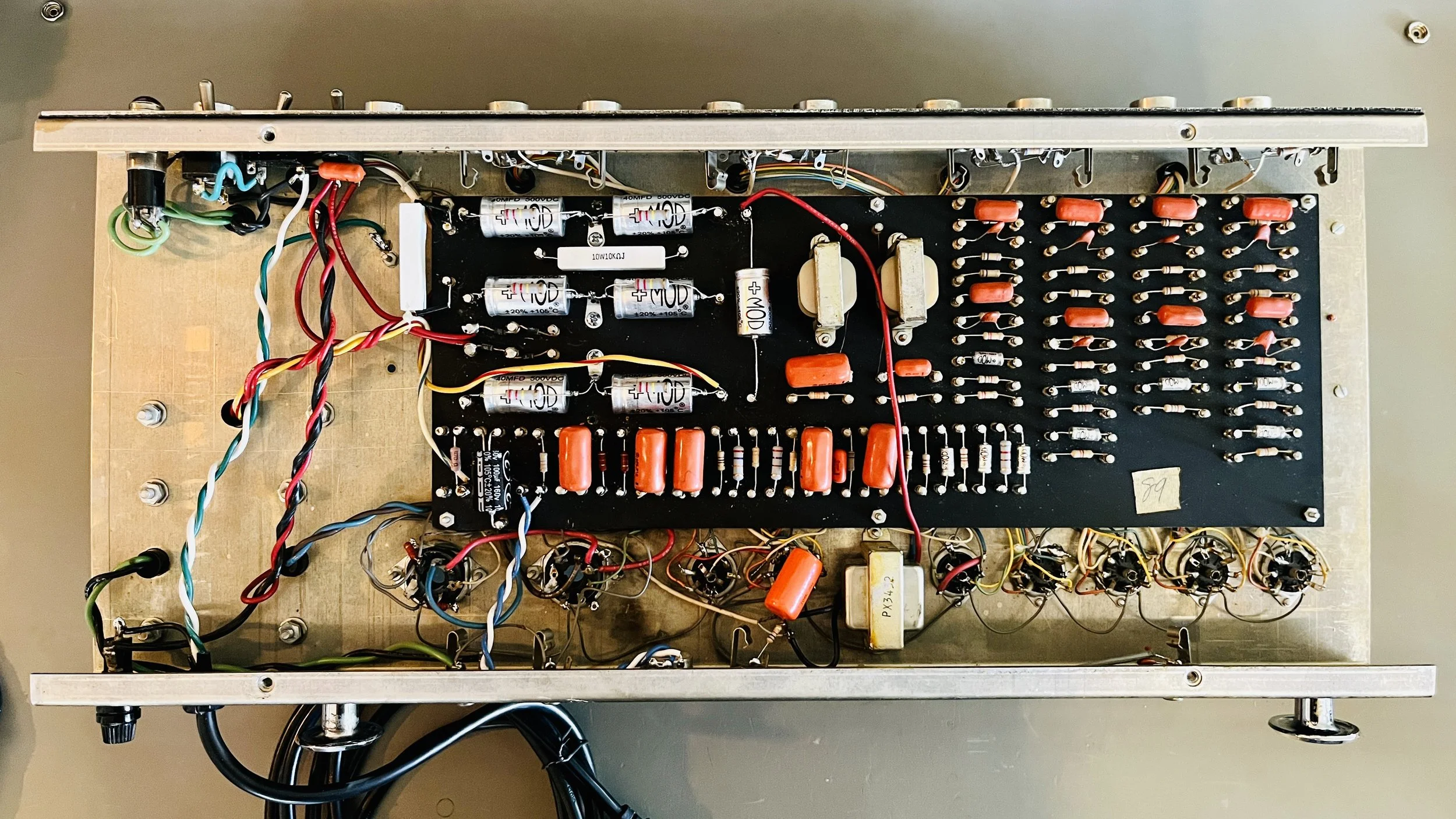 The VT-100A is actually an all-tube PA amplifier that was marketed at bands looking to amplify their vocals and mic signals - hence the “Vocal Sound System” printed on the front. Despite the marketing and name, it is really just a fairly conventional guitar/bass amp circuit and has little to do with traditional circuit design for microphones/PA systems - at least the low-impedance input modern PA systems we think of today. Marshall, Fender, and Sound City amongst others, all made amps like these that were essentially multi-channel versions of their most popular guitar amps. These amps sound great with guitar, bass, and electric keyboards/synths. Ironically vocals are the thing they work the least well with (for live playing anyways) although they hold their own in a recording context. The whole design is actually closest to the 1970’s Fender Twin Reverb (CBS 100 Watt). It has 4 separate but identical preamps (each with their own tone and reverb controls) that get mixed down into a mono power amp. The preamp utilizes five 12AX7’s, and two 12AT7’s, with a Fender style tube driven Spring Reverb, high impedance inputs, and Baxandall tone stacks. These tone stacks are from the Hi-Fi world of audio engineering and are quite different from the FMV (Fender, Marshall, Vox) tone stacks that most guitarists are familiar with. They have a flatter frequency response at mid level but are far more versatile for an amp designed for multiple instruments and vocals. The Baxandall tone stack can also be found in almost all Ampeg amps including the V4, B15, and SVT. The power amp sports two 6550 power tubes putting out 100 watts RMS. This power amp is the other main difference from the Fender Twin similarity - 6550’s are massive power tubes with 40% more power than a 6L6GC at 42 watts max plate dissipation. This makes the amp sound more like an Ampeg or Hiwatt once it starts pushing hard.