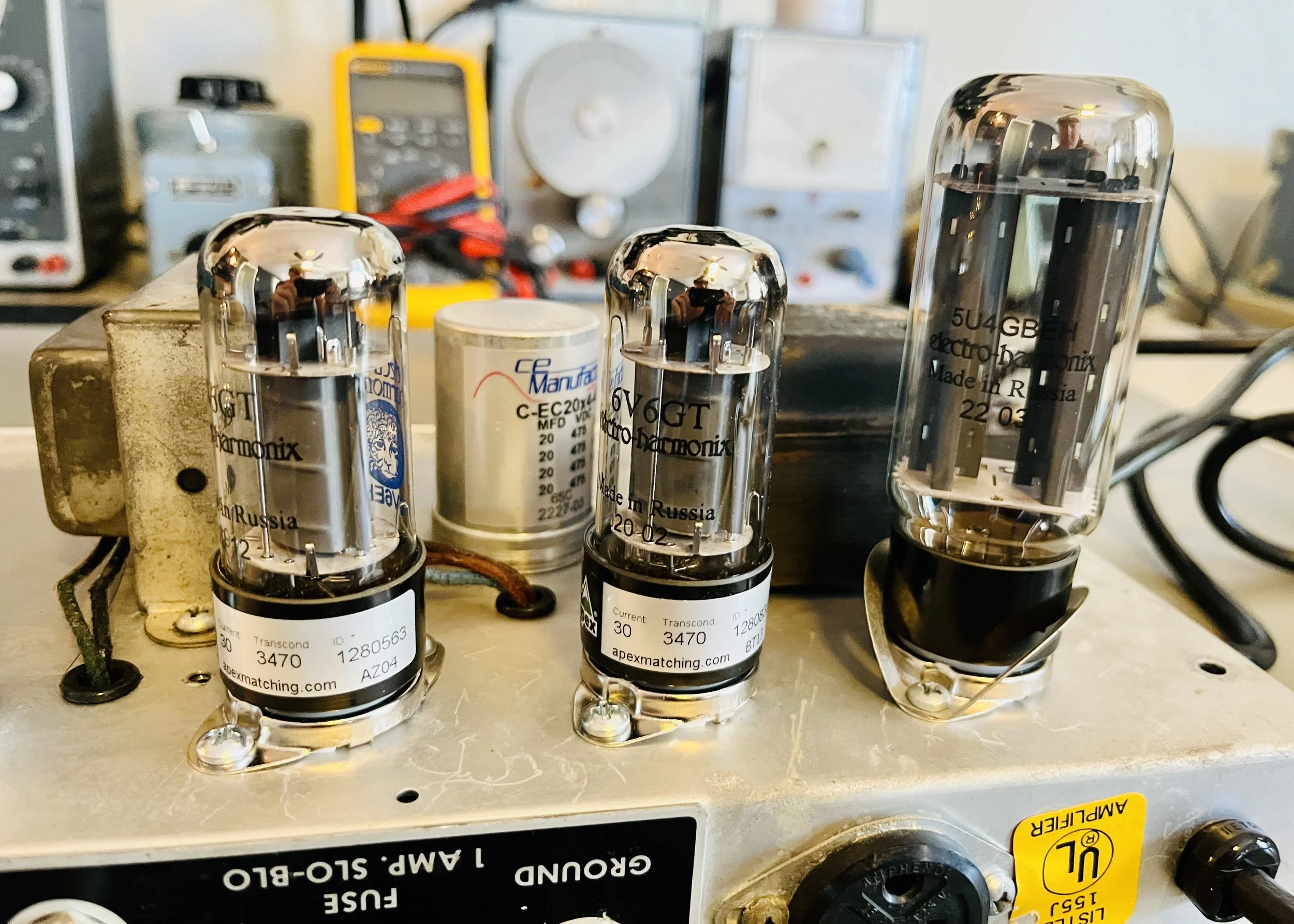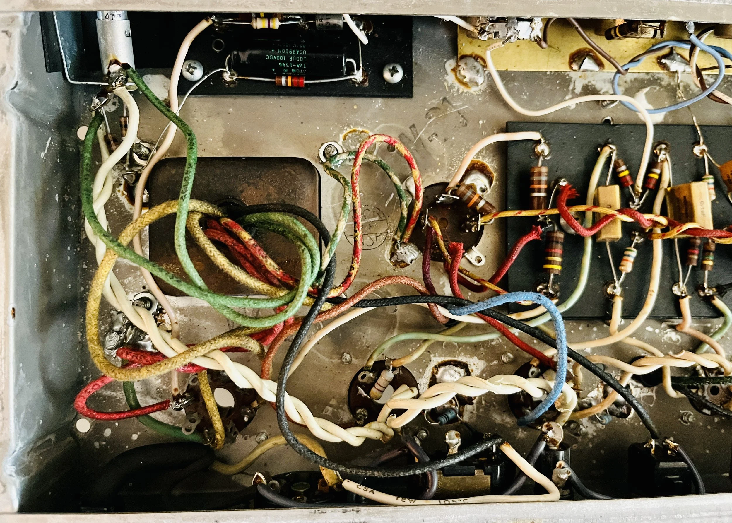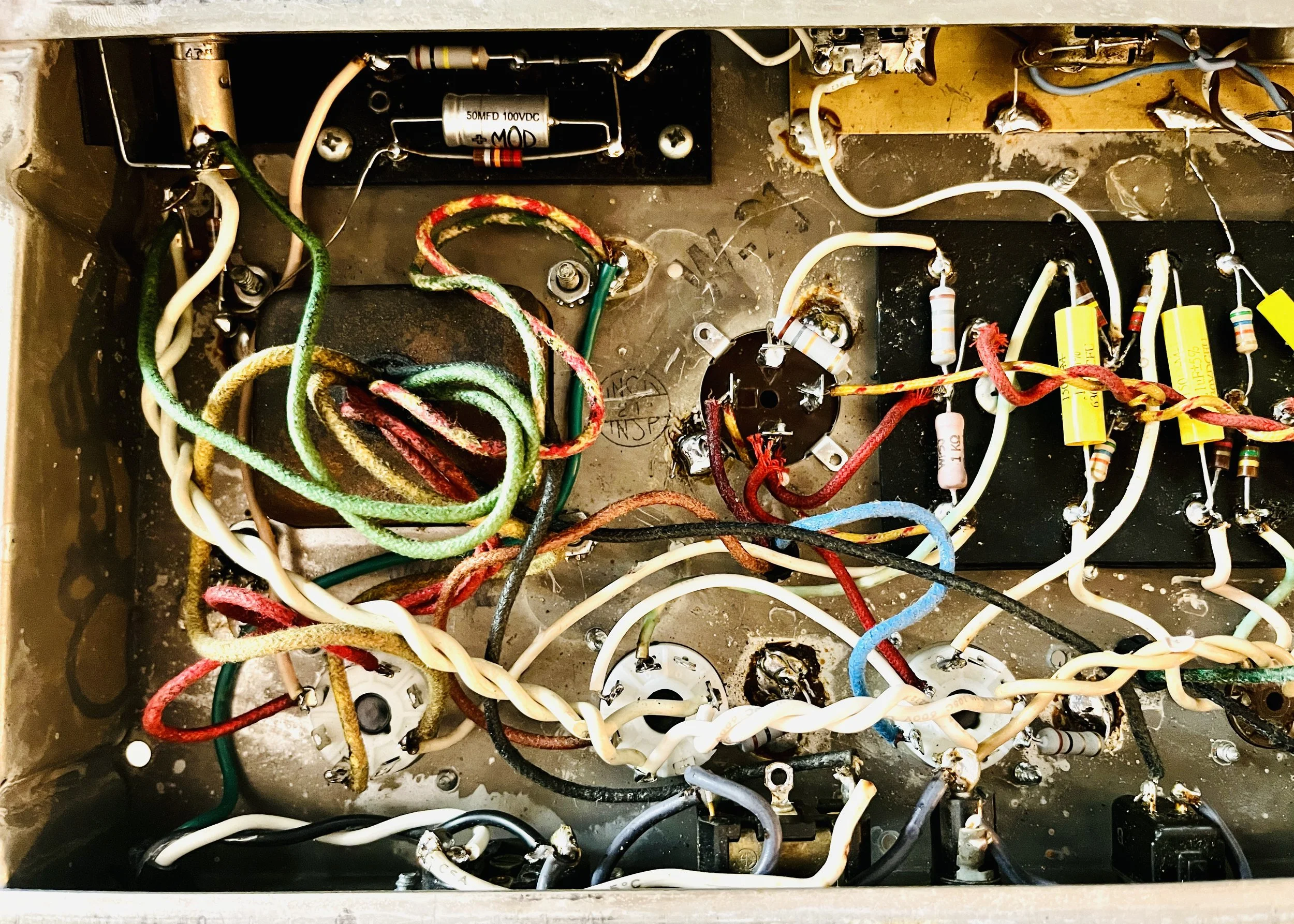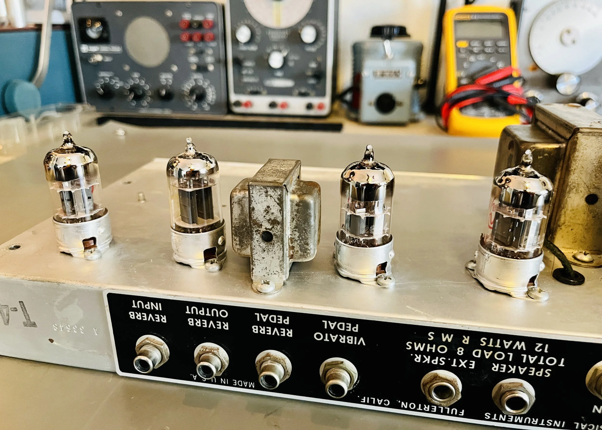 The original tubes (a mix of NOS and new) did not test good and were all replaced. V1 = JJ 12AX7MG, V2 = EHX12AT7, V3 = JJ 12AX7S, V4 = JJ 12AX7MG, V5-V6 = EHX 6V6GT, V7 = EHX 5U4GB. These tubes were picked for best tone and reliability. The 6V6GT’s Fixed Bias was set to %60 Class AB Plate Dissipation with a B+ of 372VDC. The octal tube sockets were all replaced and re-wired to stop the tubes from jiggling or falling out while they hang upside down and because of broken pins internally that were damaged by previous attempts at repair. The pots were sprayed out and the amp was cleaned inside and out. Amp now functions perfectly.