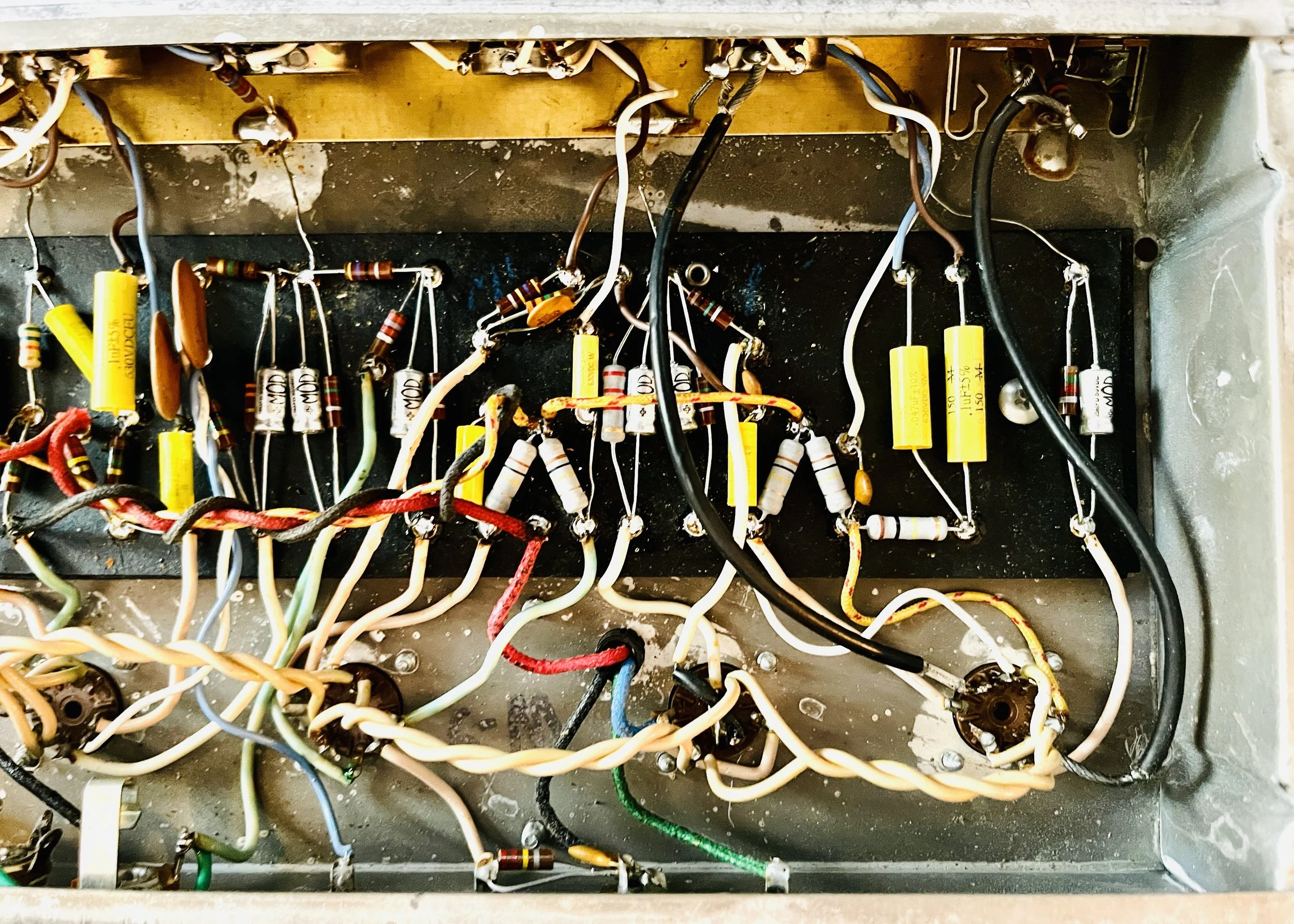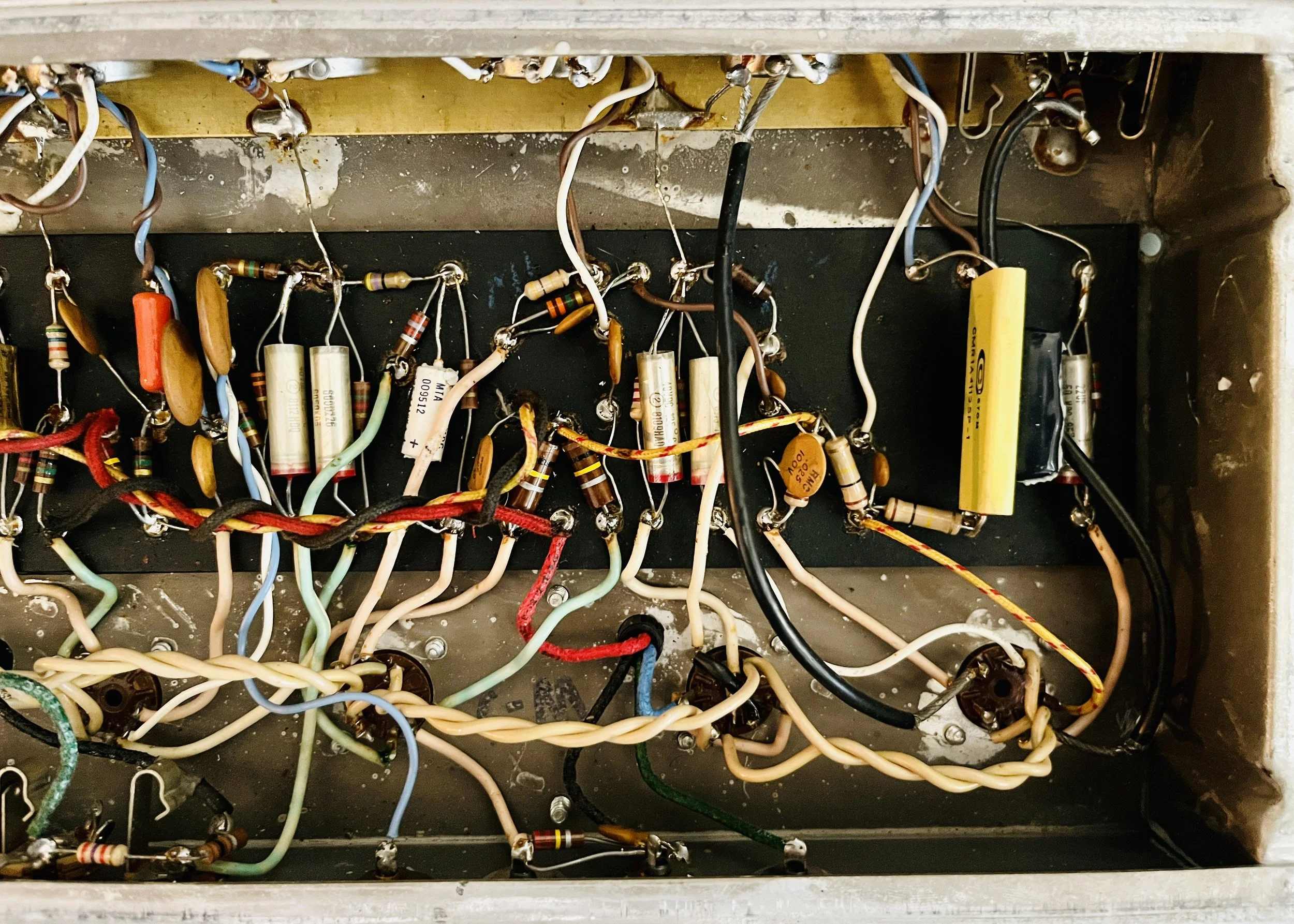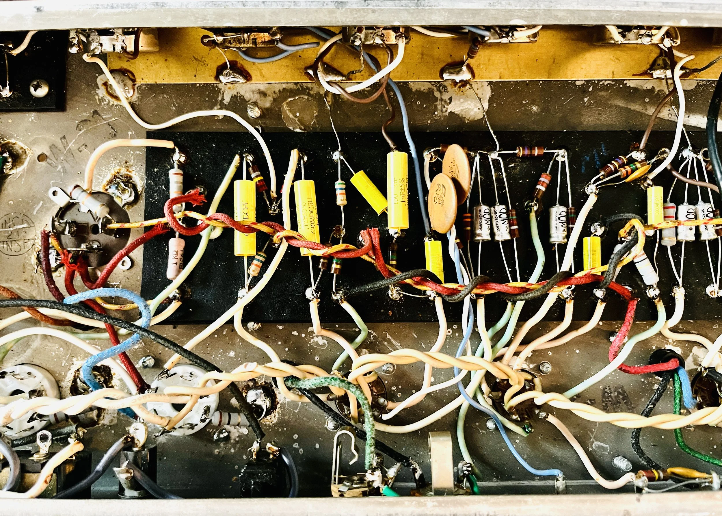 The amp was completely restored. The electrolytic cap can was replaced with a new USA made CE brand exact replica for the filter section. The bias circuit and bypass caps were replaced with a 1N4007 1000v Diode and MOD brand electrolytics with upgraded voltage and temperature ratings. New 2 Watt Metal Oxide/5 Watt Cement power dropping resistors were installed for better reliability and lower noise floor. The same was done for all the preamp plate resistors and some cathode resistors. All of the coupling capacitors were replaced with Mallory 150 630v film type units - the coupling caps present in the amp were almost all replacements and not at the correct voltage ratings. They are also far better quality capacitors for this circuit, they made the amp sound much smoother and gave it some tonal magic. A new 3 prong AC cord was installed to replace the old AC cord and the death cap was removed. The ground switch was also deactivated for safety.