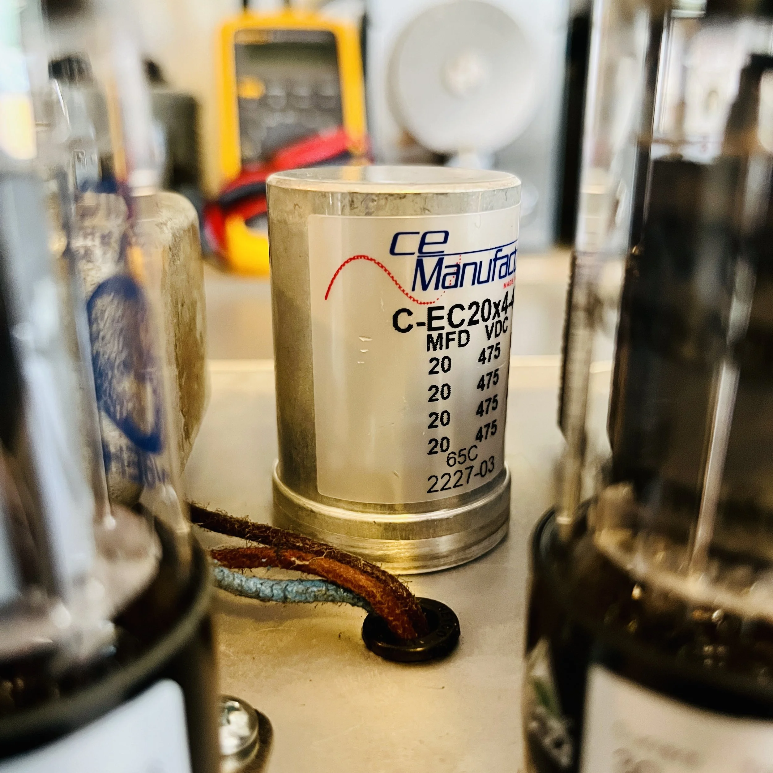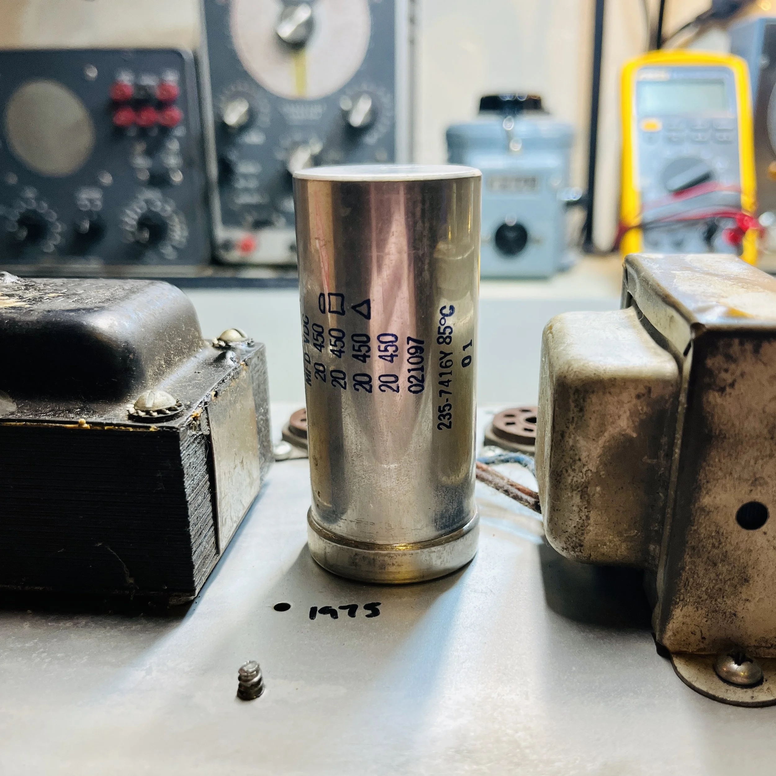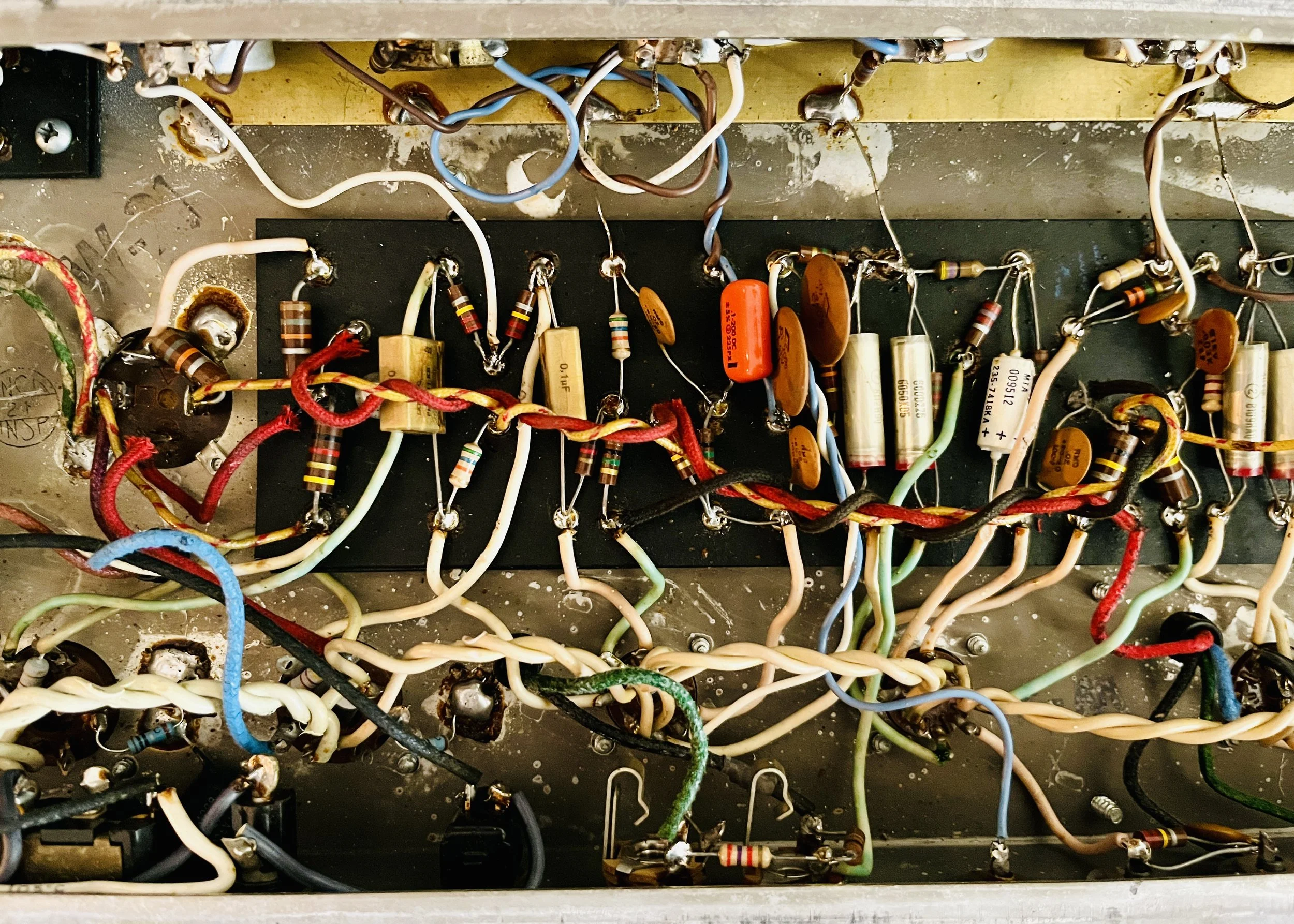 The amp was completely restored. The electrolytic cap can was replaced with a new USA made CE brand exact replica for the filter section. The bias circuit and bypass caps were replaced with a 1N4007 1000v Diode and MOD brand electrolytics with upgraded voltage and temperature ratings. New 2 Watt Metal Oxide/5 Watt Cement power dropping resistors were installed for better reliability and lower noise floor. The same was done for all the preamp plate resistors and some cathode resistors. All of the coupling capacitors were replaced with Mallory 150 630v film type units - the coupling caps present in the amp were almost all replacements and not at the correct voltage ratings. They are also far better quality capacitors for this circuit, they made the amp sound much smoother and gave it some tonal magic. A new 3 prong AC cord was installed to replace the old AC cord and the death cap was removed. The ground switch was also deactivated for safety.
