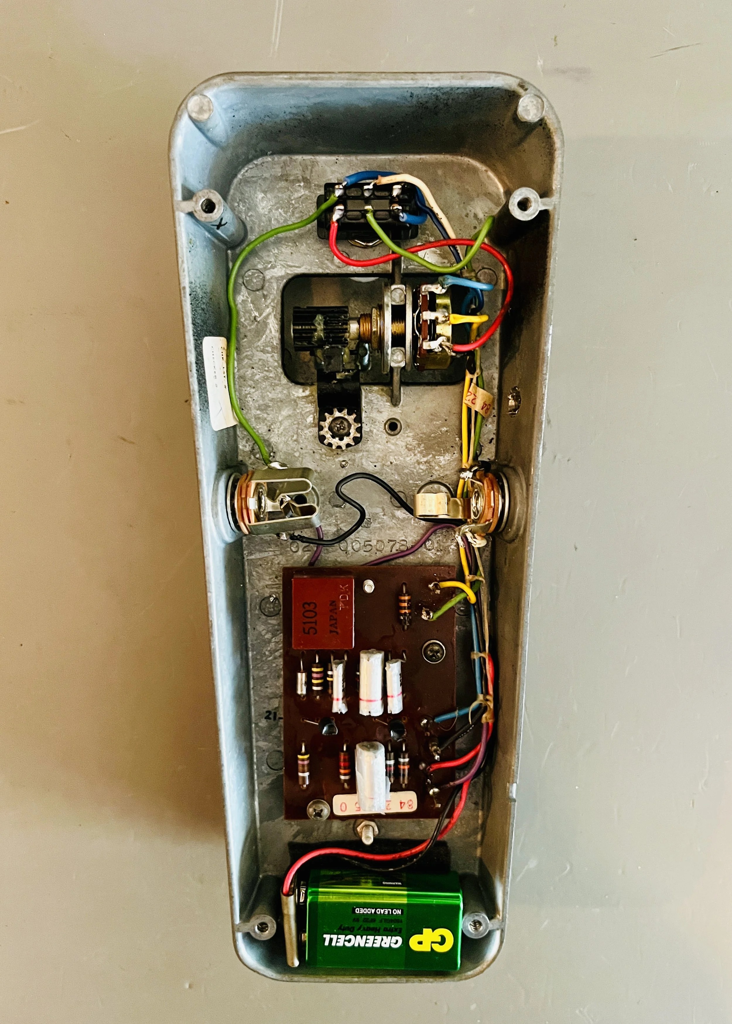 A new vintage replica Dunlop brand DPDT wah foot-switch was installed and wired in True-Bypass. The incorrectly installed DC jack and all associated wiring was taken out and covered with a snap in chassis hole cover - all other wiring was cleaned up. Installed DC jacks cannot just be put in a vintage pedal with no power filtering or diode protection circuits, which is why it was removed - the customer wanted battery only, rather than added parts/circuit complexity. The pot was cleaned out with De-Oxit and the rack and pinion setup was cleaned and then greased for smooth operation. A new felt pad was installed on the treadle opposite the foot-switch, and new rubber standoffs were glued in place on the ends of the treadle. The switch, standoffs, and felt pad were all height adjusted to provide the perfect amount of resistance/ease for switching ON and OFF. A new foam strip was glued in place for the battery to not wiggle around and come loose in the chassis - as the original had disintegrated. One of the screw holes in the cast metal shell had been completely stripped out and had to be drilled and re-tapped with 6-32 threads at a greater depth so the back panel could be unscrewed repeatedly for battery replacements in the coming years. That was easily most of the labor on this. A new set of rubber feet were installed with new high quality screws.