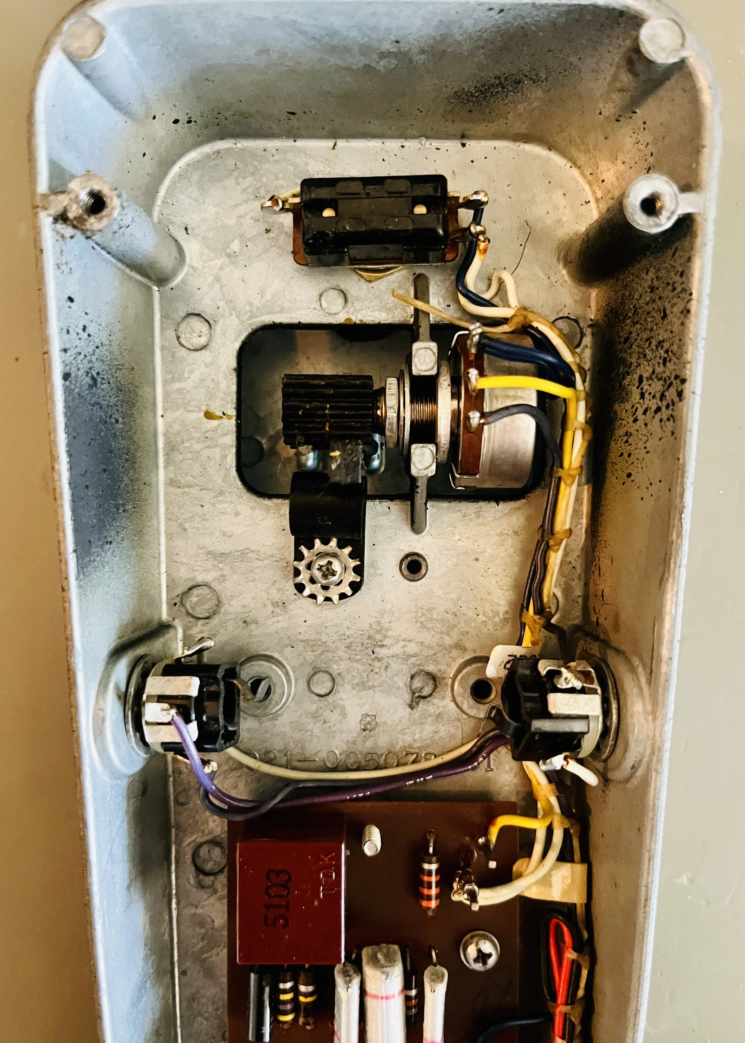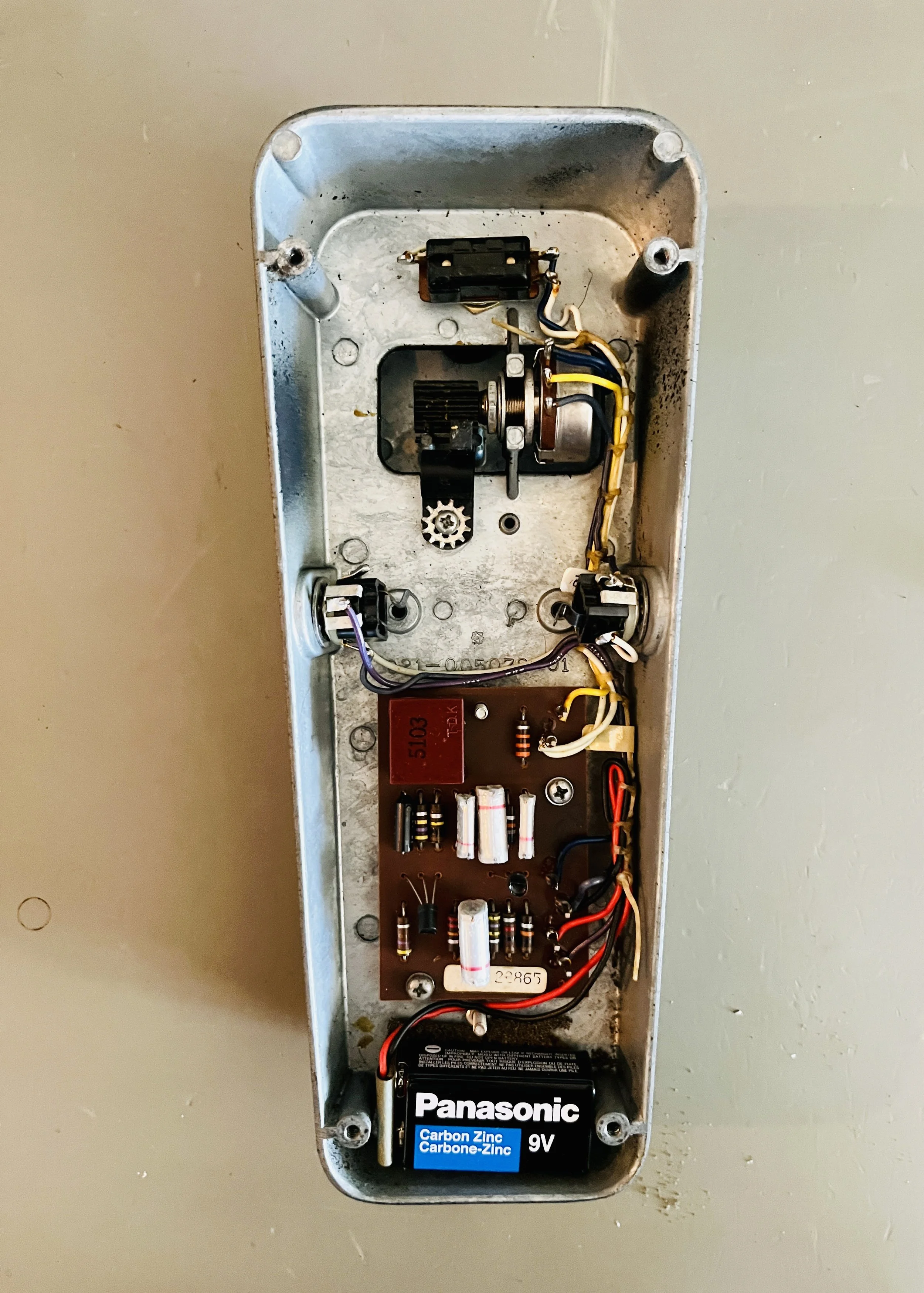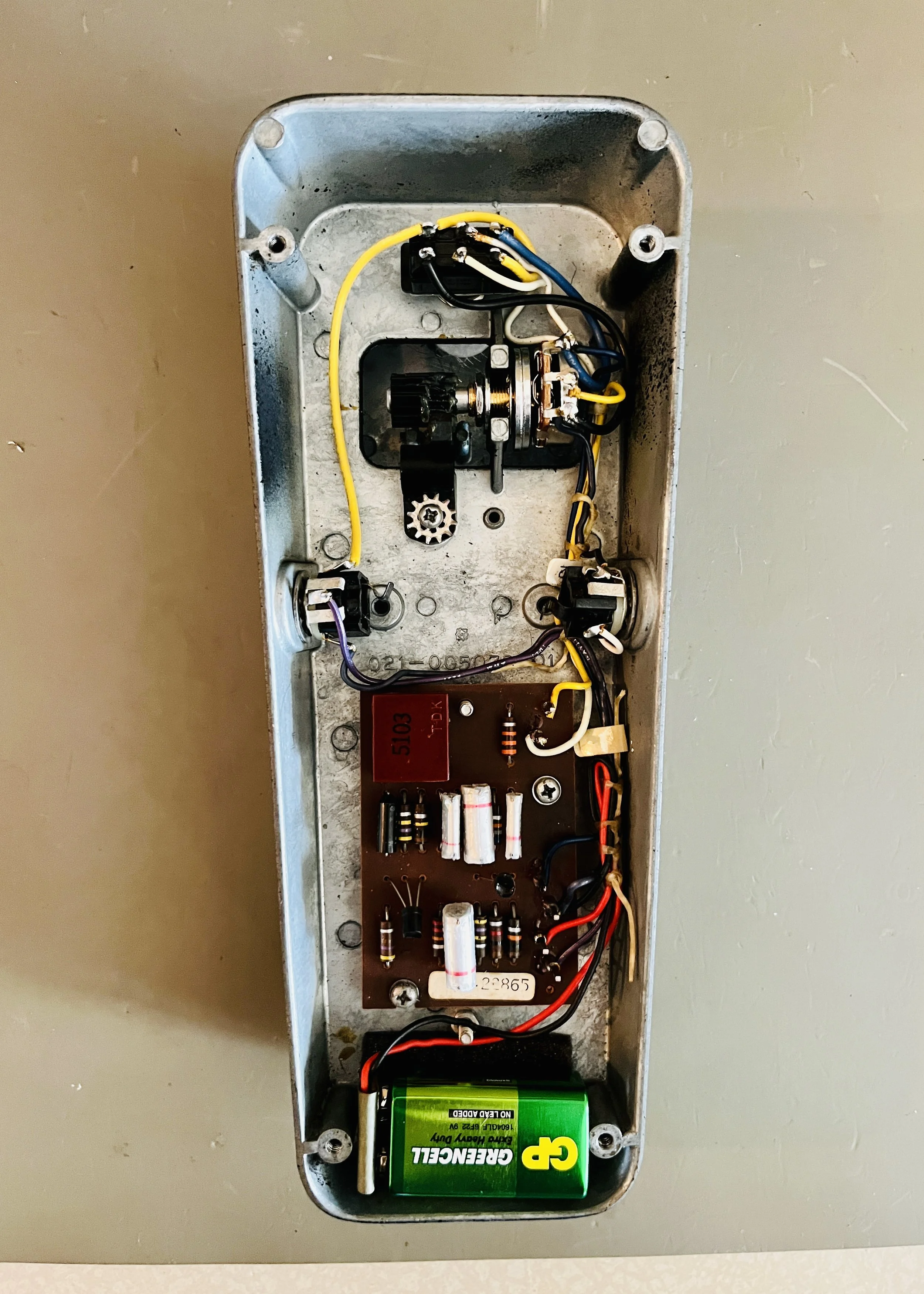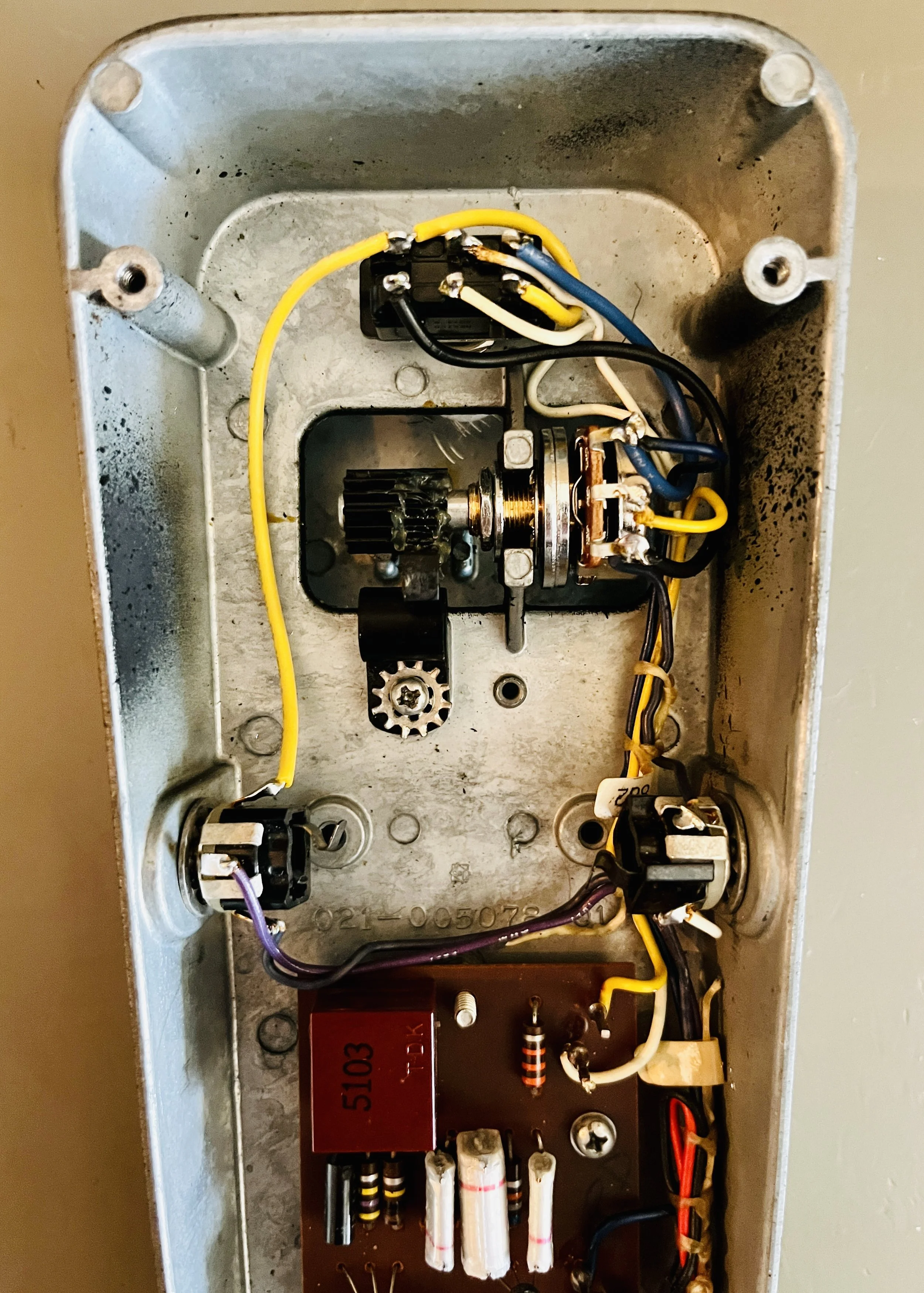 This pedal came in the shop in entirely original condition but was in bad mechanical shape - which is normal for the age of this wah. The customer wanted this restored to its best shape and to mod the pedal to have true bypass ON/OFF switching to avoid the tone-suck that came with these pedals from the factory. It was also very noisy which turned out to be a bad pot that the foot treadle controls.