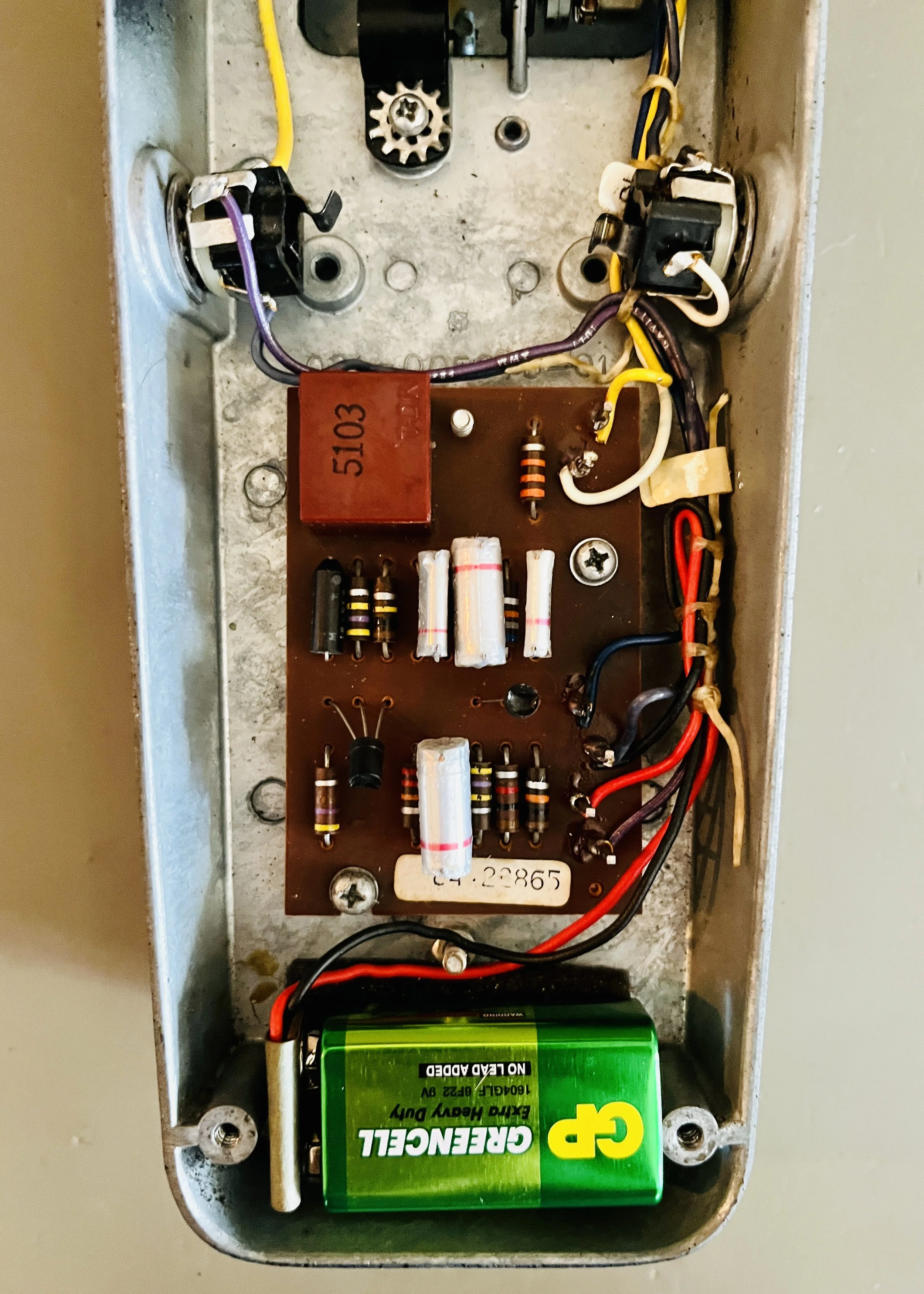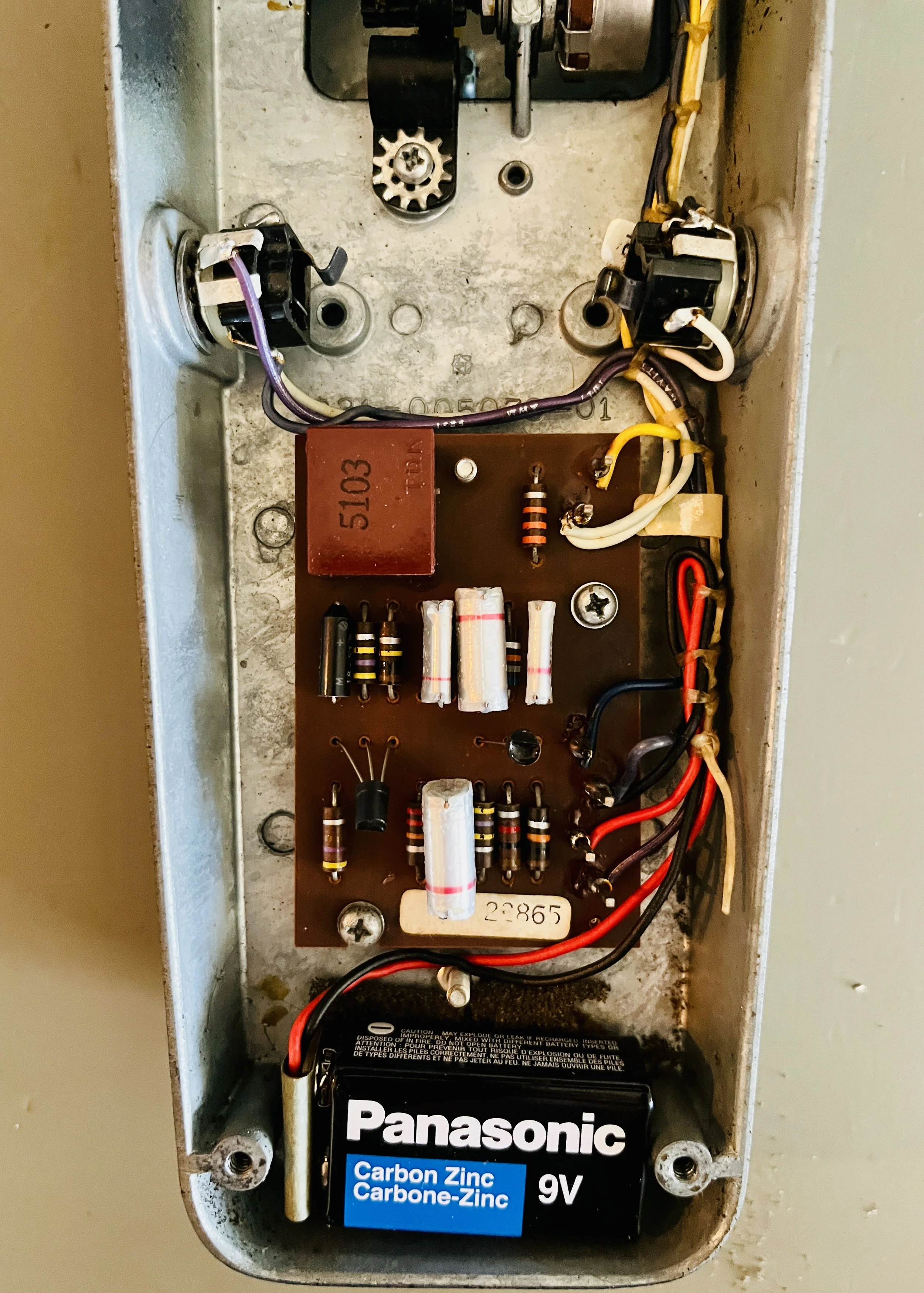 A new vintage spec correct Carbon-Zinc battery was installed to provide the right resistance to the circuit and give good vintage tone. Yes, there actually is an audible difference between modern Alkaline or Lithium-Ion batteries and the old style Carbon-Zinc batteries for the tone of certain simple analog circuits like Fuzz or Wah effects. This is because there is a difference in Ohmic Resistance that each battery provides to the power circuit which changes the bias on the transistors and therefore the sound. It now sounds great and operates smoothly with no obtrusive noise.
