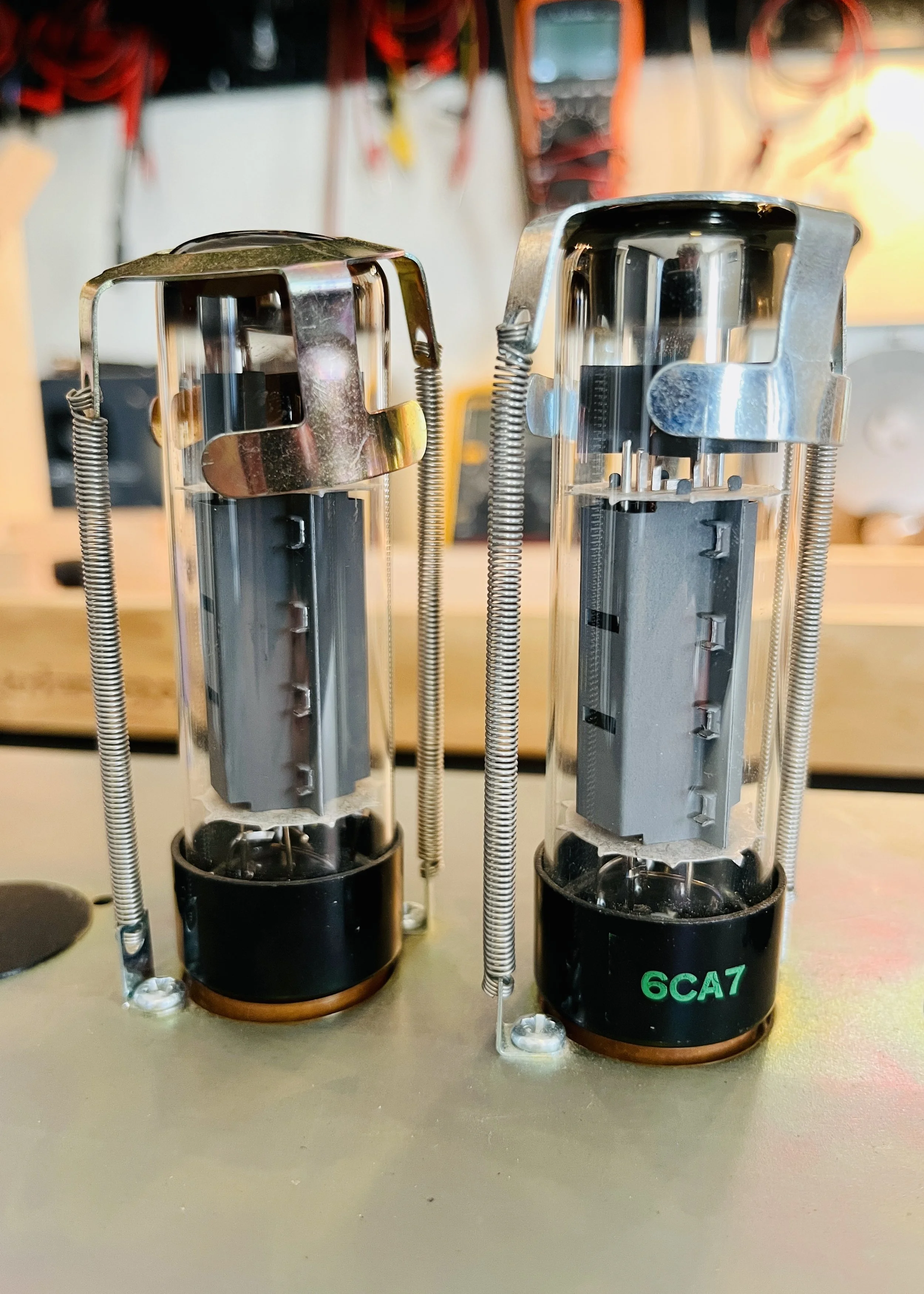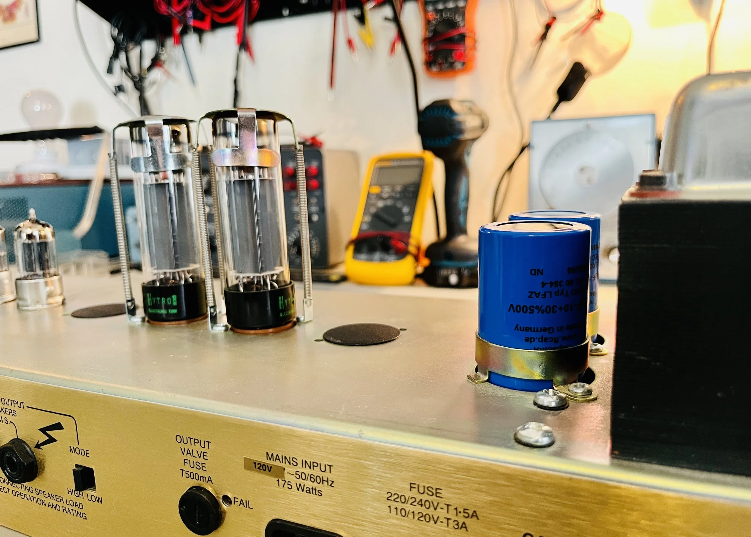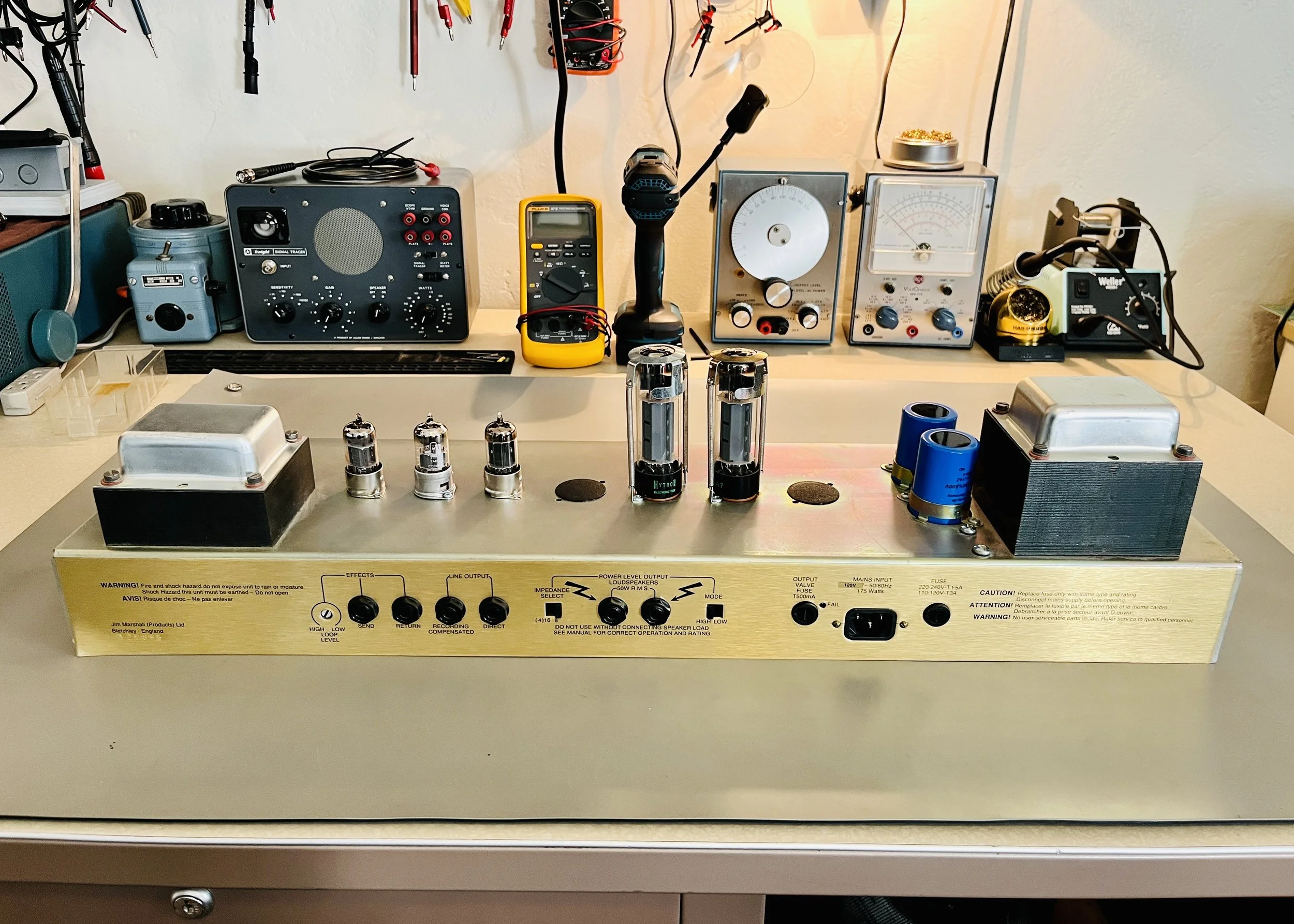 This amp needed a complete cap job in the power and signal sections, all new tubes, the bias C- voltage modded to provide correct biasing of the EL34/6CA7 power tubes and general cleaning + pots sprayed out (A lot!). Also the V2 tube socket had to be replaced with a new 9 pin socket of higher quality as the old one was dropping voltage to pin 8. The preamp sockets are riveted in place so I had to take my grinder to it for removal - fun stuff, thanks Marshall! The pots and sockets are a weak point of this series.