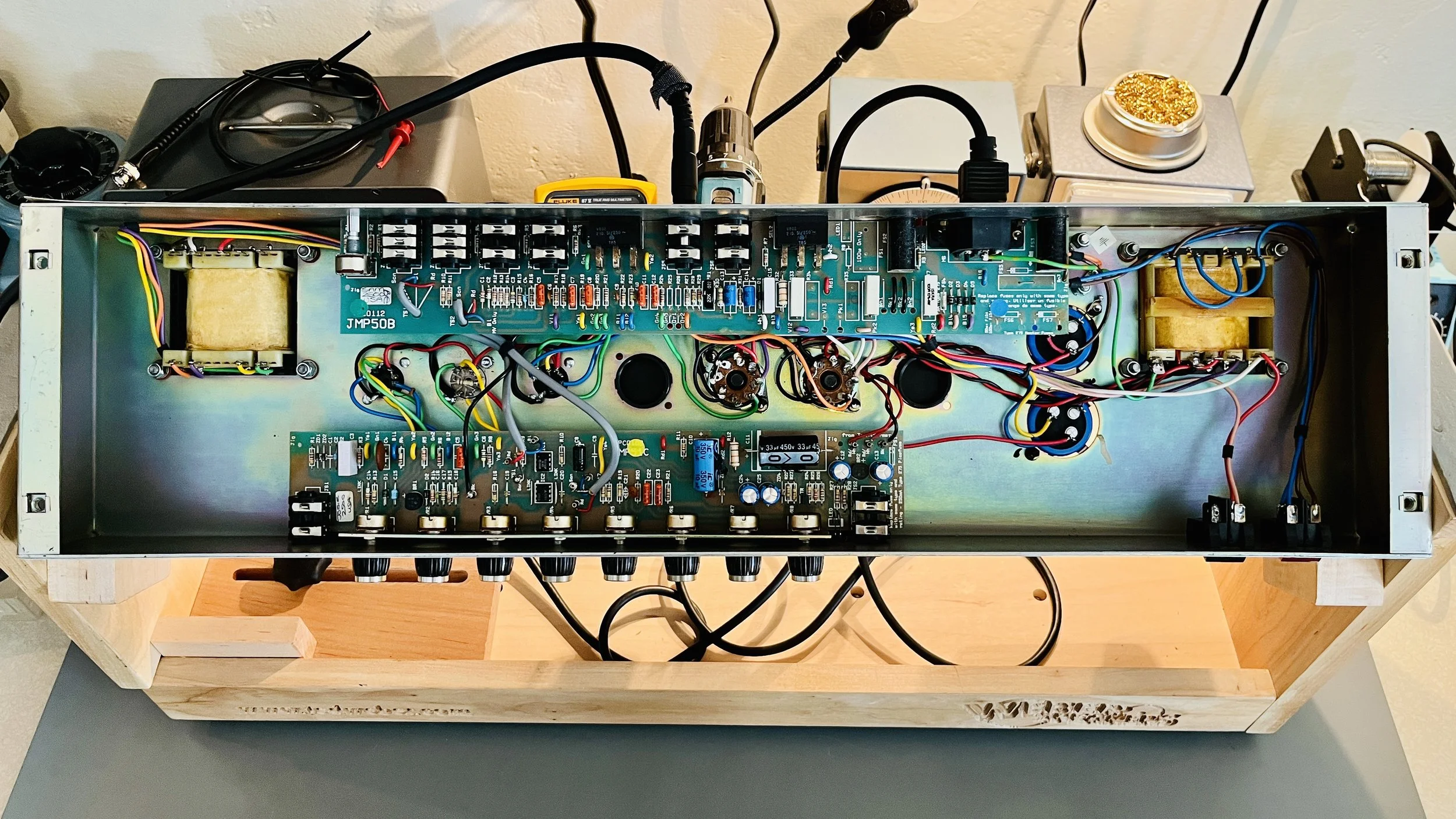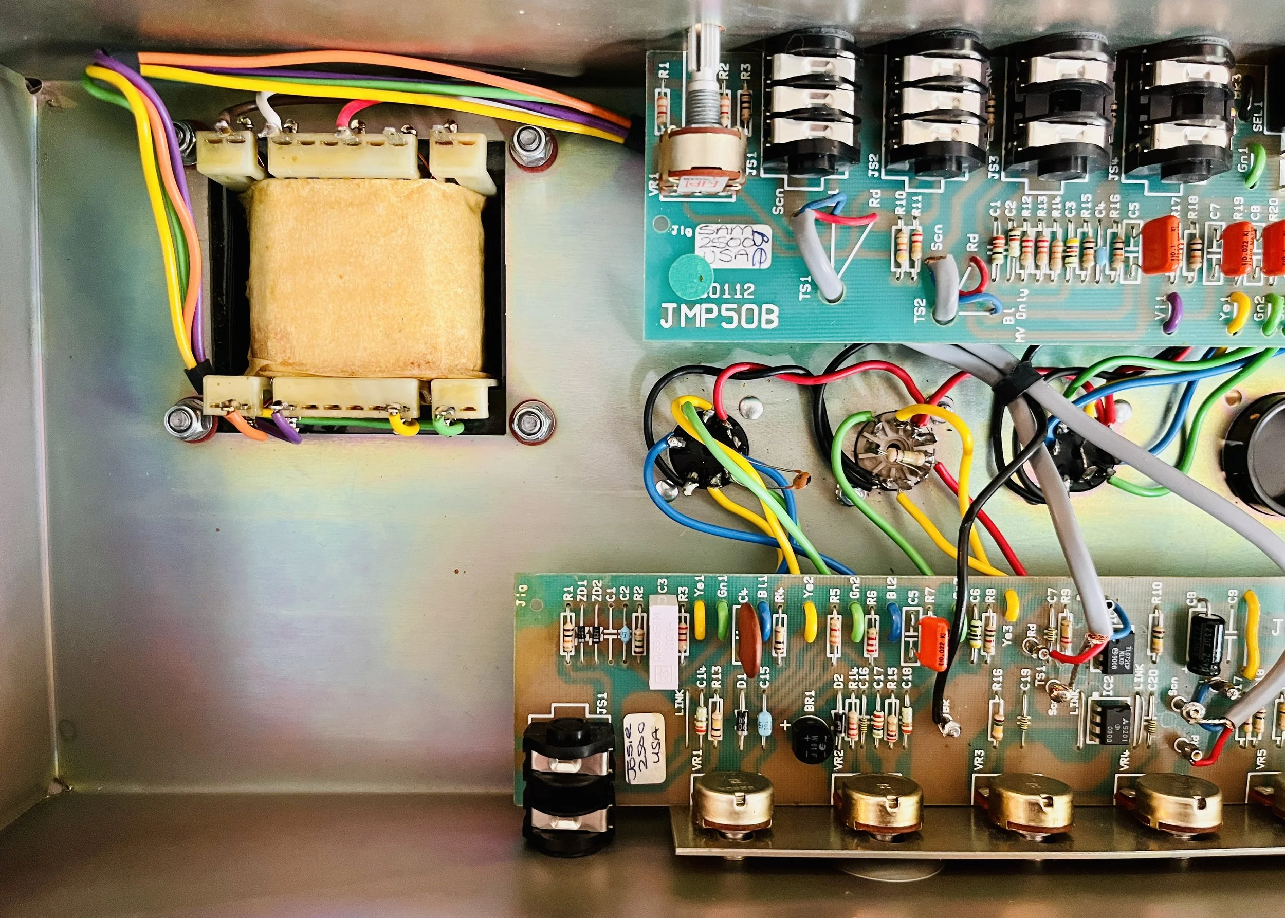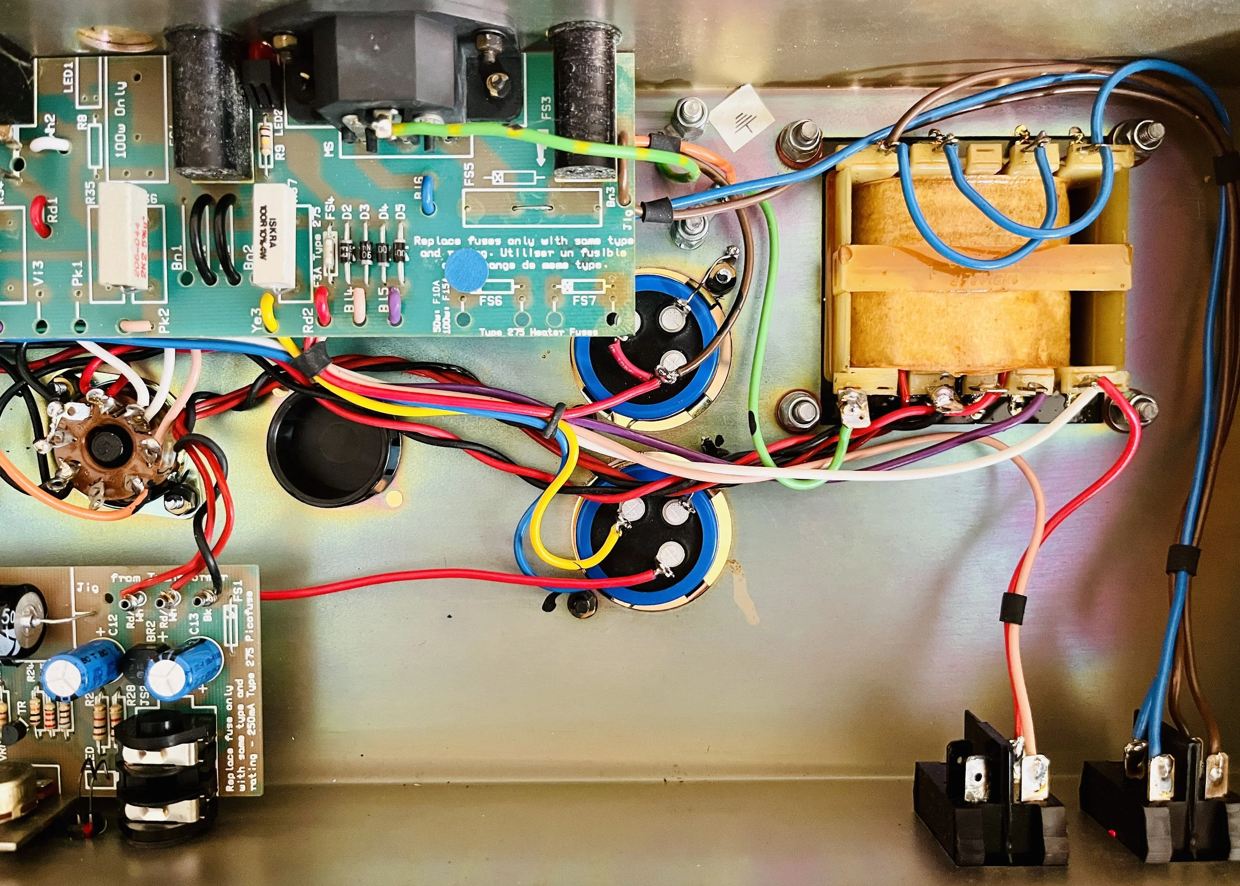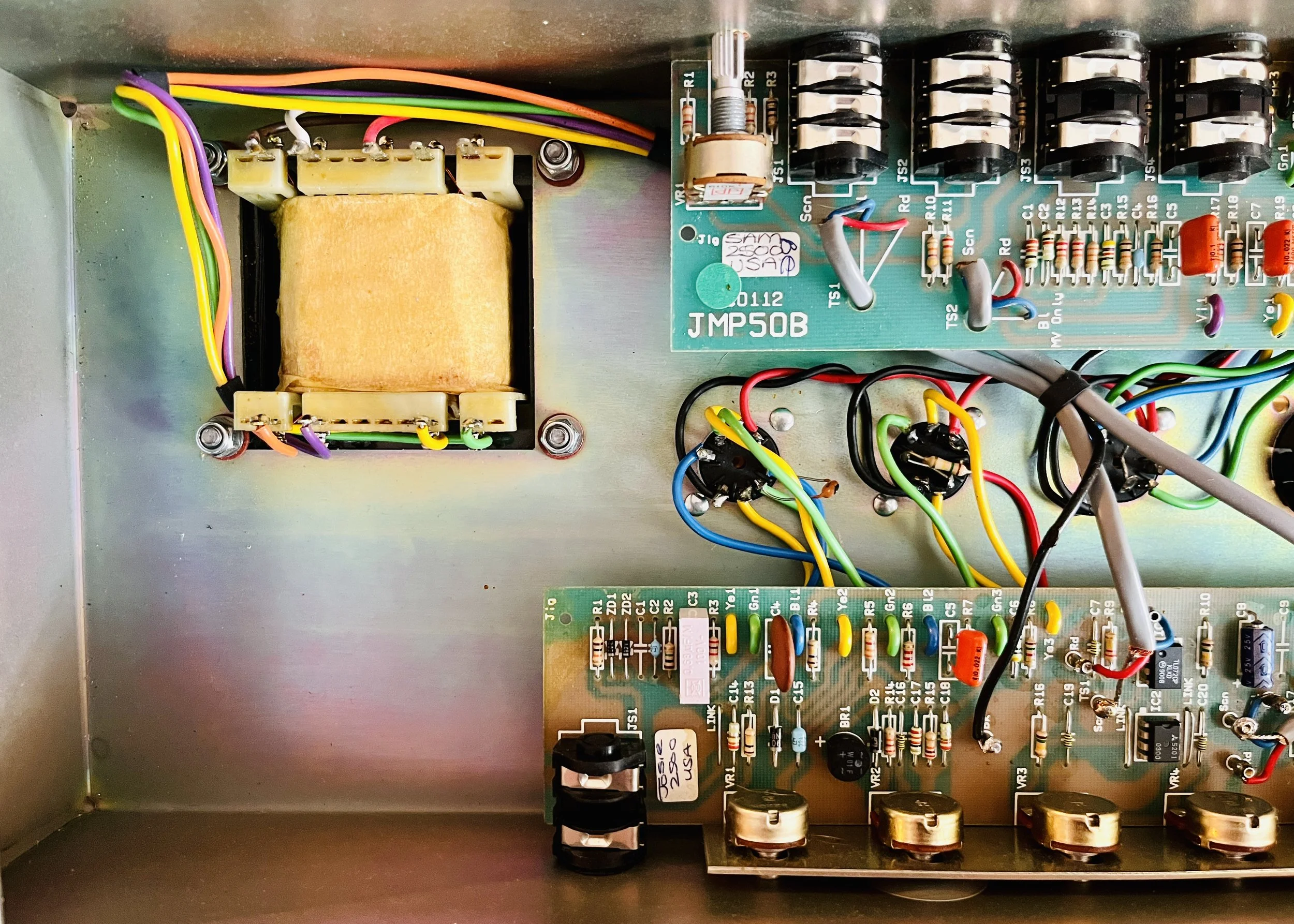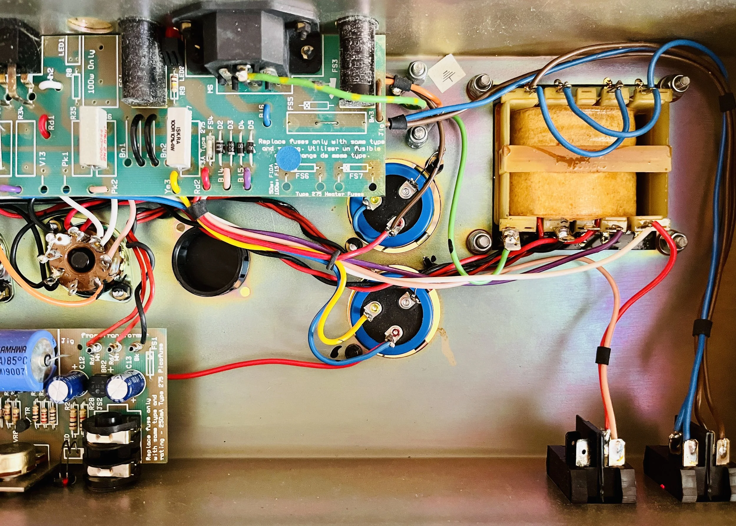 2 of the preamp tubes were NOS RCA blackplate and greyplate 12AX7’s, 1 TAD ECC83CZ selected for the cathode follower, and the power tubes were NOS CBS/Hytron 6CA7’s. The caps were a mix of Vishay, F+T, Sprague, IC, and CE brands. Finding all the correct values takes a number of different brands these days to get right. The Fixed Bias was set at %66 Class AB Plate Dissipation. This particular JCM 900 was the best sounding one I have ever heard.