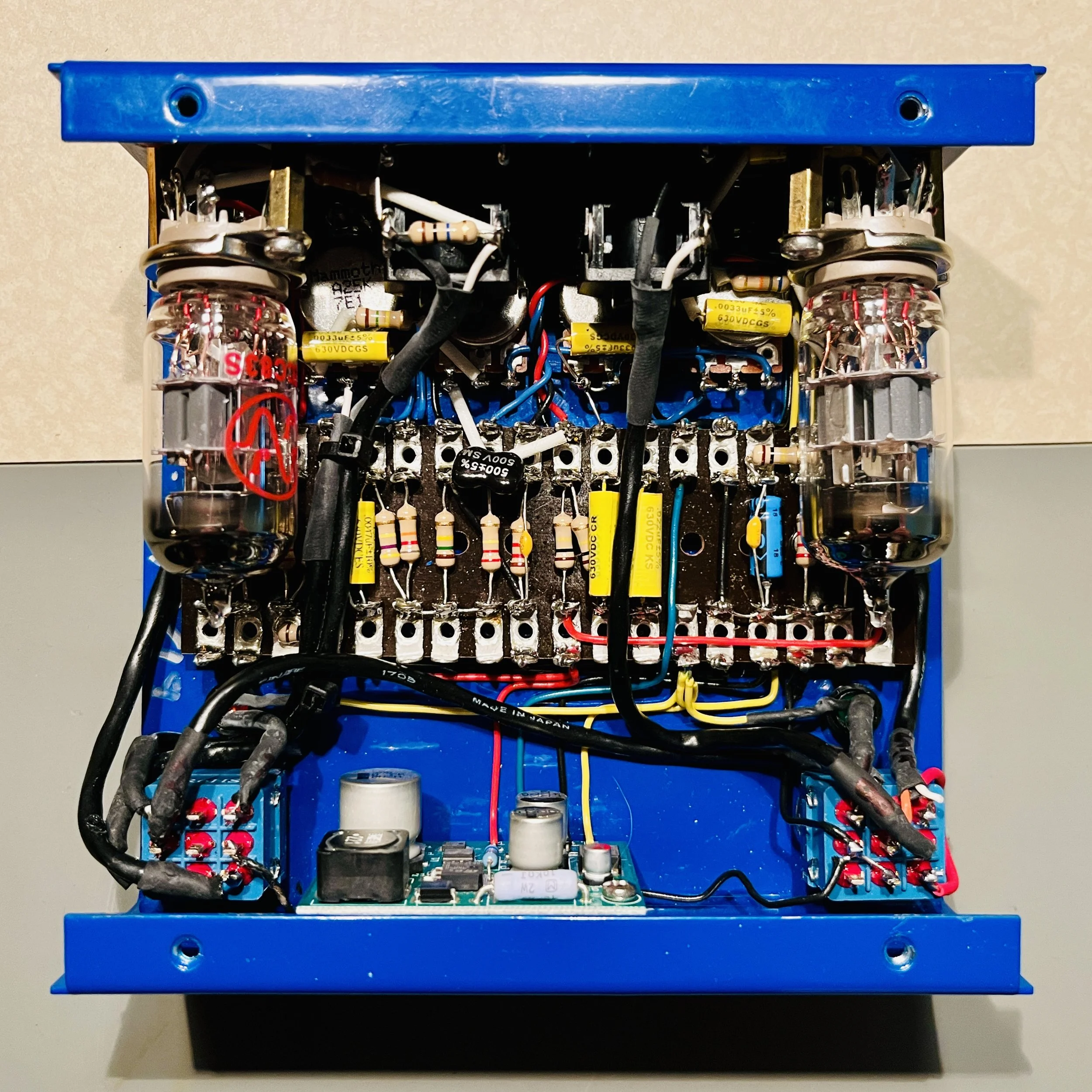 New high quality foot-switches were installed and all associated wiring/solder joints were re-done. The two slide switches were sprayed out with De-Oxit cleaner and actuated until working correctly. Two new 12AX7 preamp tubes were installed. The tubes chosen were both small plate 12AX7's for the least amount of microphonics - which is important on a pedal that will be stepped on and rattled often. V1 = JJ 12AX7S, V2 = TAD ECC83-cz. These tubes were picked for best tone and reliability specifically for this circuit. This pedal now functions like new.