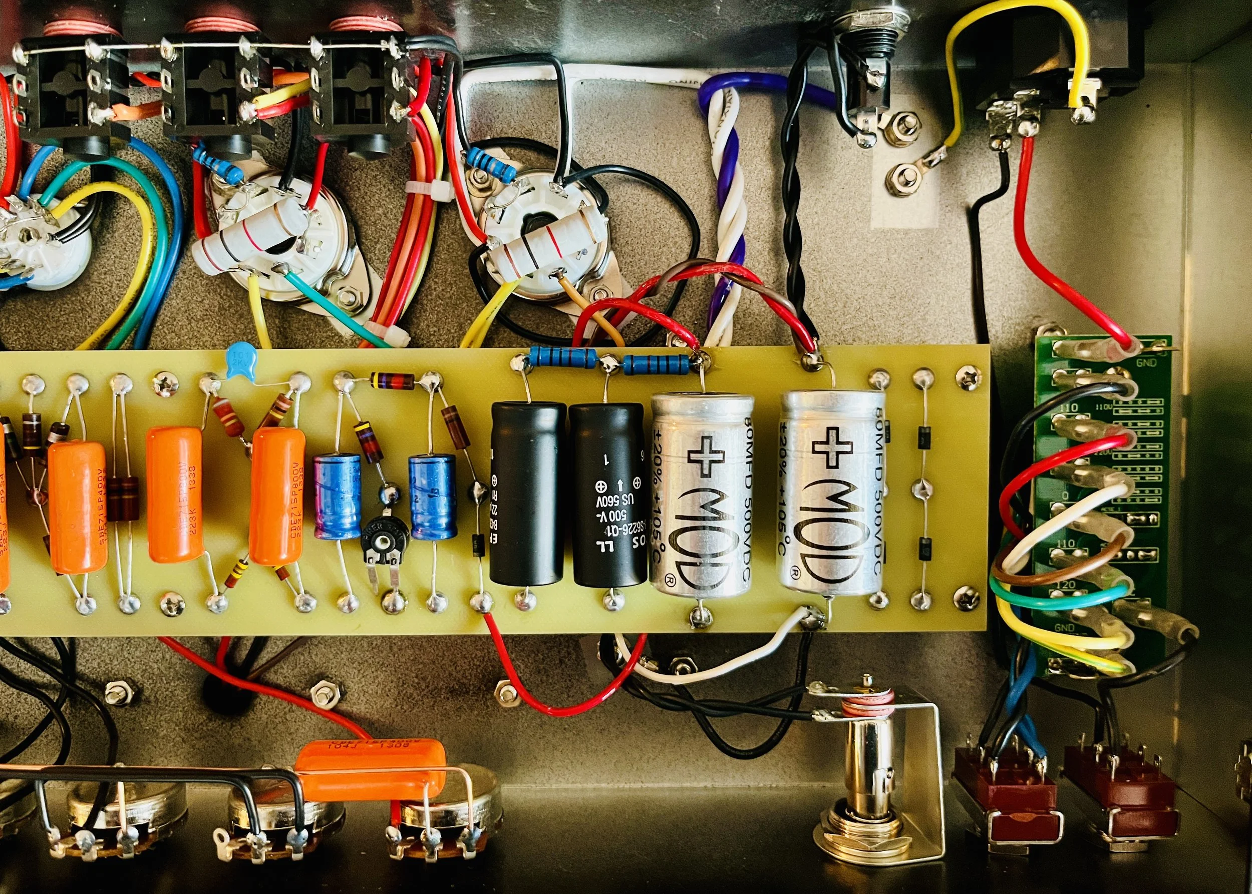 This is a handwired copy of the famous Marshall circuit of the same name. The amp had it’s original B+ and Screen filter capacitors failed open when received - as well as worn power tubes and V1 preamp tube due to stress from failed components. I’ve actually never seen an amp this new with failed filter caps. I suspect it was a bad batch of parts. This was the cause of all symptoms.